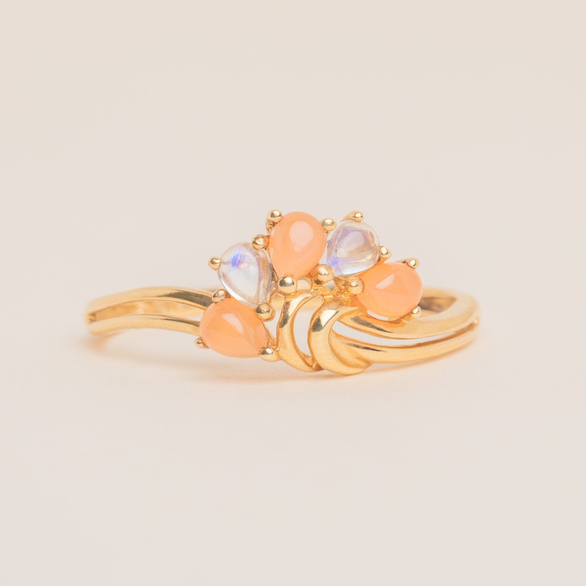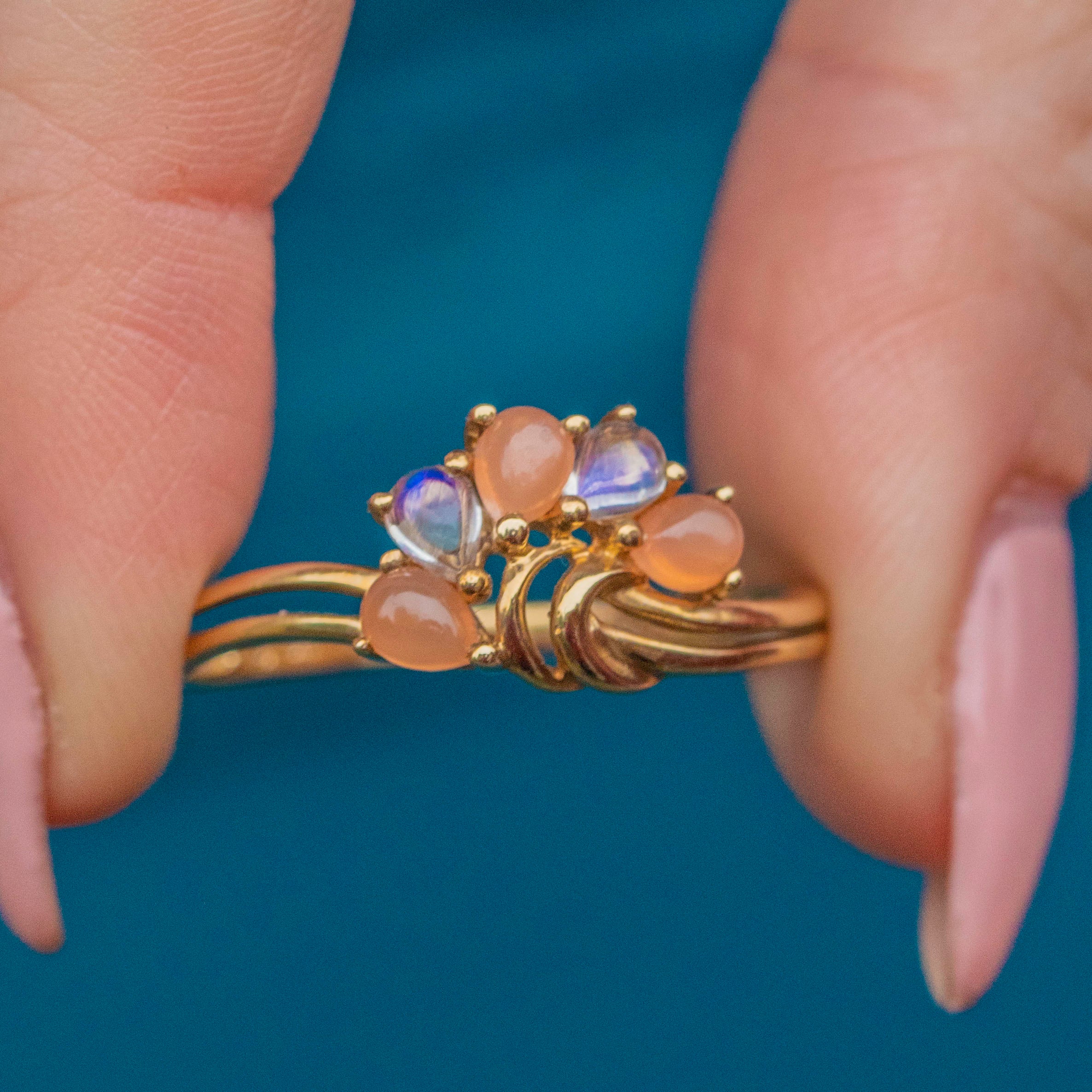 This exquisite 9ct Gold Moonstone & Chalcedony fan ring is a beautiful fusion of elegance and charm. With a unique fan design, this ring showcases a stunning combination of soft, glowing Moonstones and delicate peachy Chalcedonies.