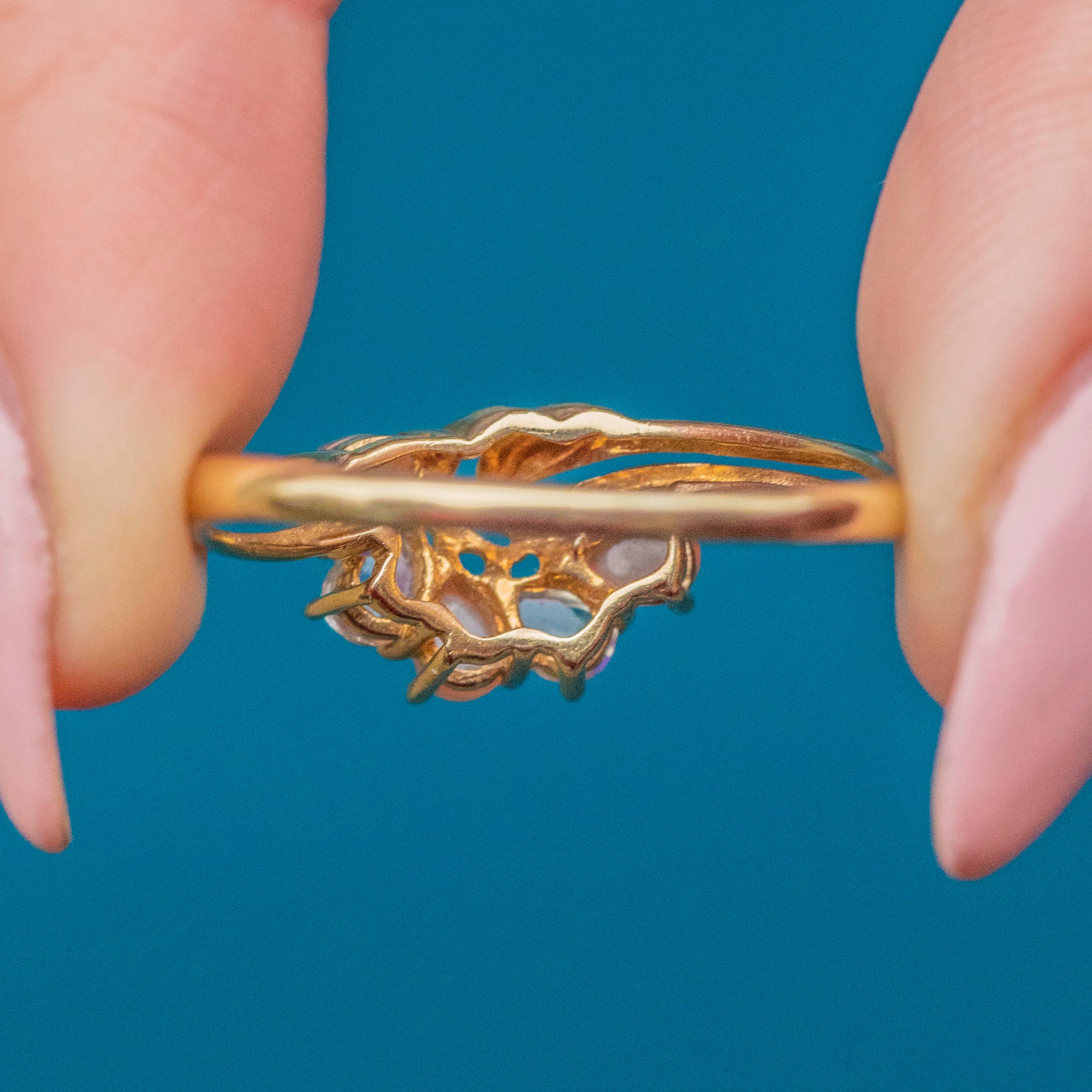 EXCELLENT. This 9ct Gold Moonstone and Chalcedony fan ring is in excellent condition. Her Moonstones and Chalcedonies are radiant and capture the light beautifully, sitting securely within their claw settings. The gorgeously crafted vintage 9ct yellow Gold is free from any scuffs or scratches and looks radiant against her gemstones!
