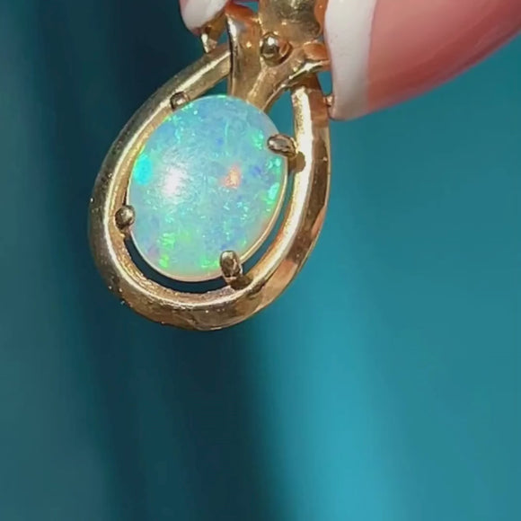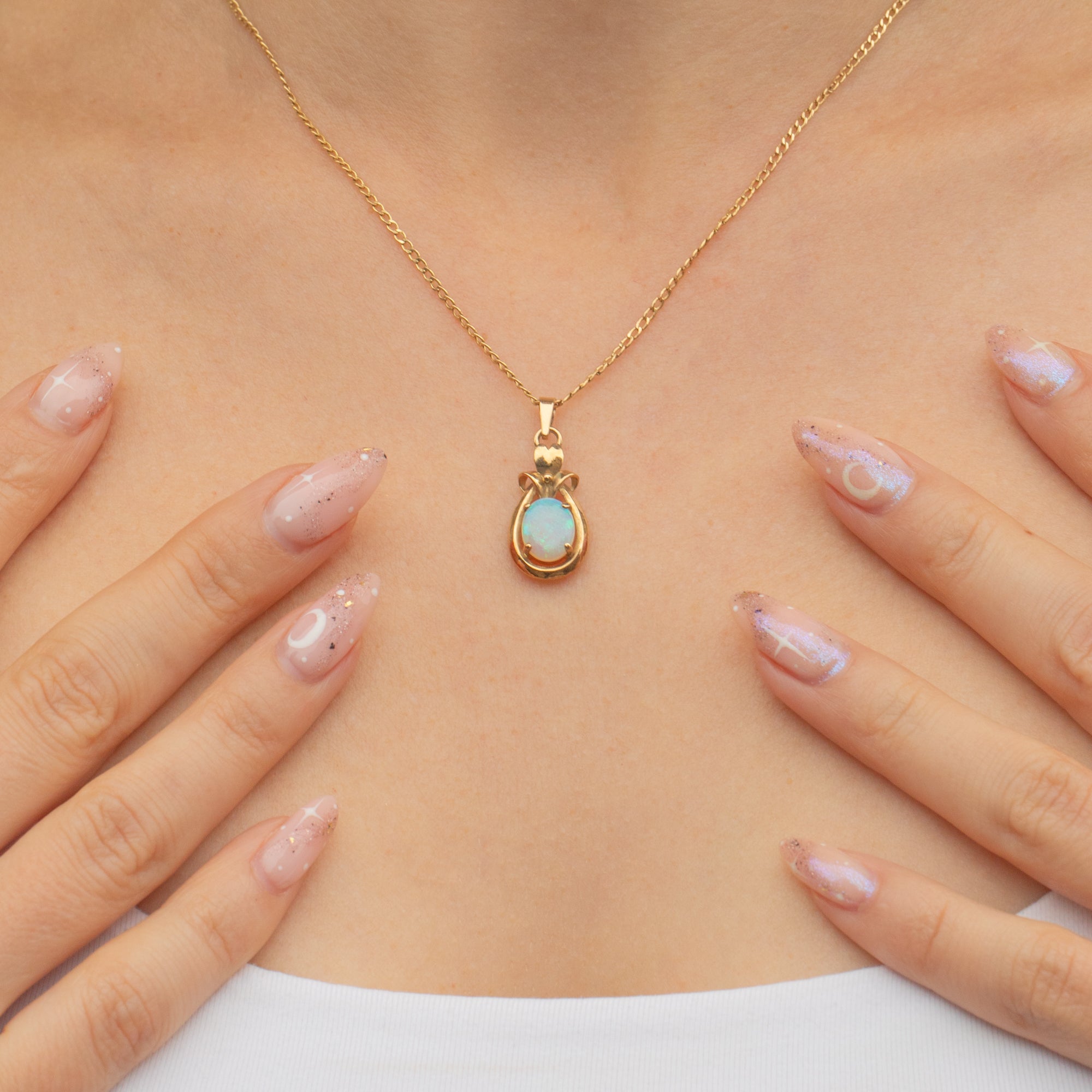 This 9ct Gold natural solid Opal pendant is the magical piece your jewellery collection has been missing! An ethereal milky 0.70ct natural Opal is snug within her buttery 9ct Gold setting, exhibiting electric shimmers in the light.