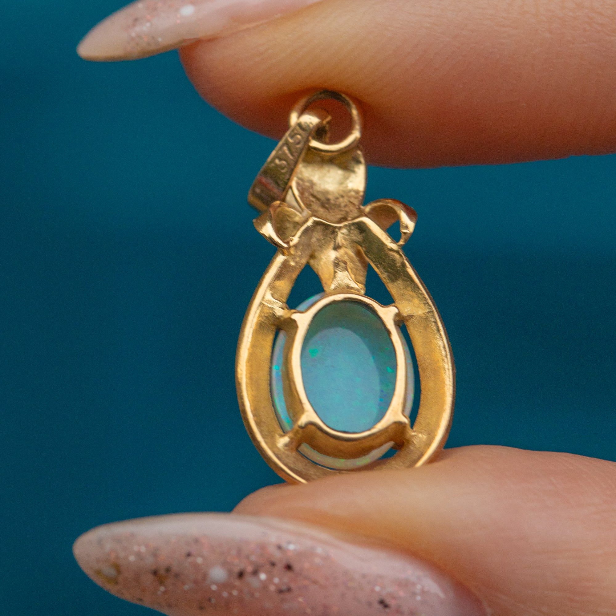 EXCELLENT. This 9ct Gold natural solid Opal pendant is in sublime condition throughout. The Opal is free from chips or scratches and is secure within the 9ct Gold setting. The Gold is buttery and smooth throughout and the robust bale will provide you with endless wearing pleasure!