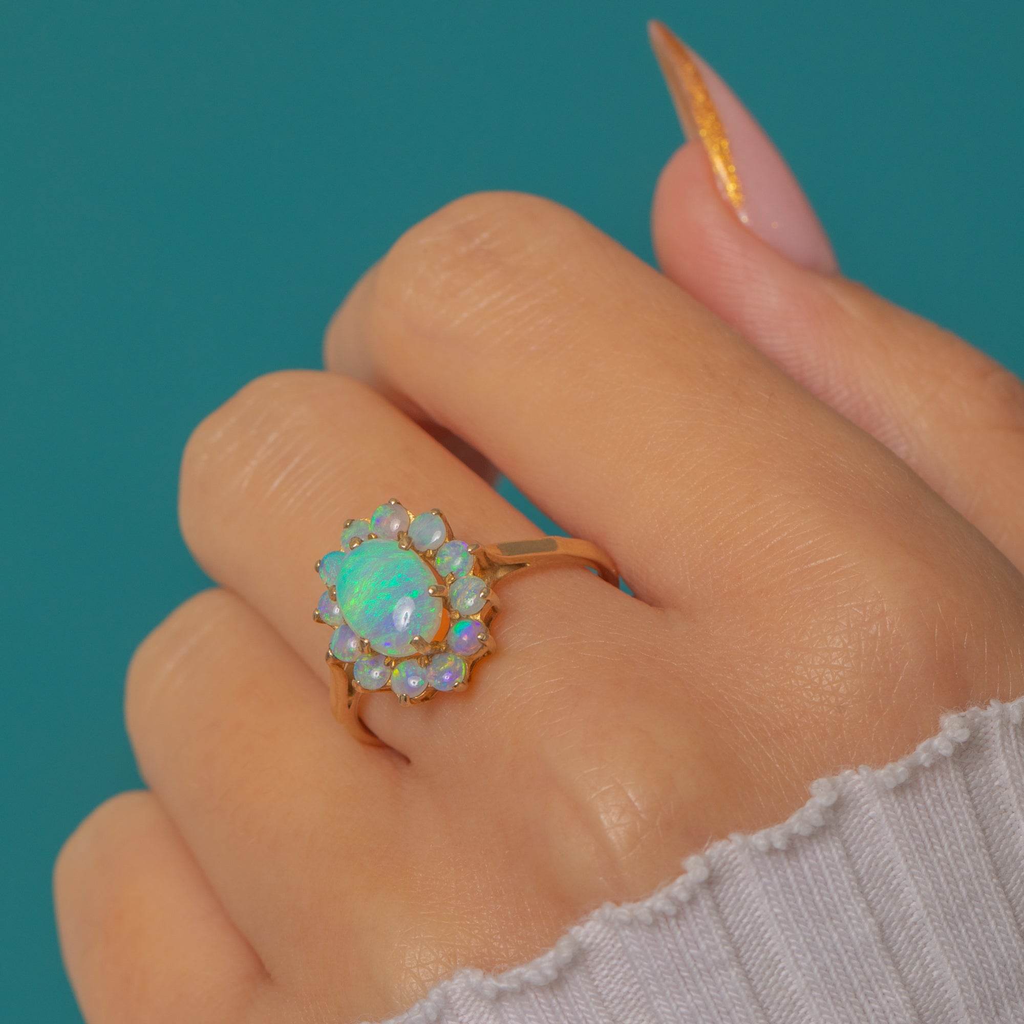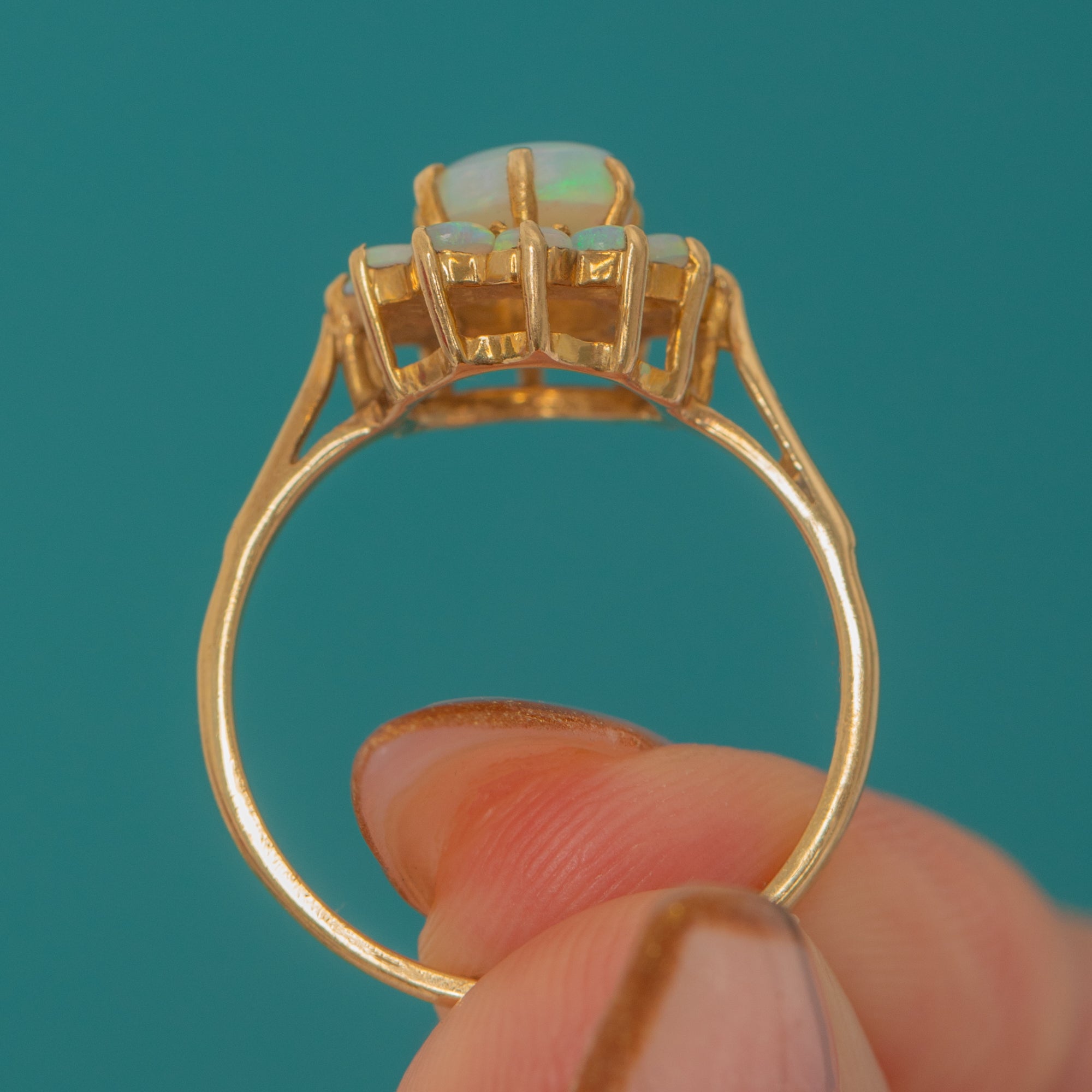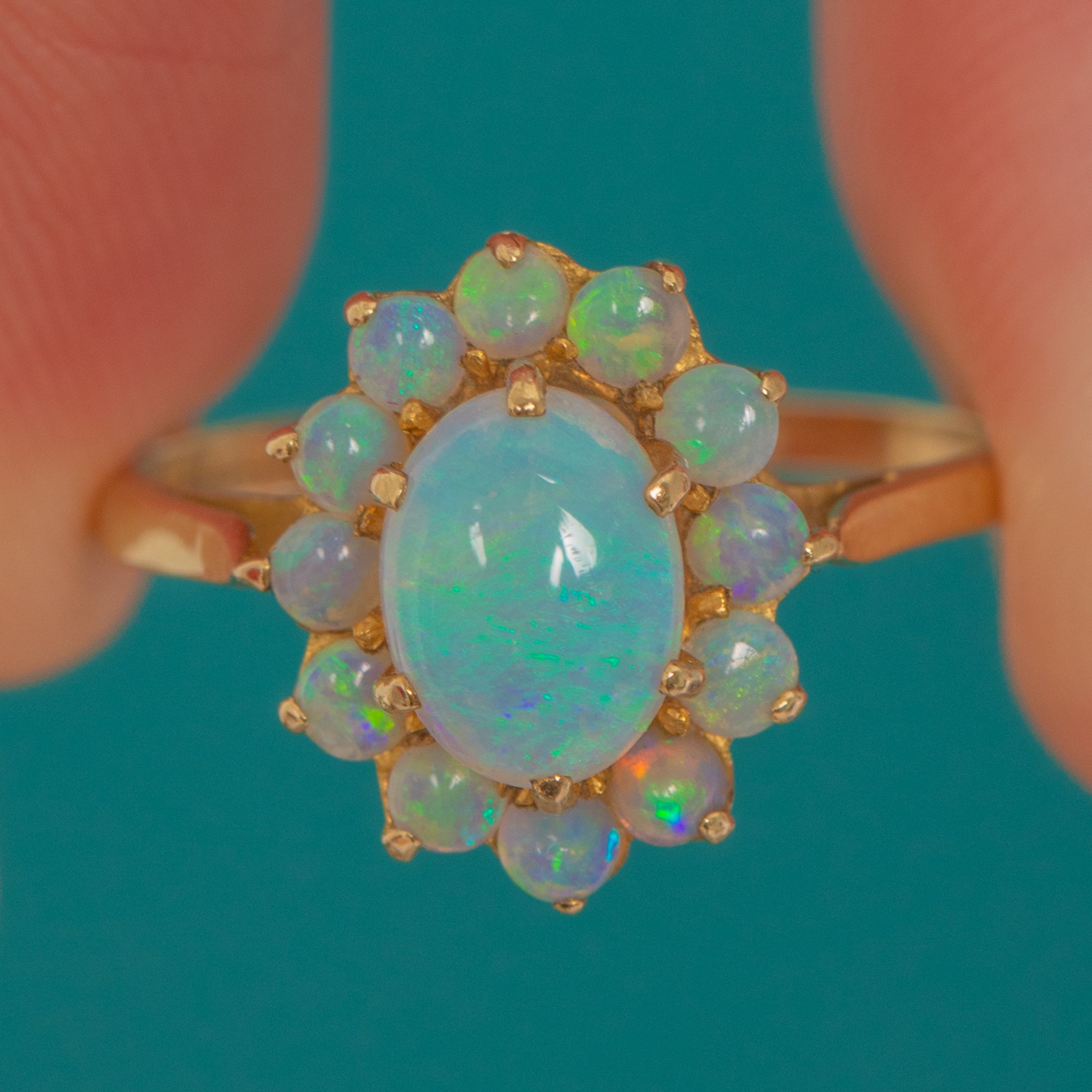 A bright and charming Vintage Opal cluster ring crafted in solid 9ct Gold. The central Opal displays soft pastel flashes and is surrounded by a halo of petite Opals that add a lovely celestial sparkle.