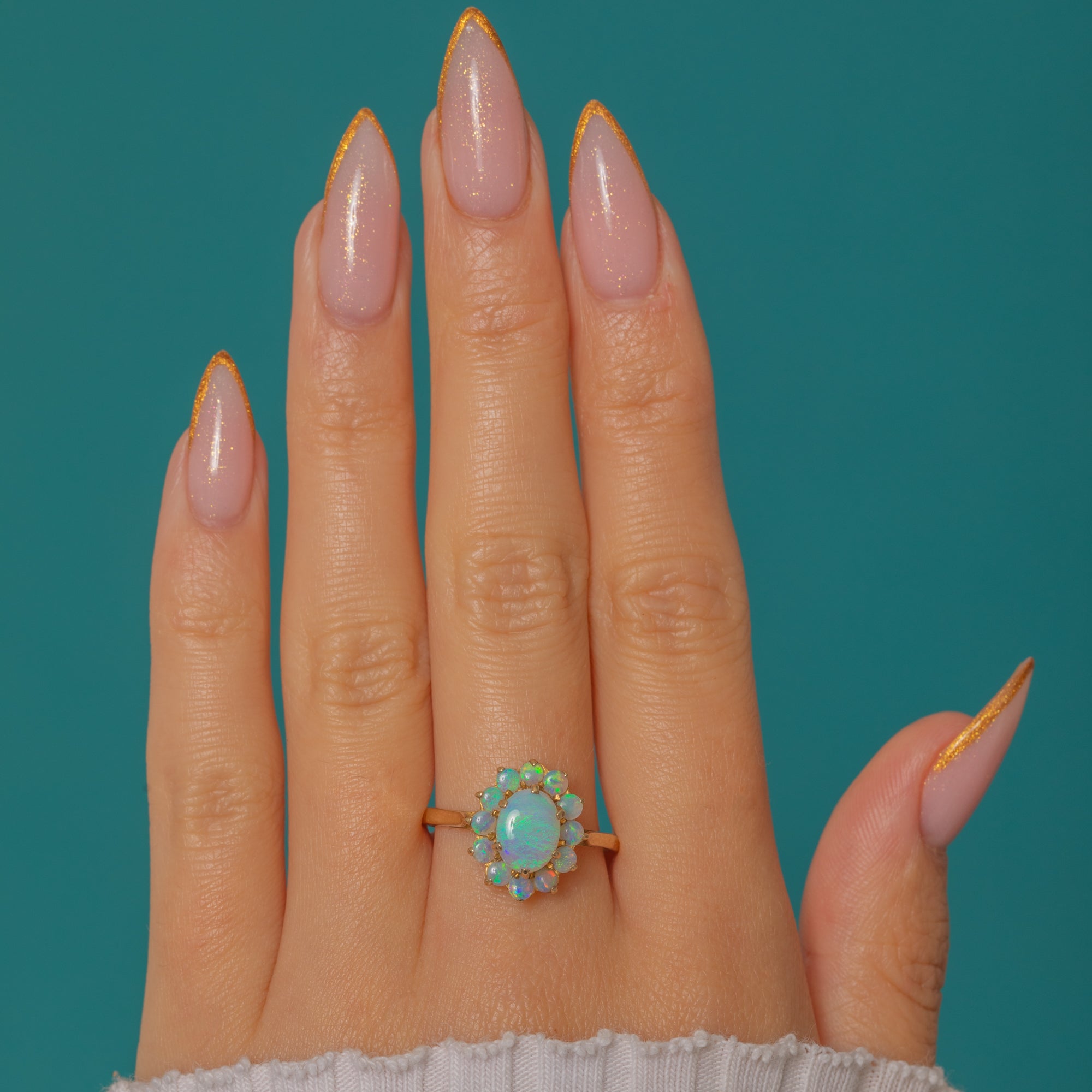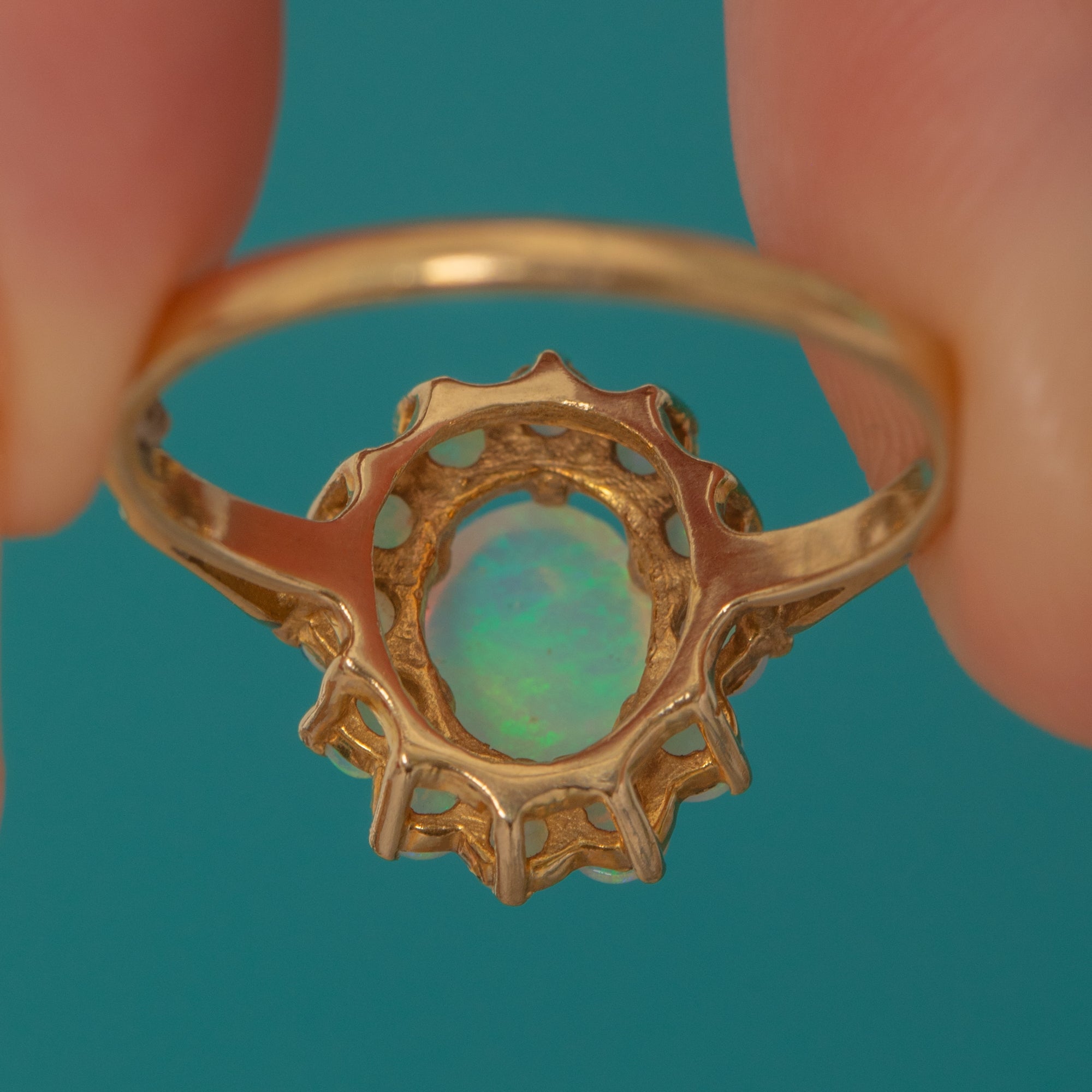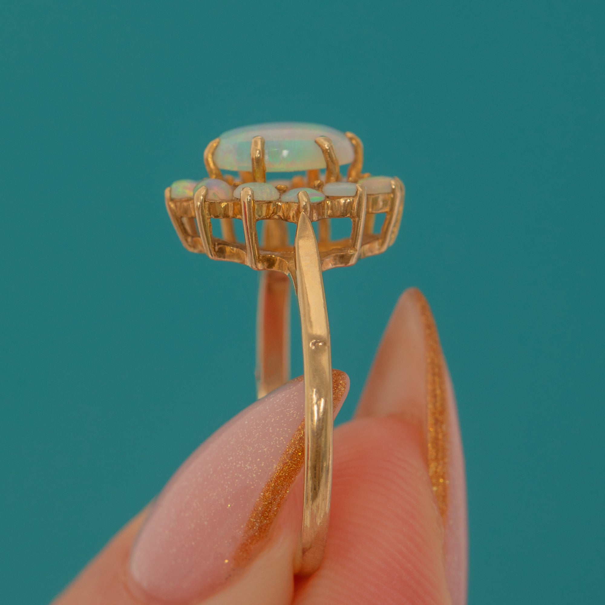 A bright and charming Vintage Opal cluster ring crafted in solid 9ct Gold. The central Opal displays soft pastel flashes and is surrounded by a halo of petite Opals that add a lovely celestial sparkle.