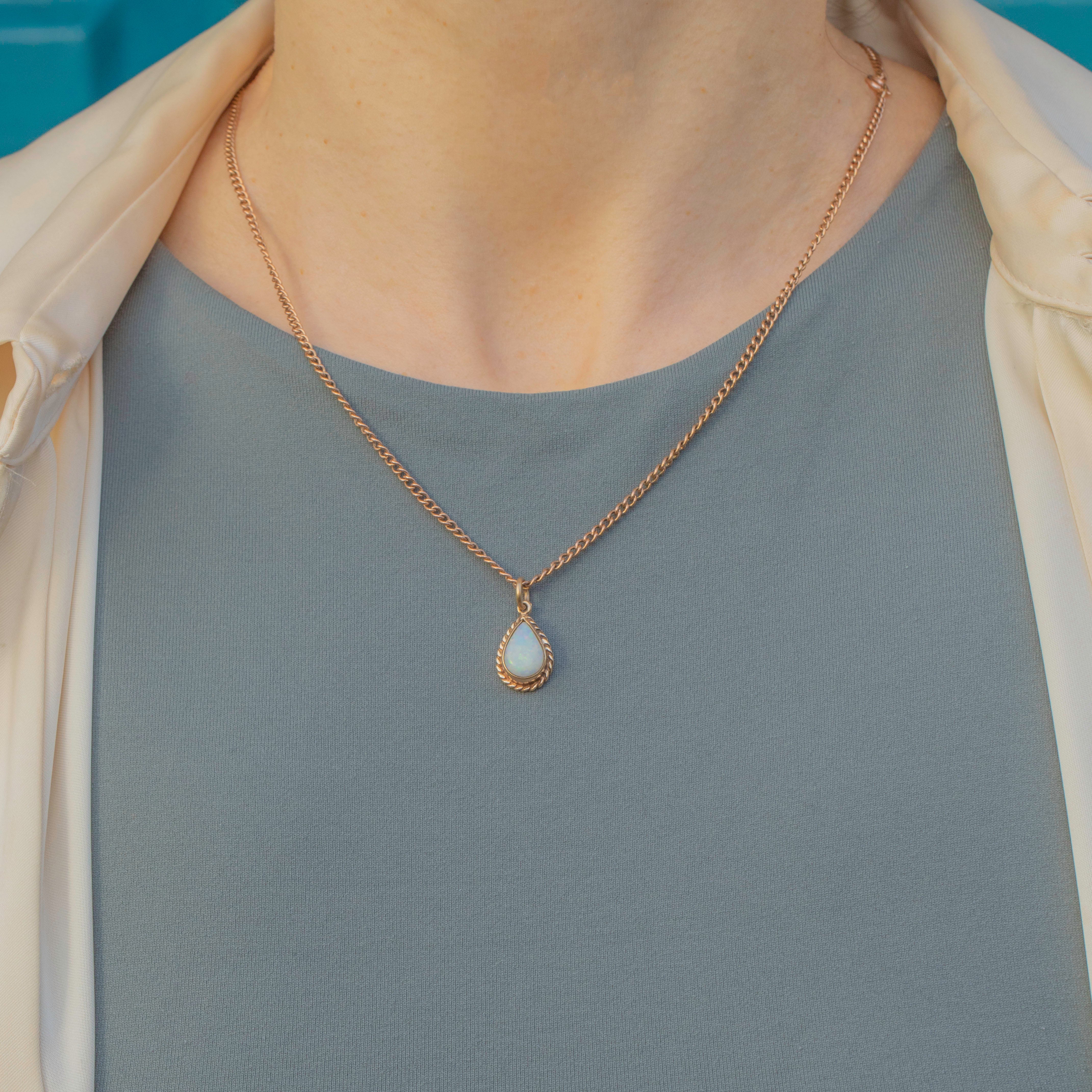 VERY GOOD. This 9ct Gold Opal pear drop charm is in wonderful condition. The Opal is smoothly domed and free from nibbles or abrasions. The Gold is buttery with only minor wear near the top of the bezel, but the Opal remains securely set. With a generously sized jump ring, all you need is a slender Gold chain to suspend this beauty from!