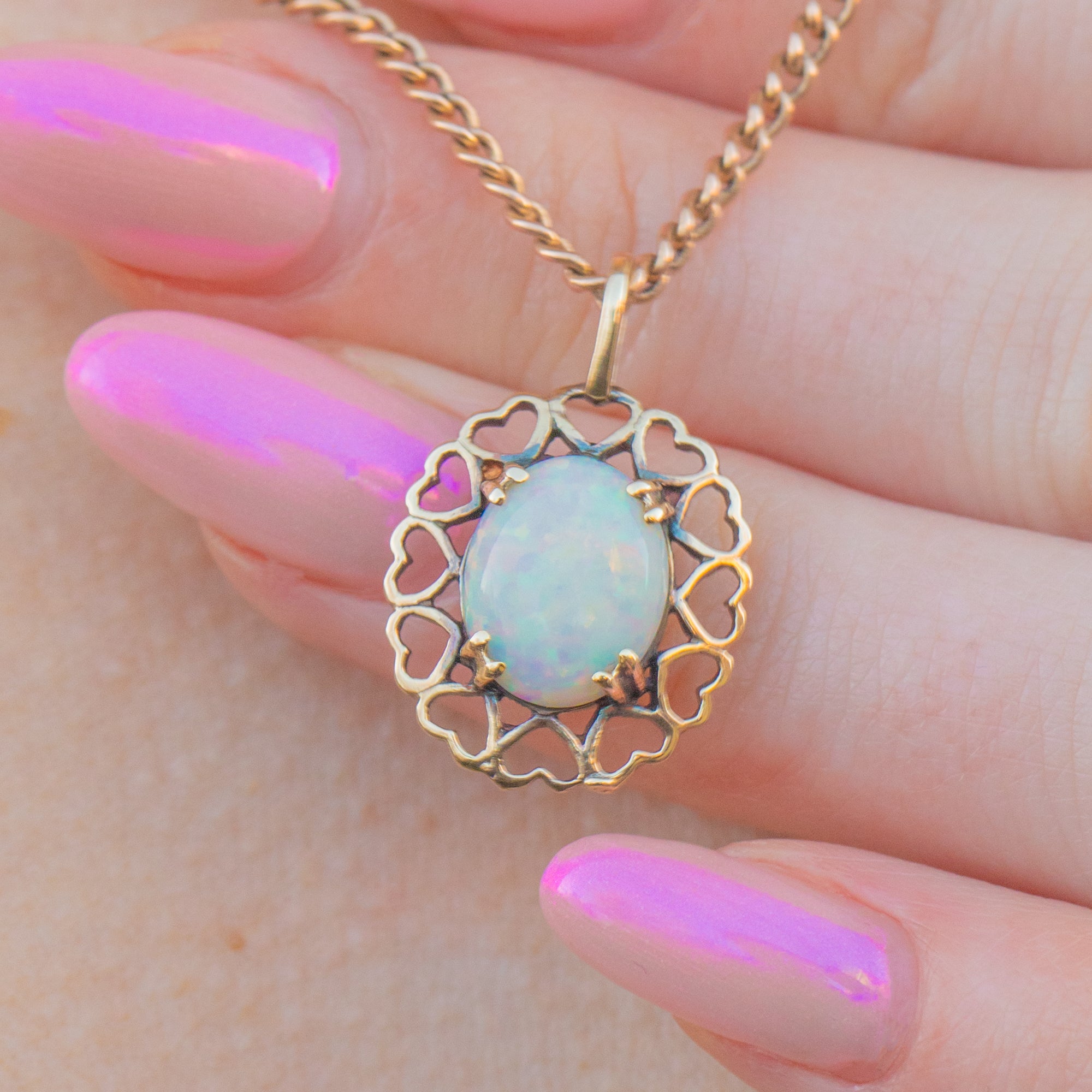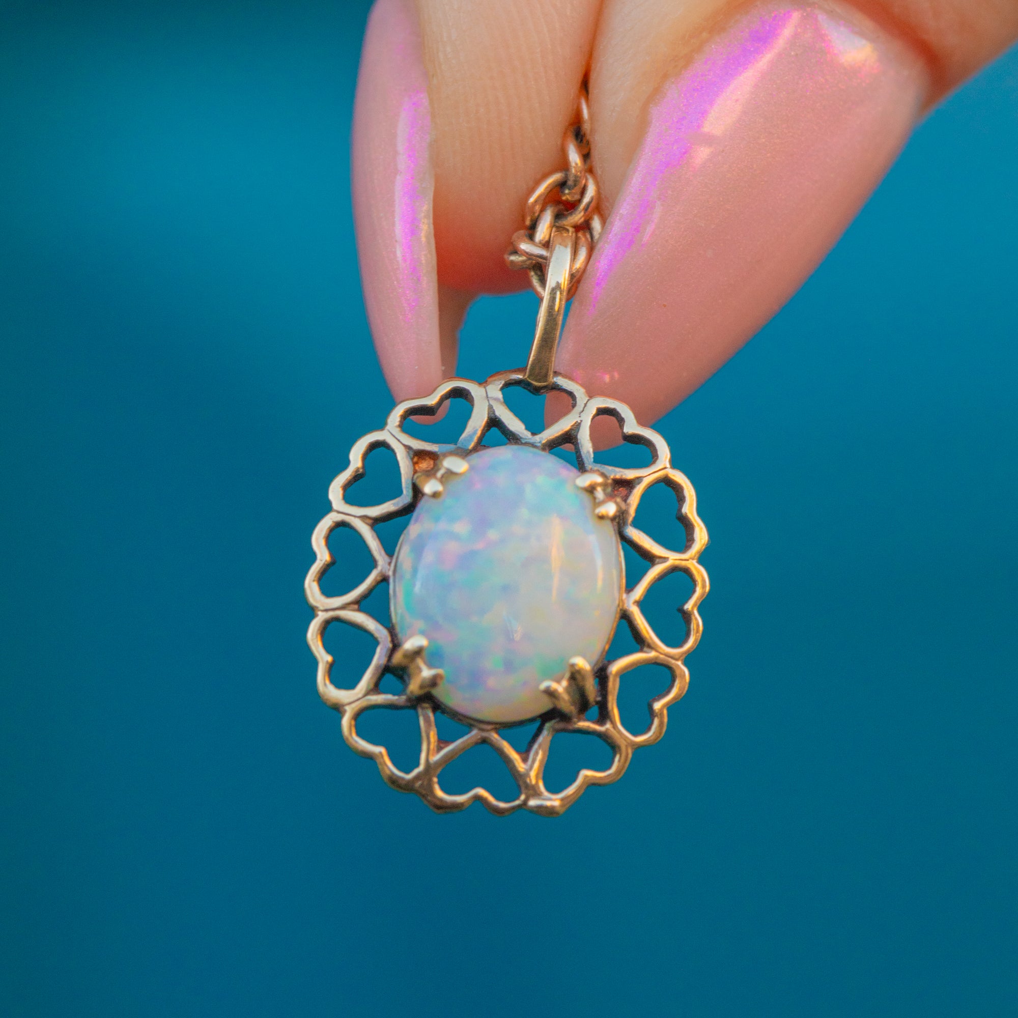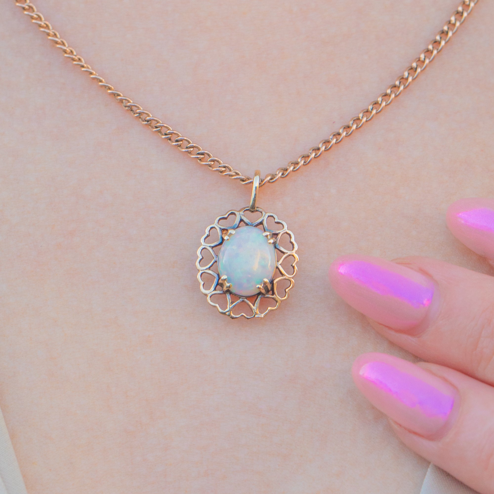 Showcasing a gorgeous confetti opal at her centre, this vintage pendant invites you in with her captivating play of colours. Encased in a warm 9ct gold setting, she is accented by a delicate heart-shaped border, adding the perfect romantic touch to this pendant.