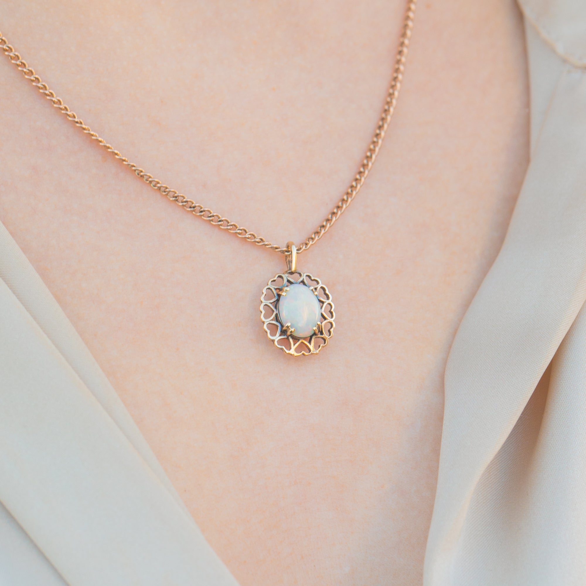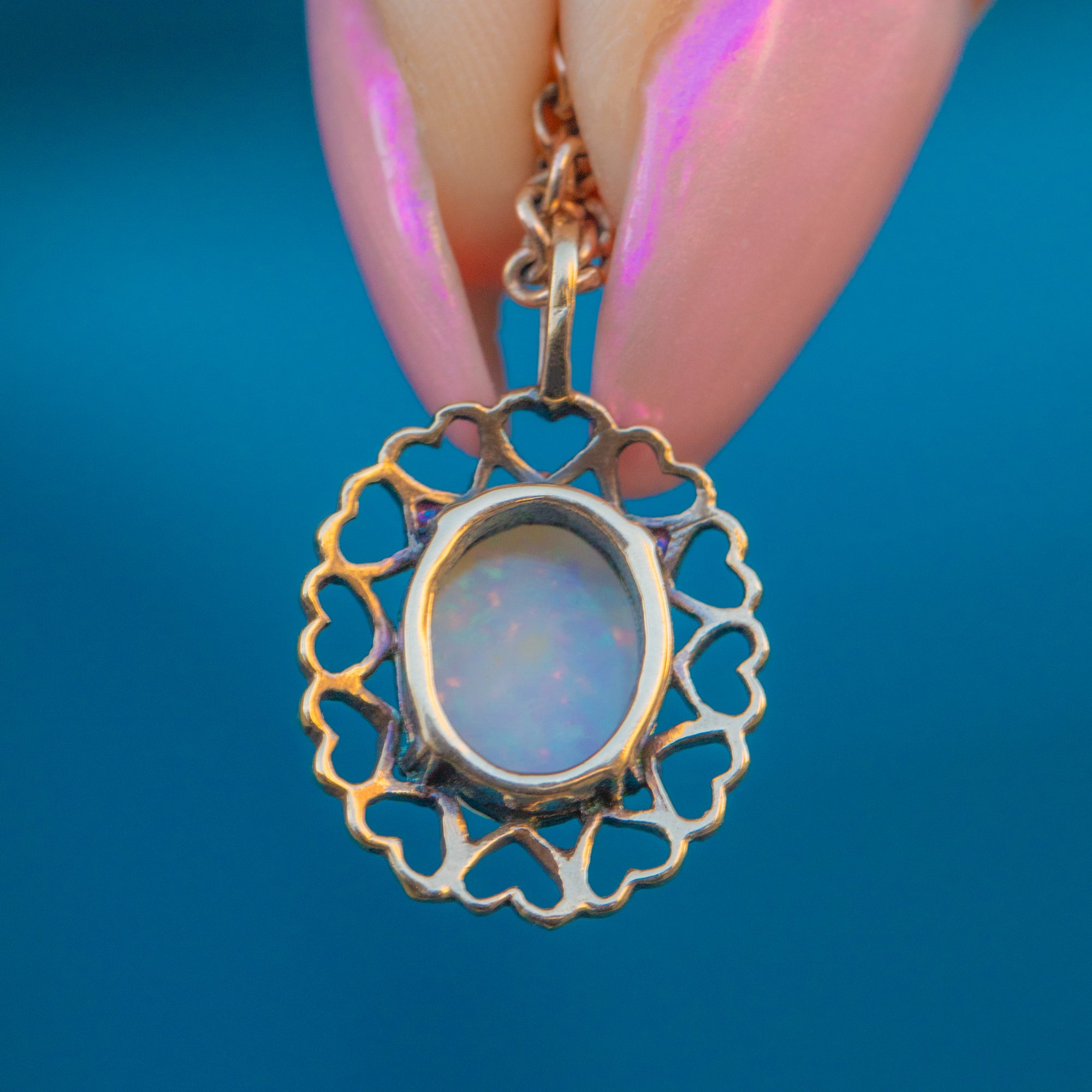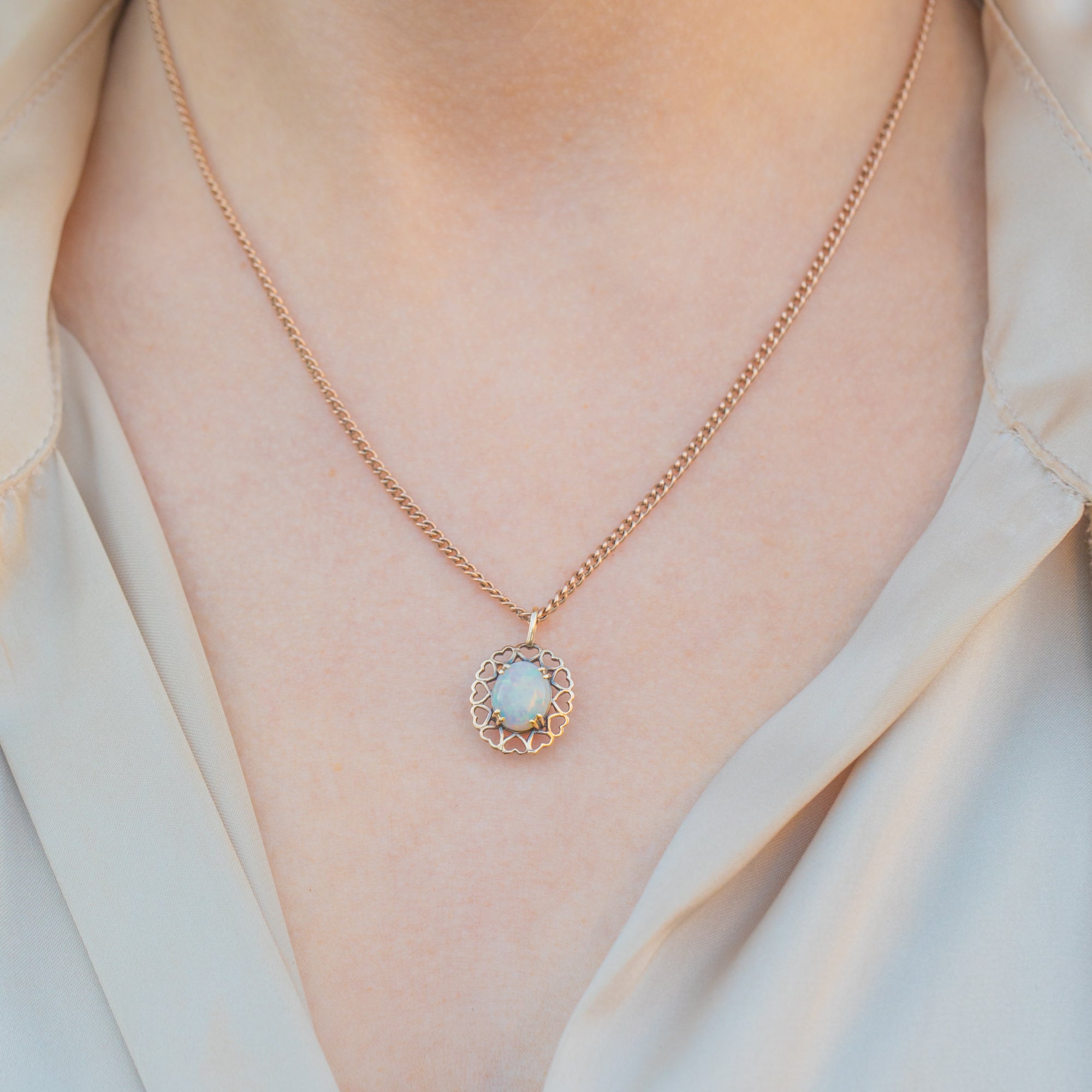 Showcasing a gorgeous confetti opal at her centre, this vintage pendant invites you in with her captivating play of colours. Encased in a warm 9ct gold setting, she is accented by a delicate heart-shaped border, adding the perfect romantic touch to this pendant.