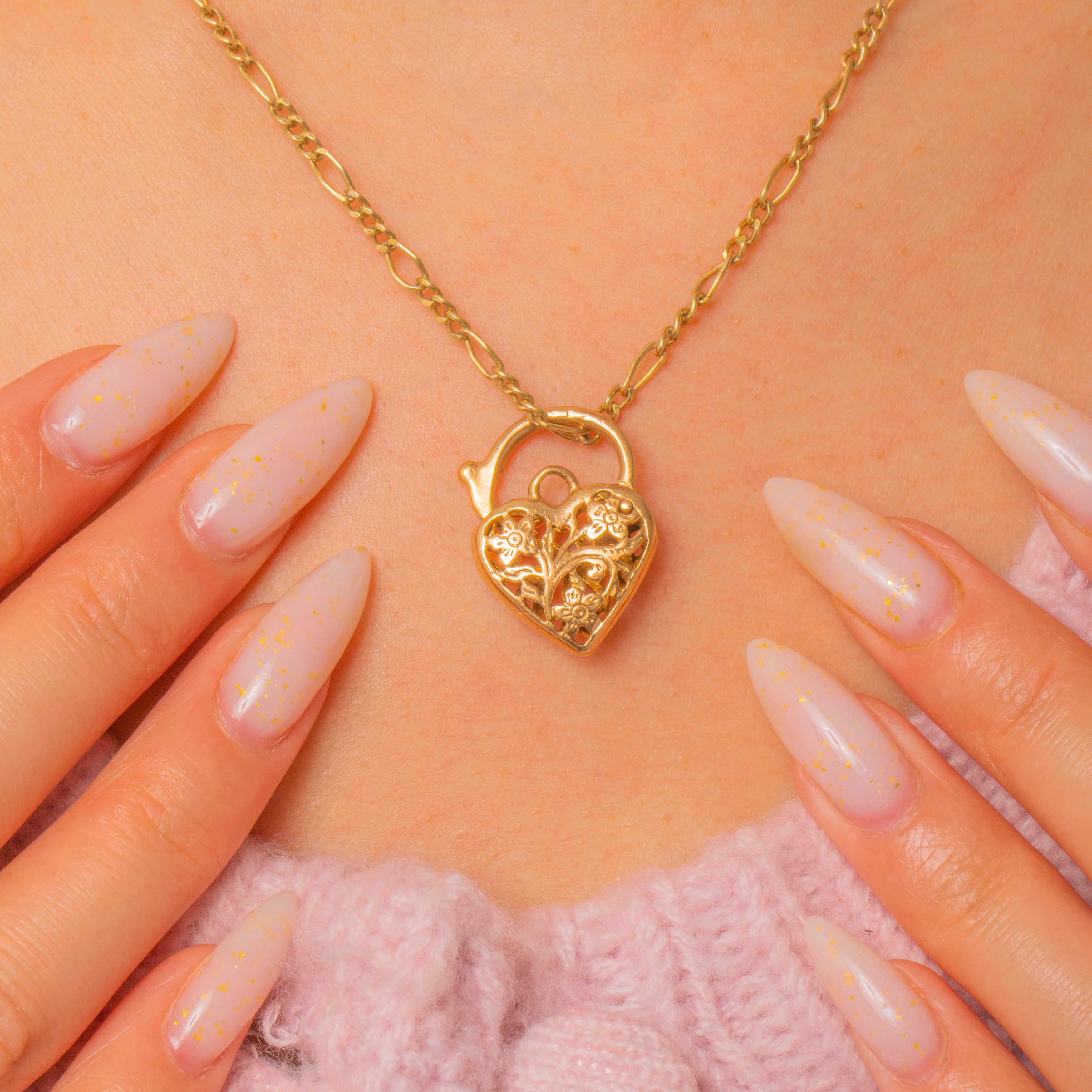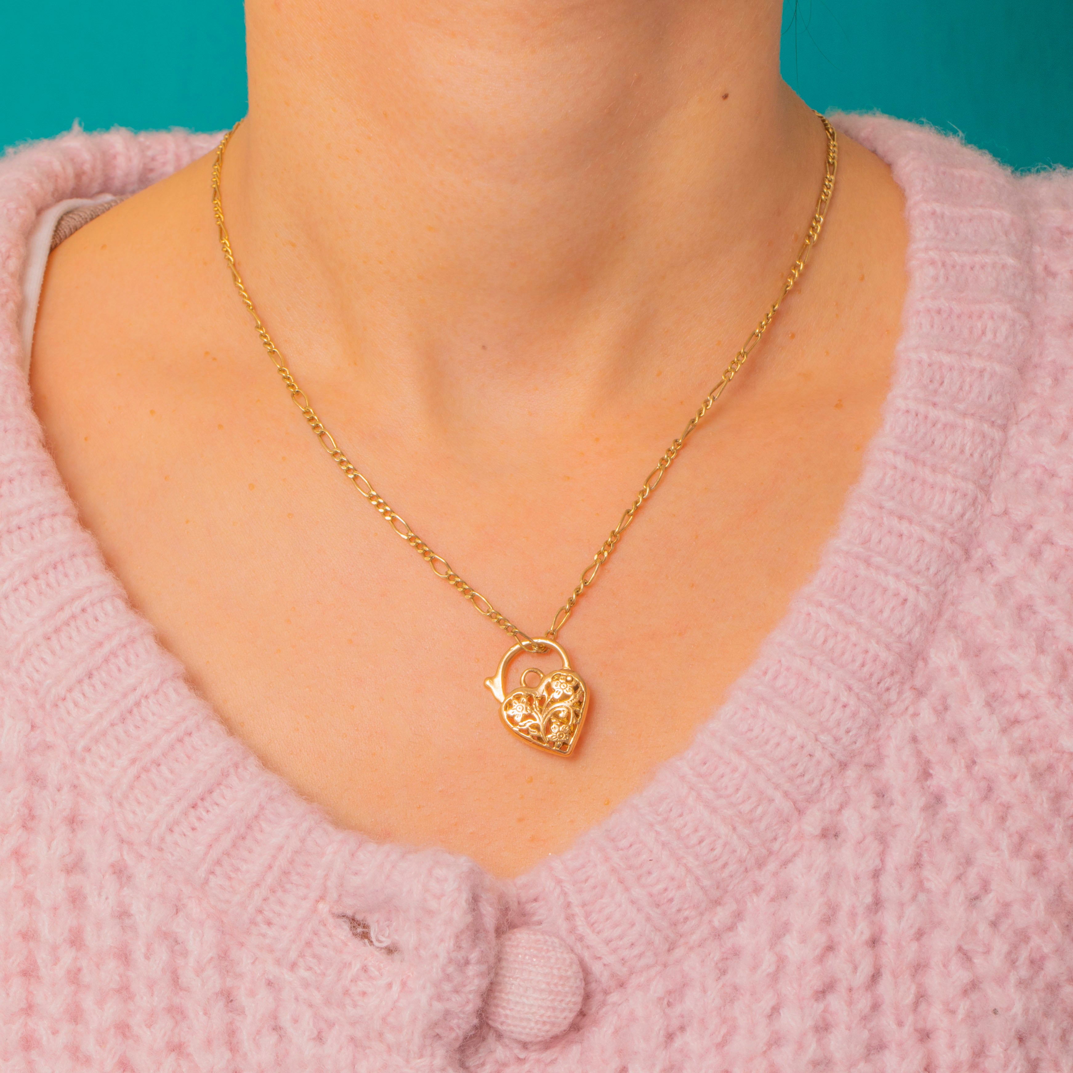 VERY GOOD. The Gold is radiant with a high-shine polish, and the engraved details have remained crisp. Aside from some dings to the padlock lever, this 9ct Gold heart padlock has little wear, only some surface wear commensurate with age on either side. The lever is in perfect working condition, allowing you to wear it with utmost confidence!