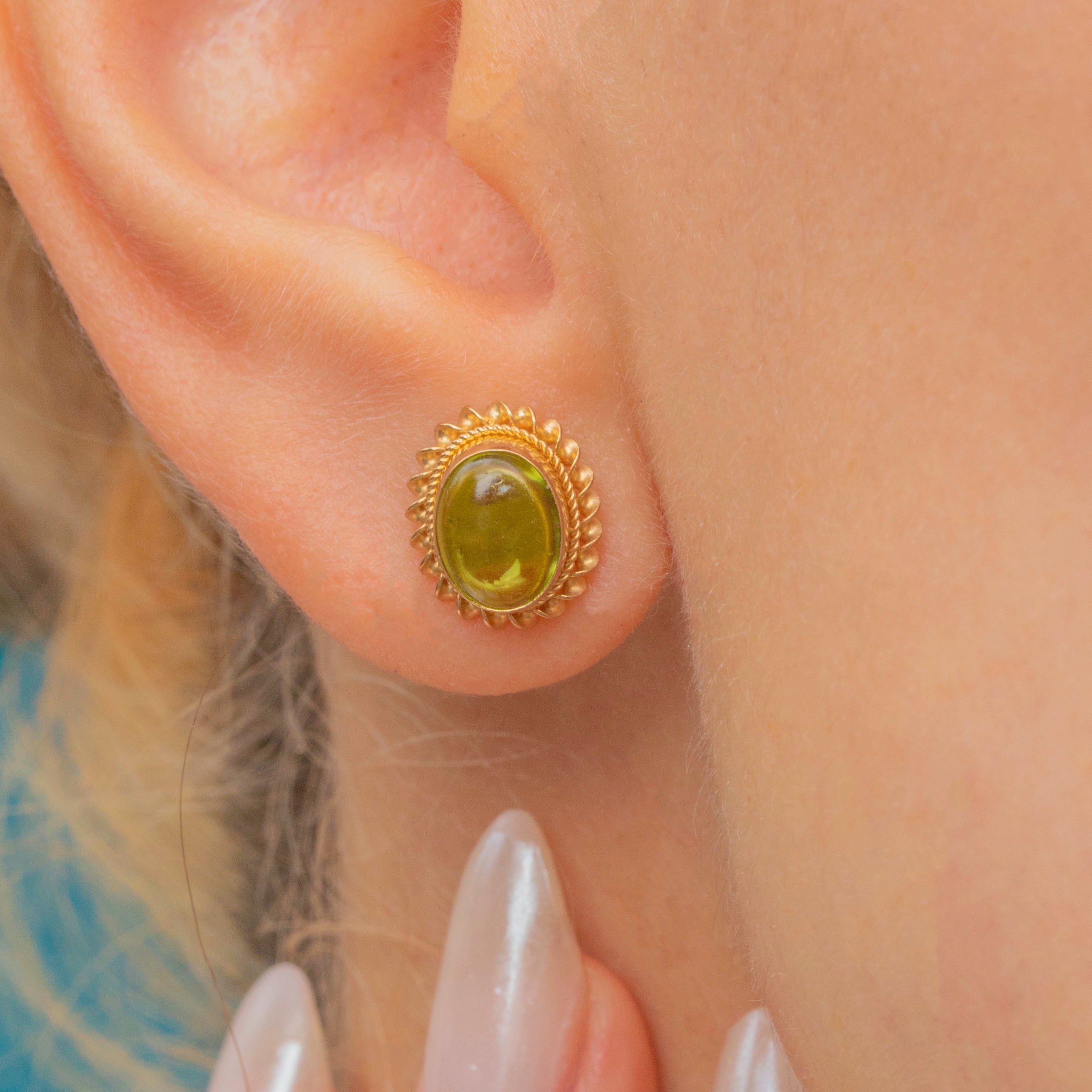 EXCELLENT. With secure and smooth Peridot cabochons, these earrings are in fabulous condition. The Peridots display some natural inclusions, but nothing visible to the naked, untrained, eye. The earrings are fully hallmarked to 1995 and come with secure butterfly backs.