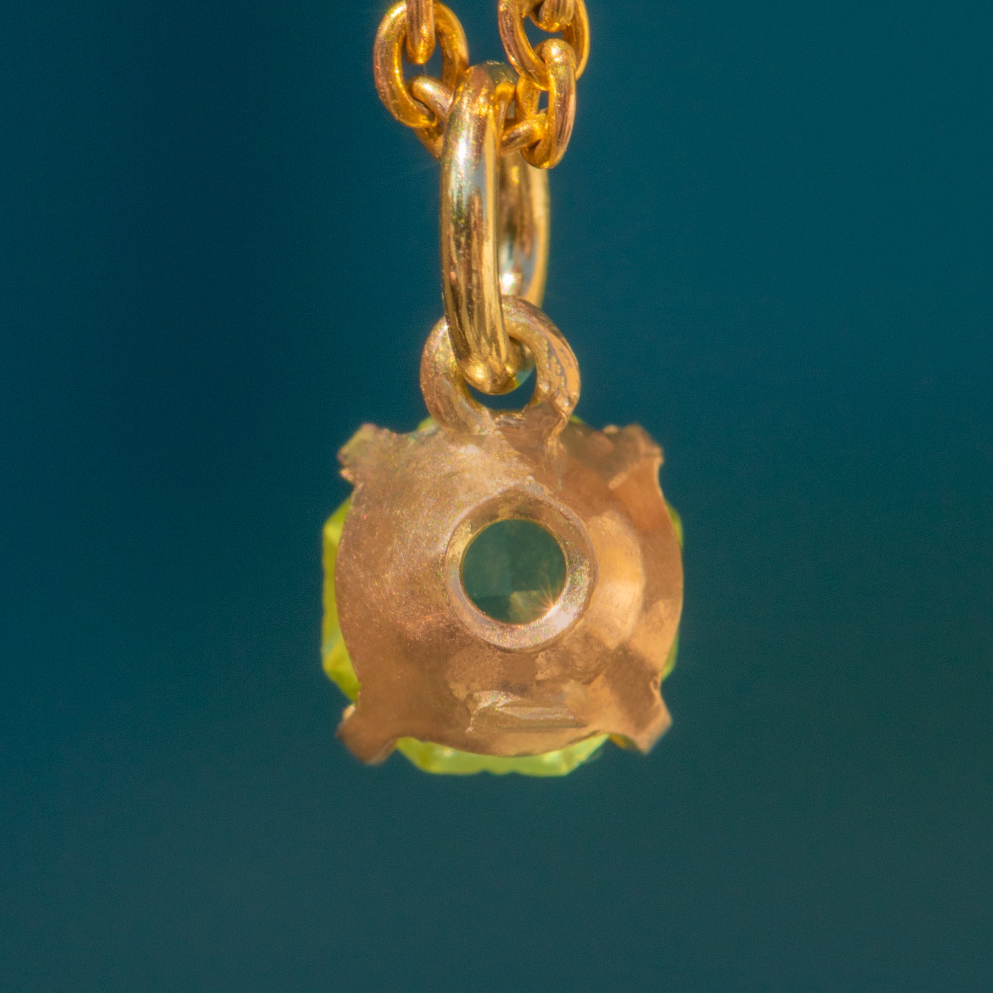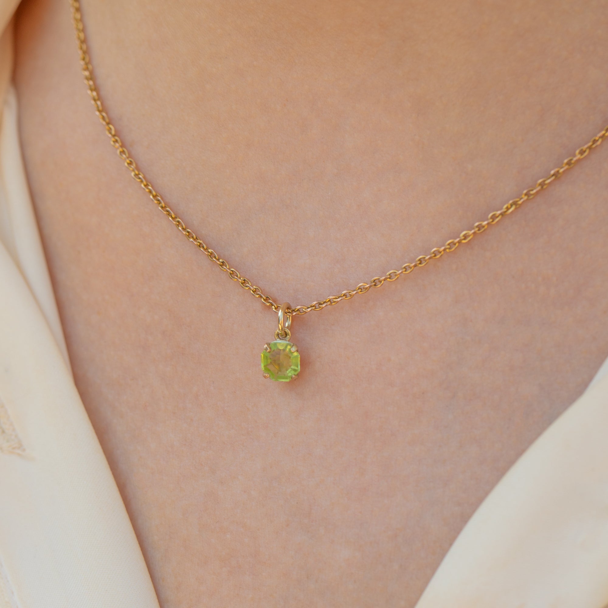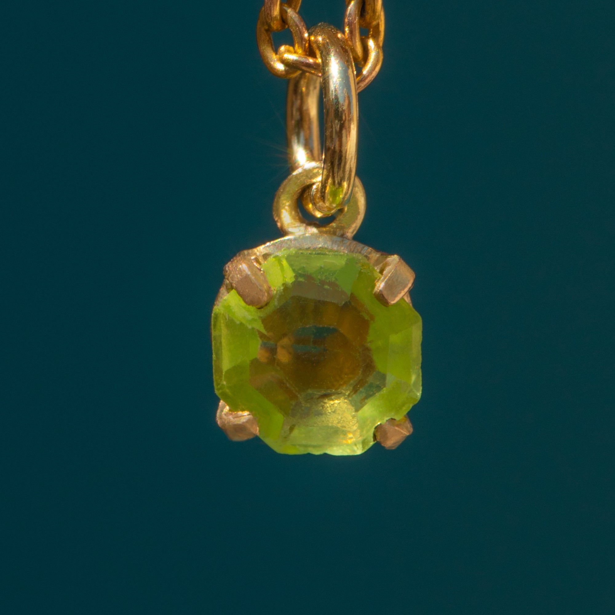 Add some zest to your repertoire with this 9ct Gold Peridot charm! With vivid lime hues swimming around the faceted form of her 0.75ct Peridot, she will add a punchy kick to any antique chain you suspend her form.
