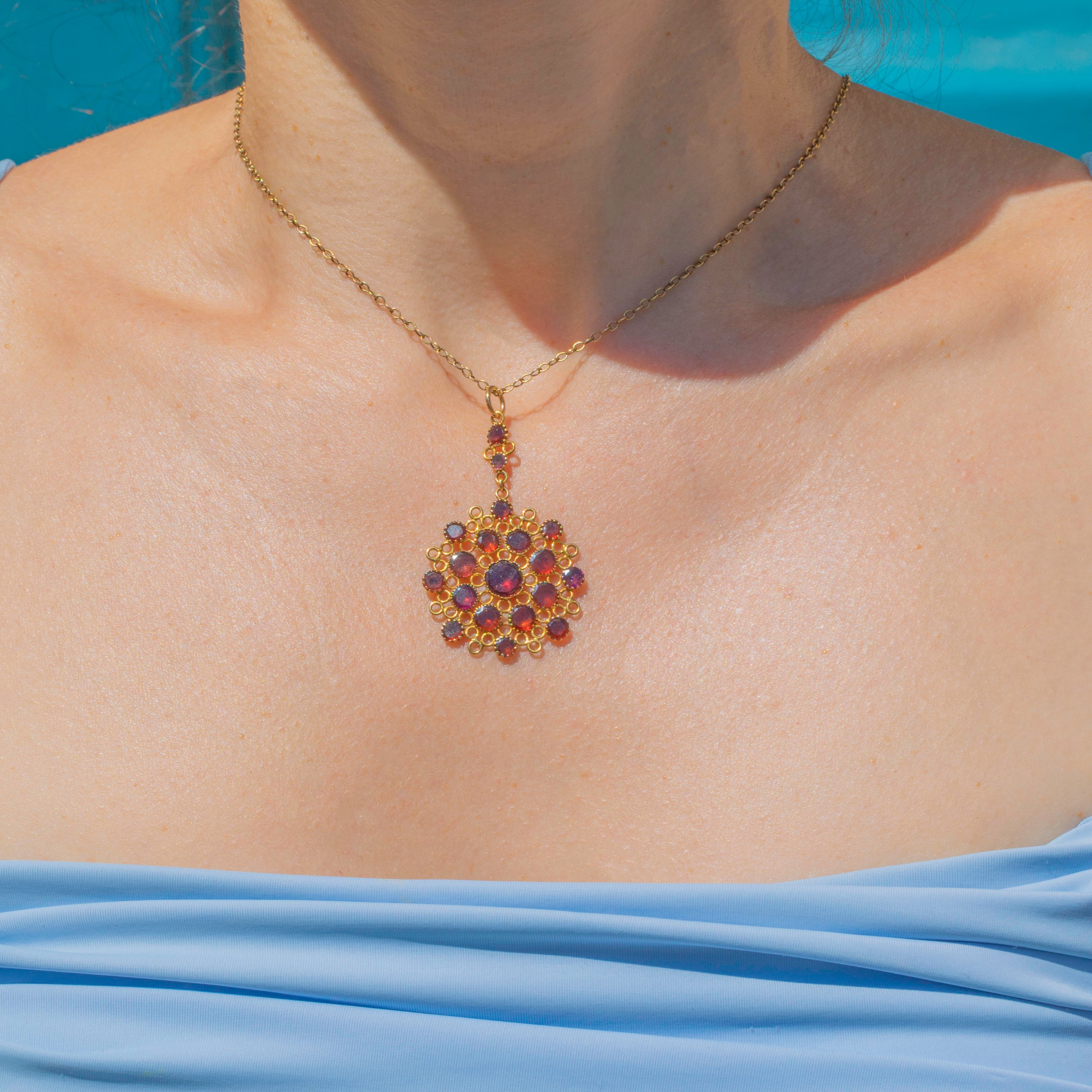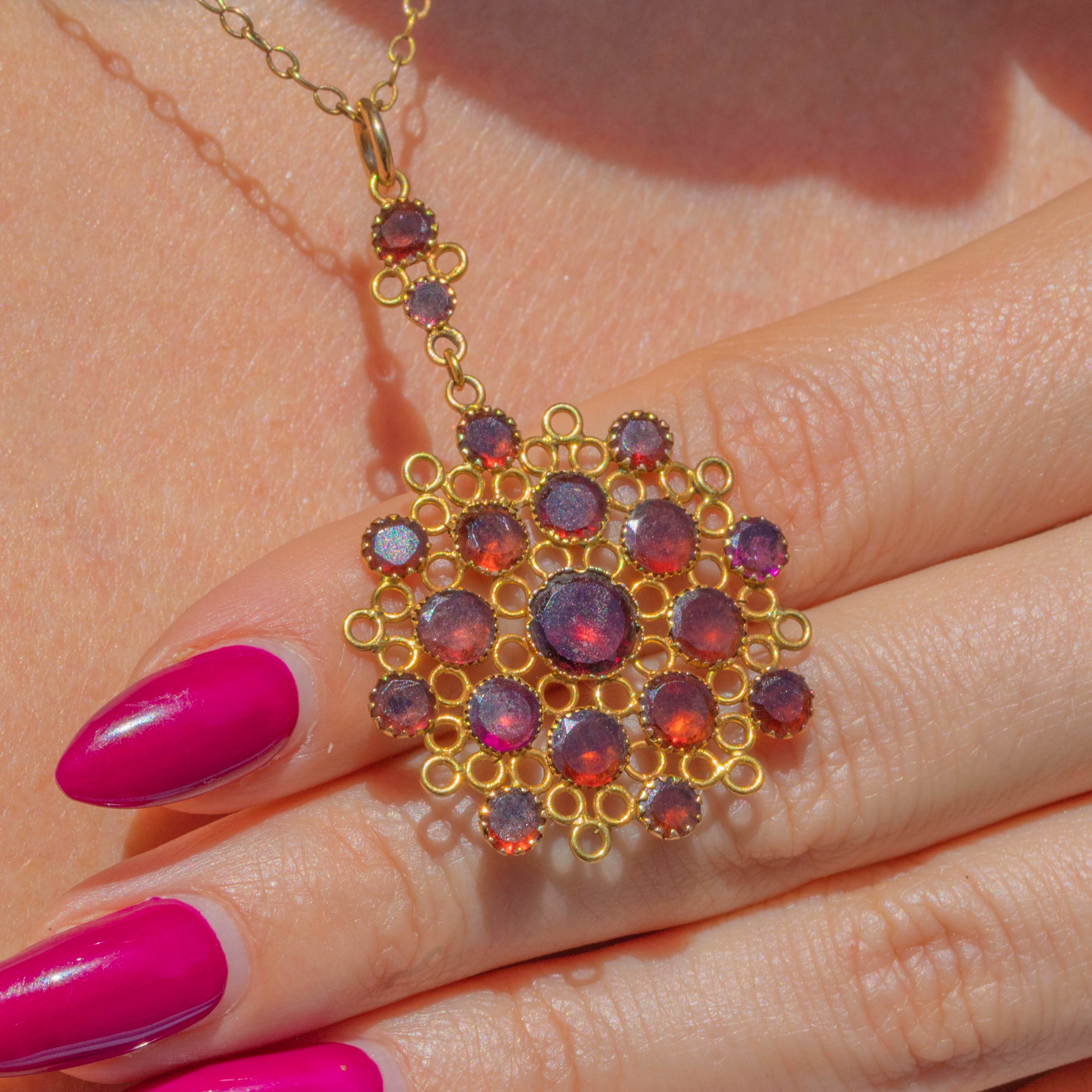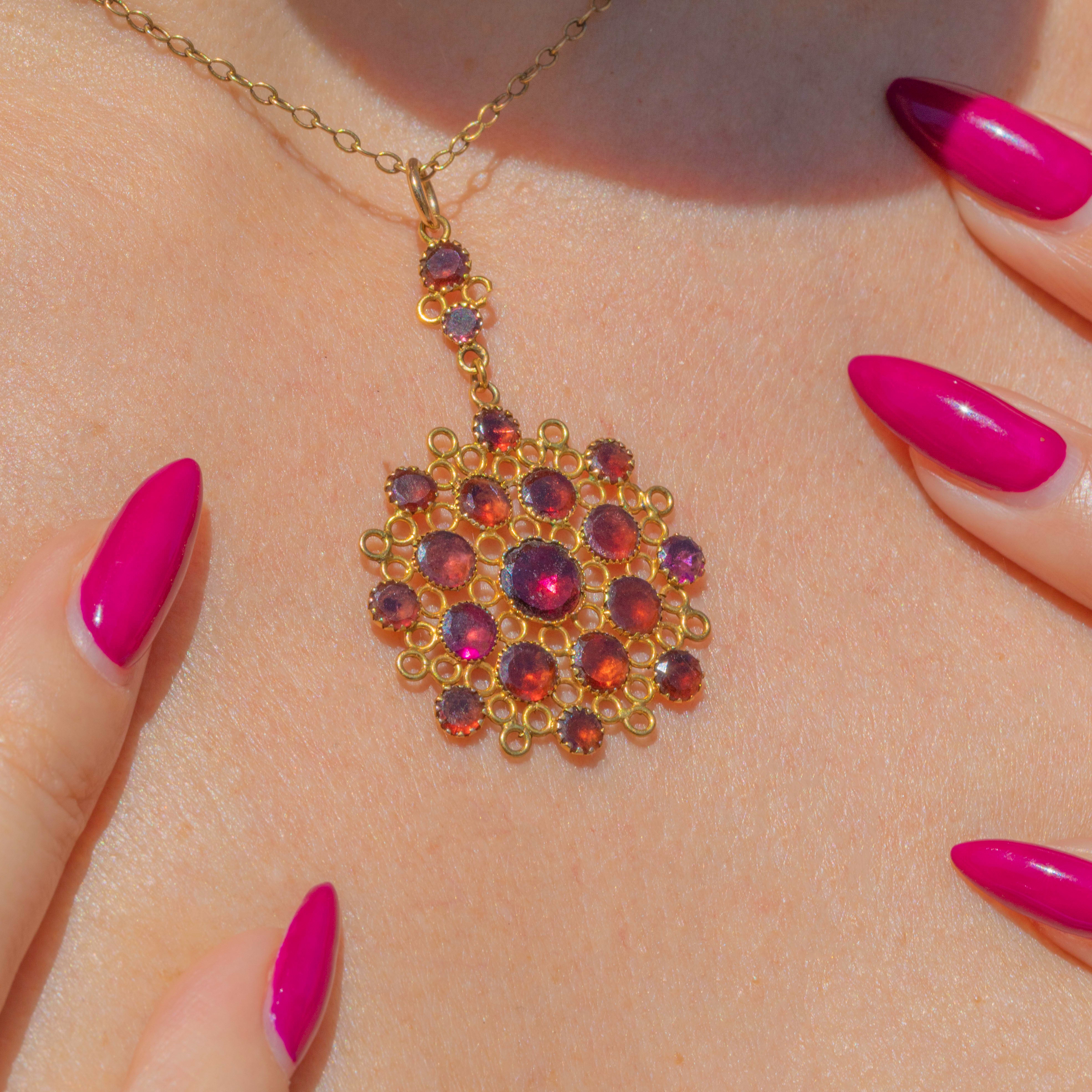 Crafted from rosy 9ct Gold, this round pendant features gorgeous flat-cut Garnets, each with a rich crimson hue, displayed within classic Georgian settings.