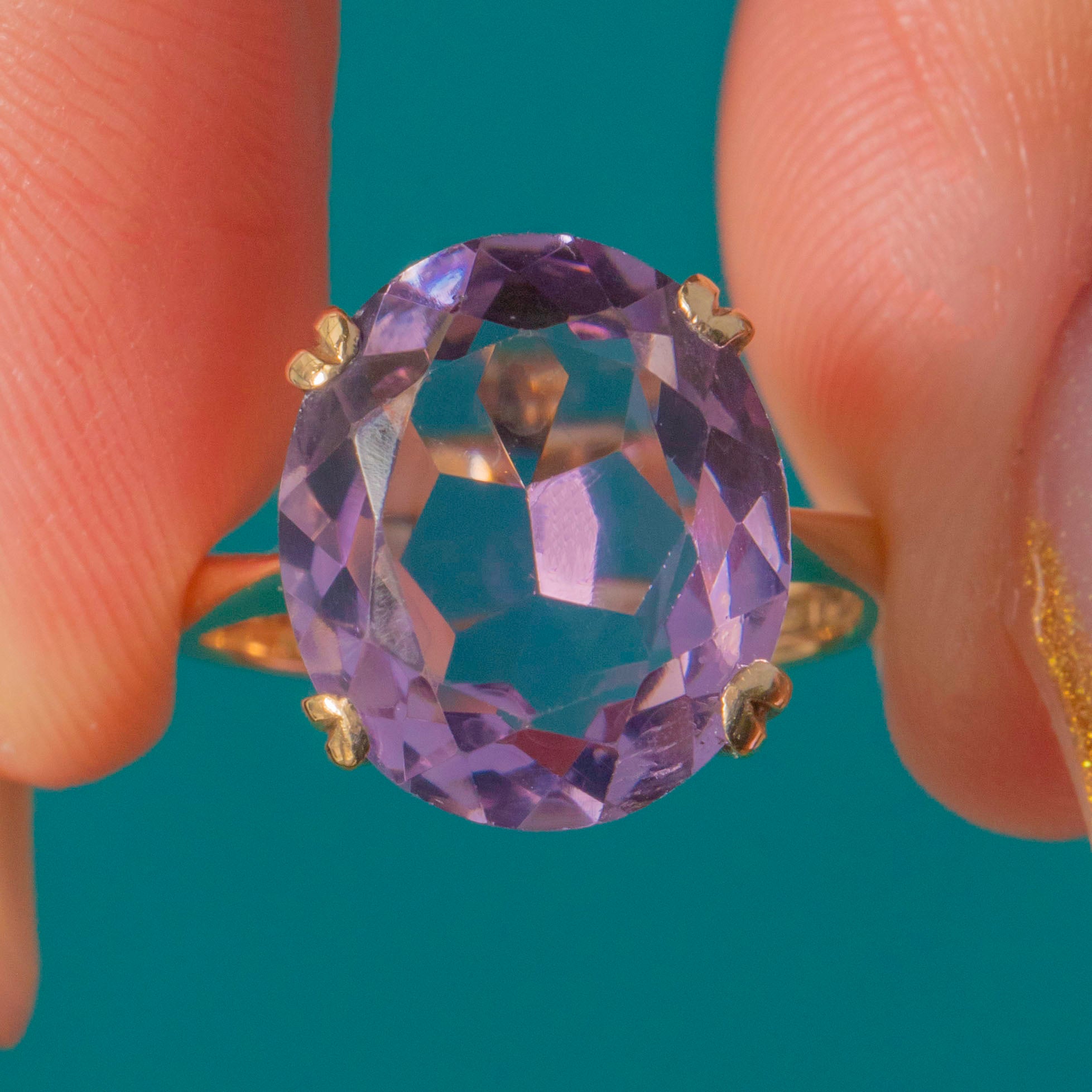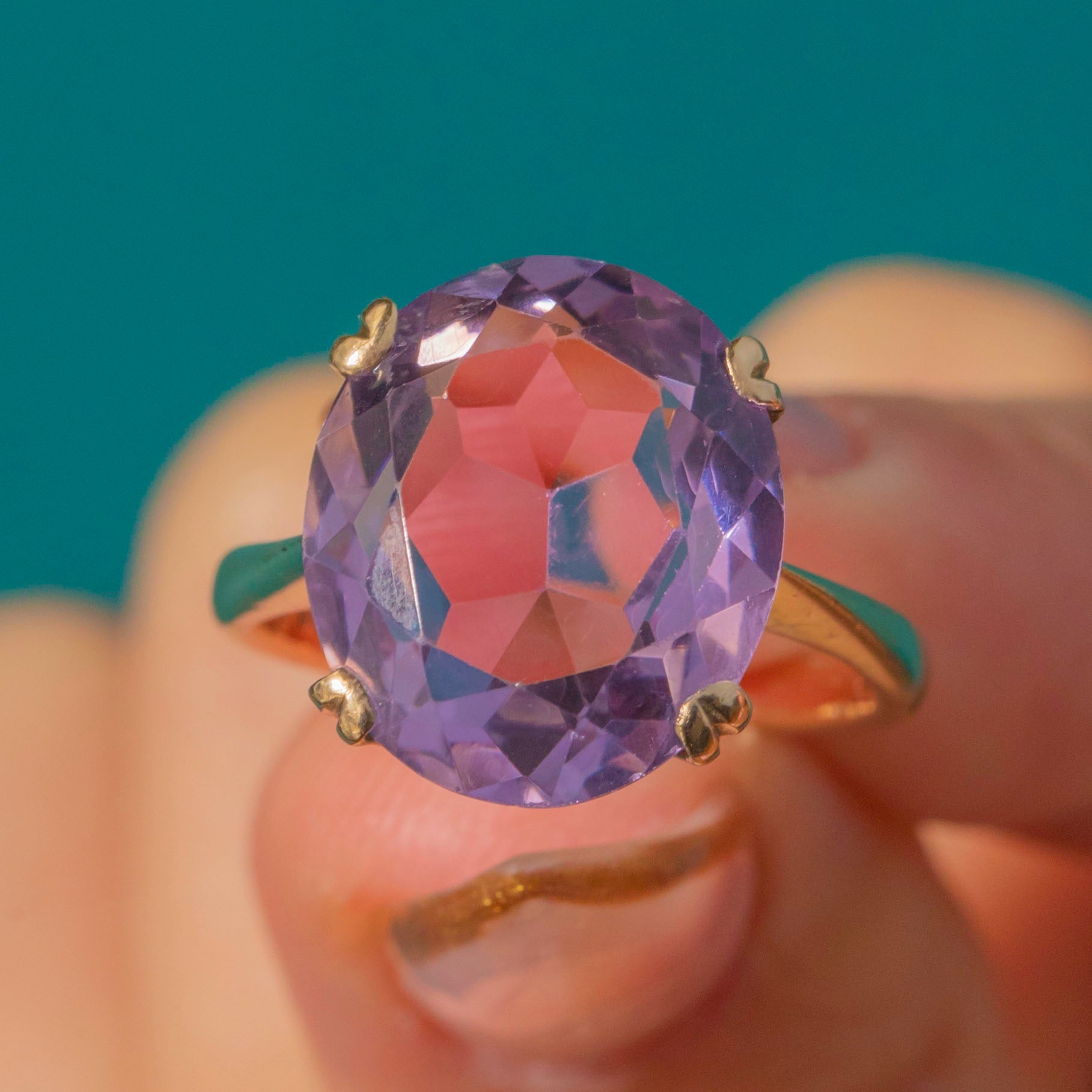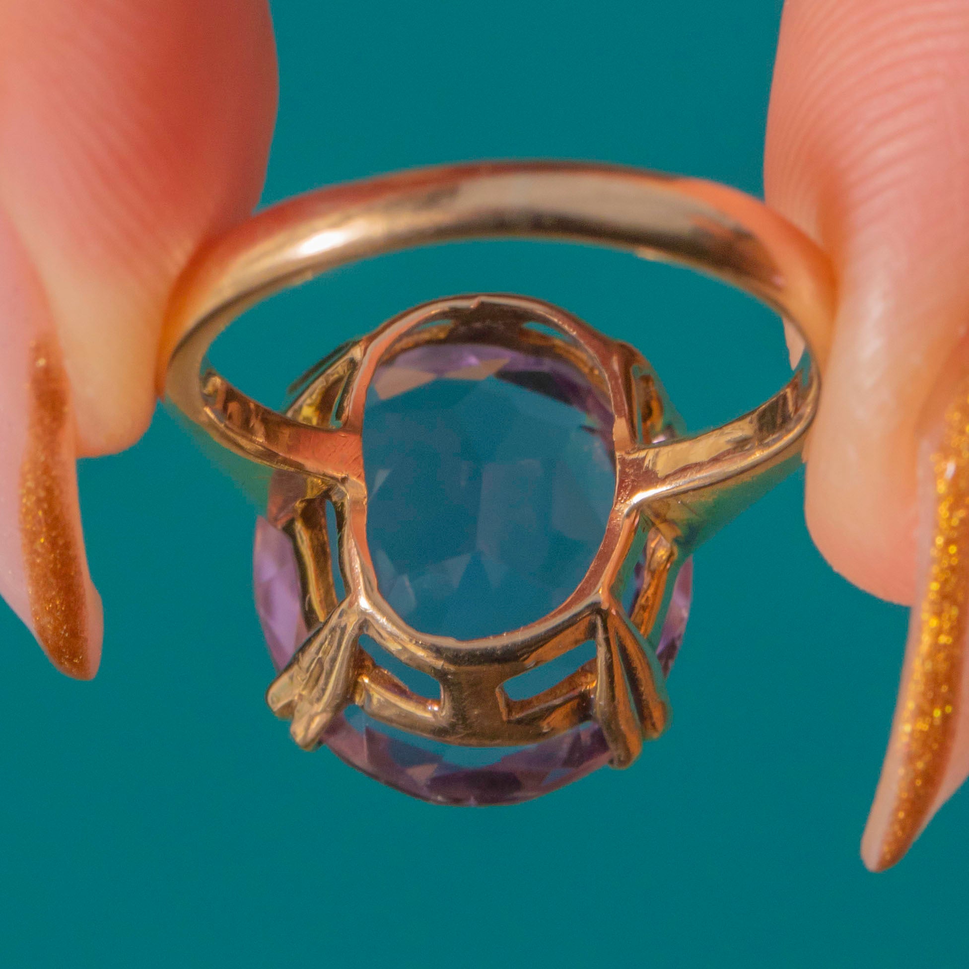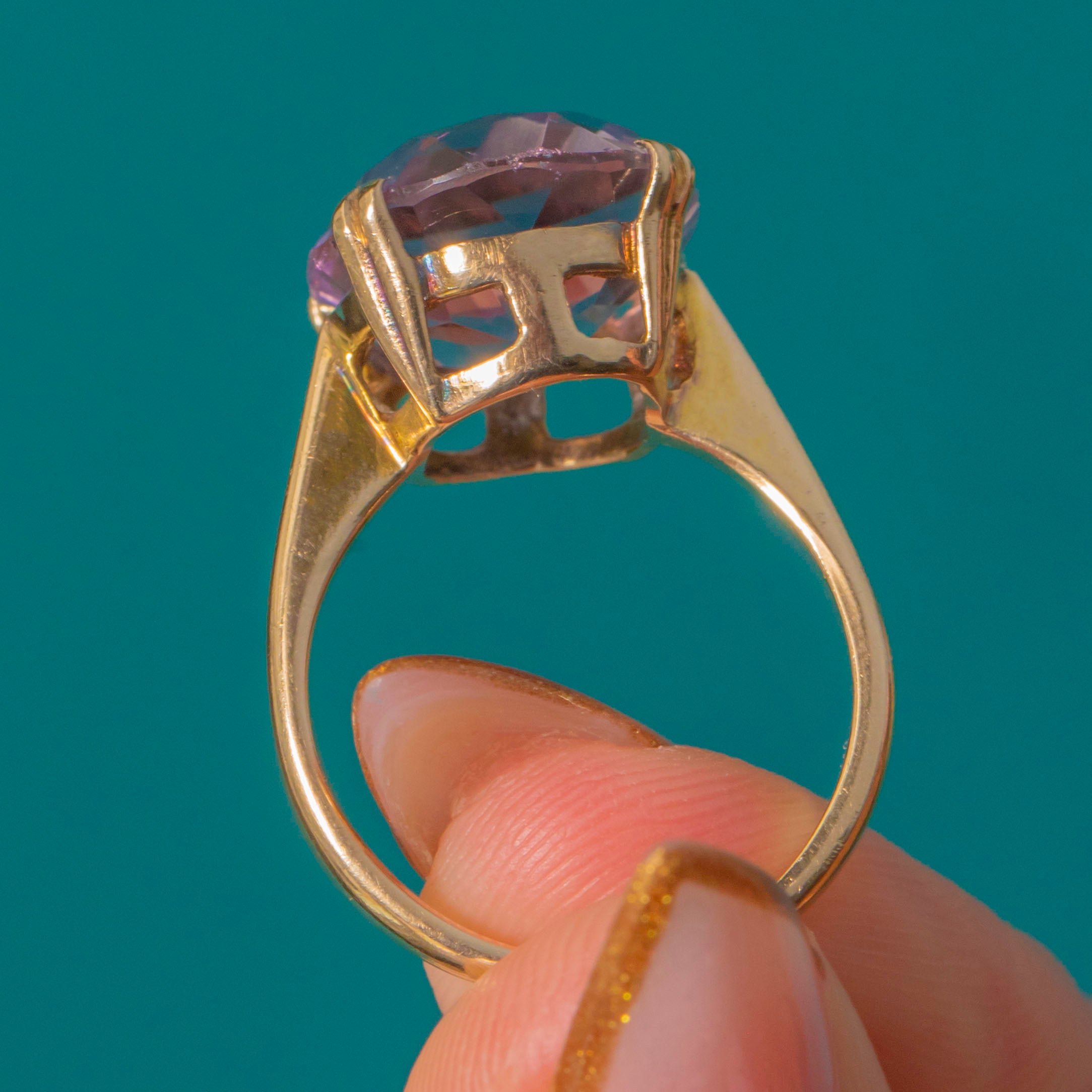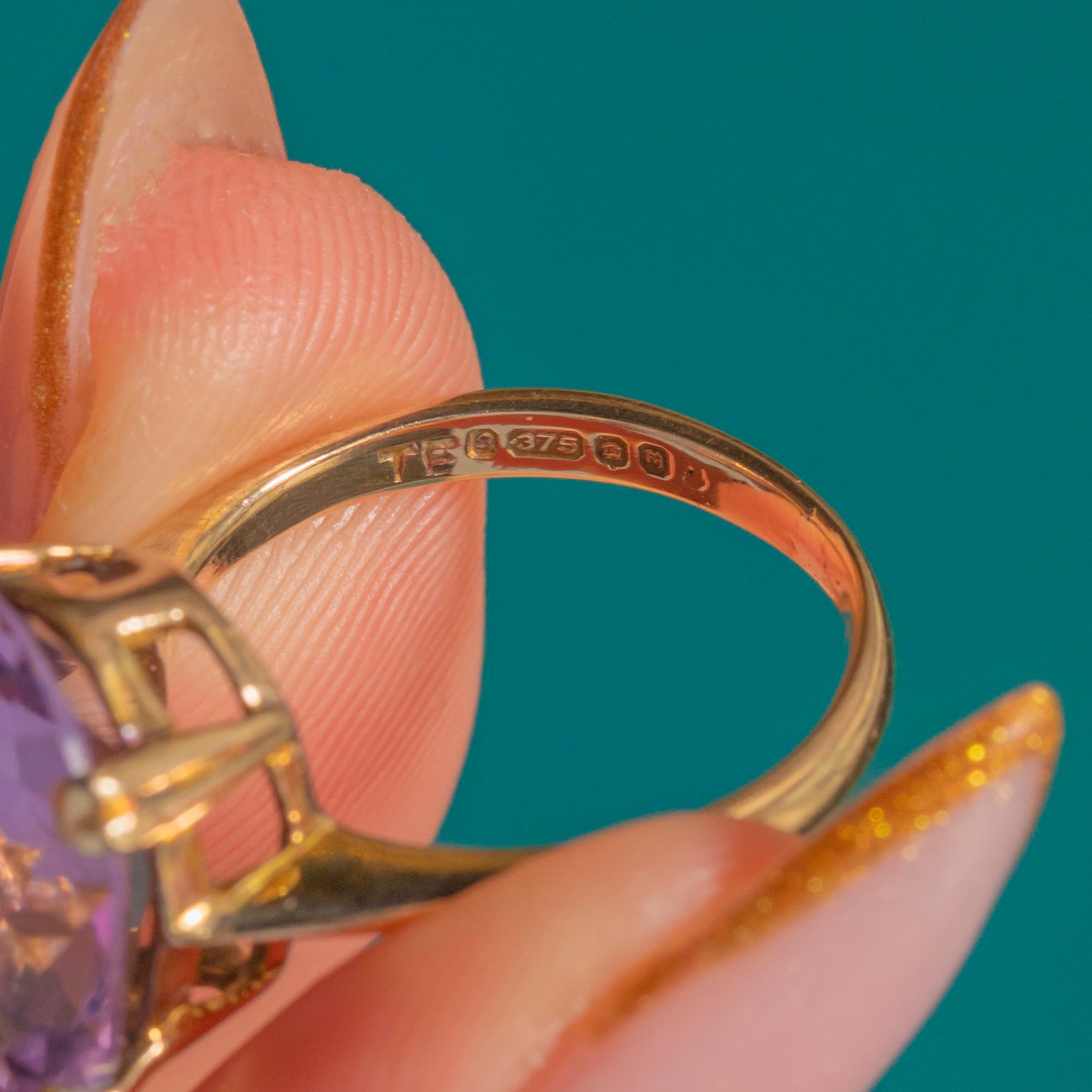 EXCELLENT: The Amethyst is bright and clean, free from noticeable chips or abrasions. The Gold band and setting are in superb vintage condition, with minimal signs of wear. A beautifully preserved 1960s statement ring ready to enjoy.