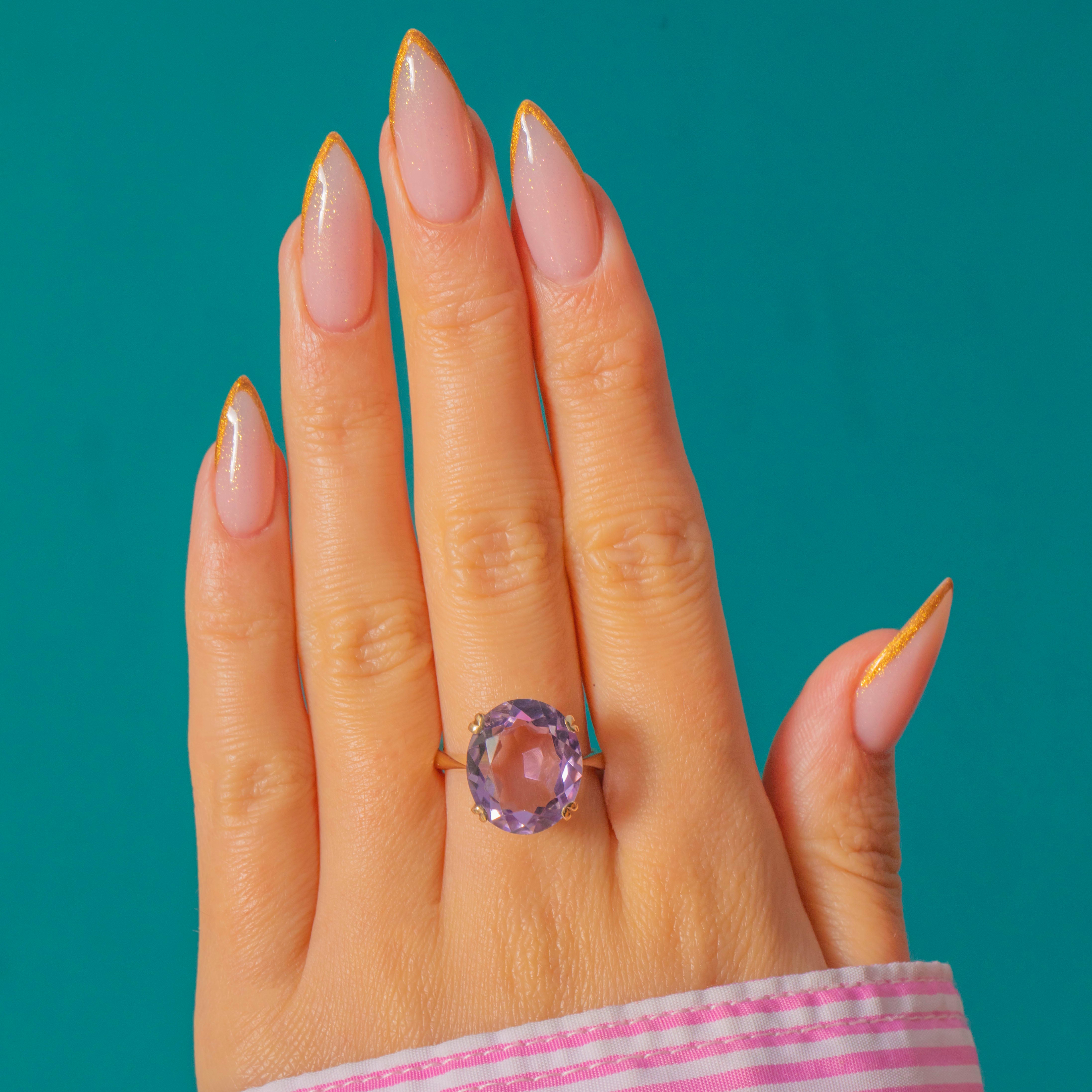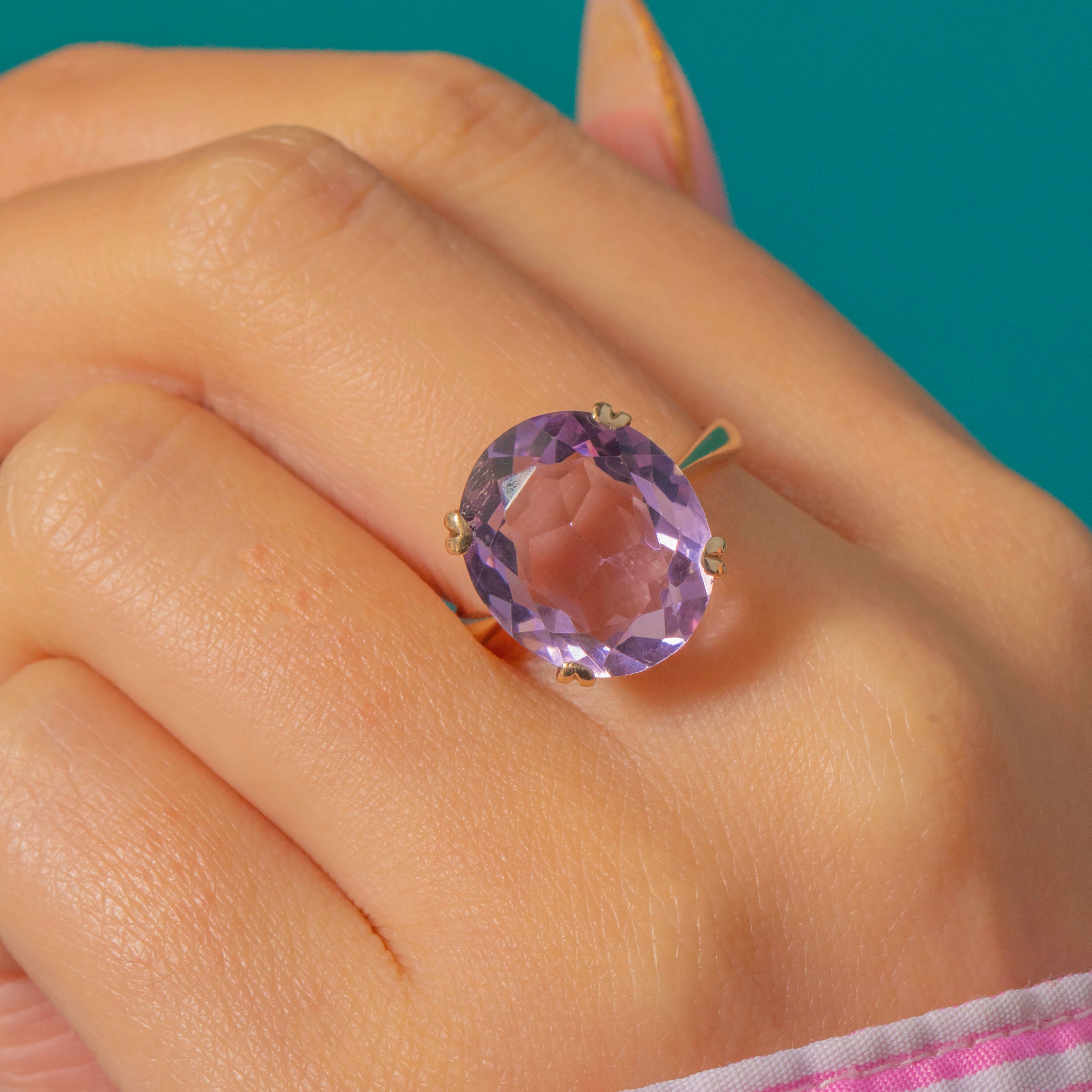This striking Mid-Century ring features a captivating 3.60ct Rose De France Amethyst, glowing with the softest lilac tones. The oval-cut stone is beautifully faceted to catch the light, radiating pastel charm that feels both romantic and effortlessly chic.