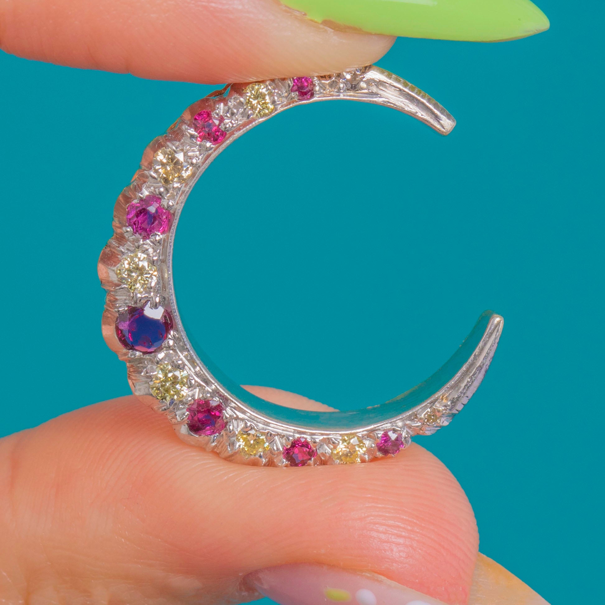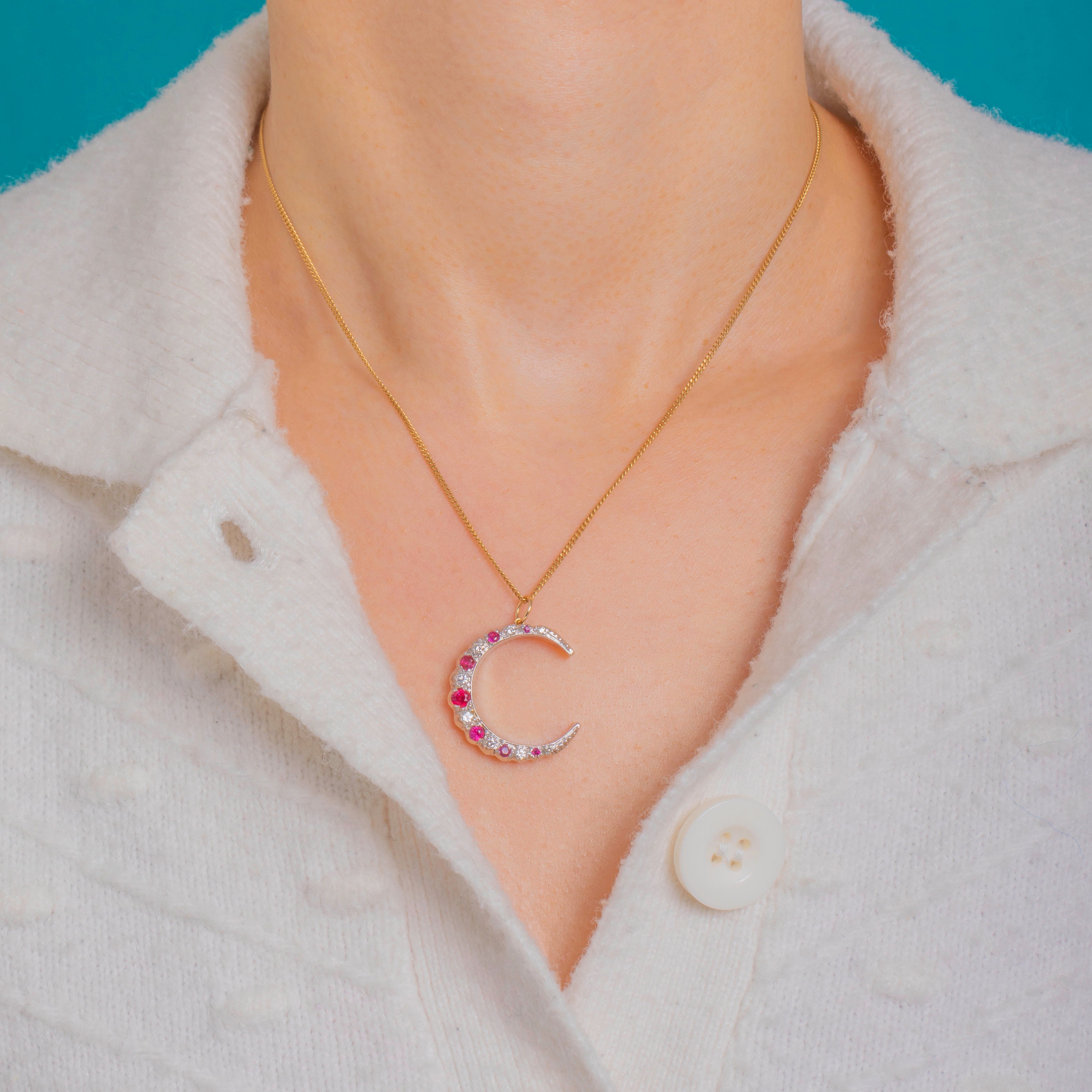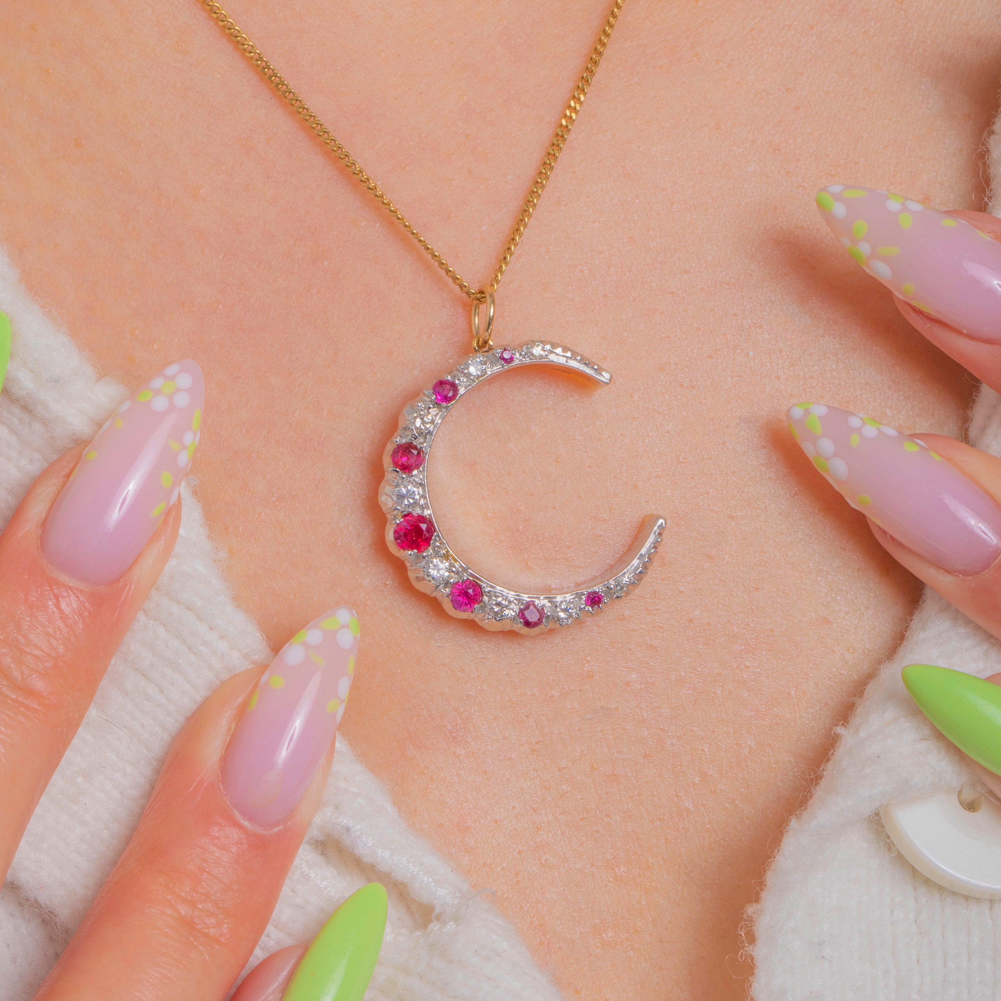 A celestial classic with a chic two‑tone twist, this Vintage crescent moon pendant is crafted in white and yellow 9ct Gold and swept with a glittering arc of Rubies and Diamonds. The gemstones graduate beautifully along the curve, the vivid pink‑red of the Rubies singing against the crisp Diamond sparkle for a look that’s delicate, romantic and refined.