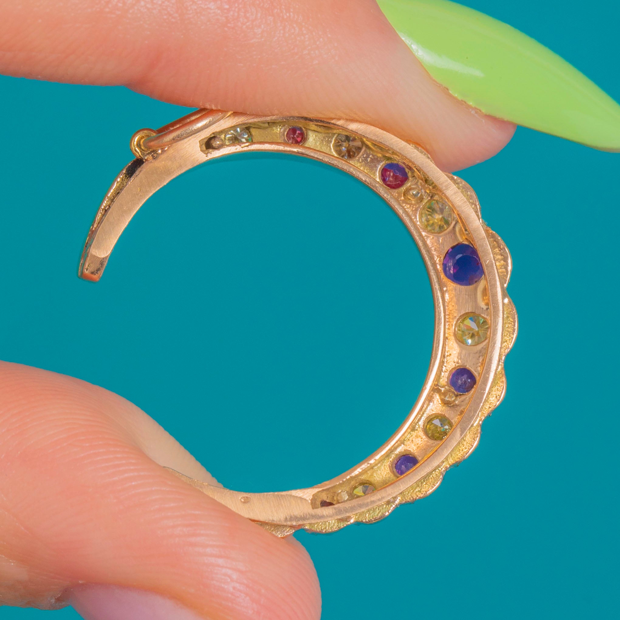 VERY GOOD: Bright, lively gemstones with minimal wear and no chips seen to the unaided eye; Diamonds display a slight warm/yellow tone. The crescent and settings are secure with light surface wear commensurate with age.