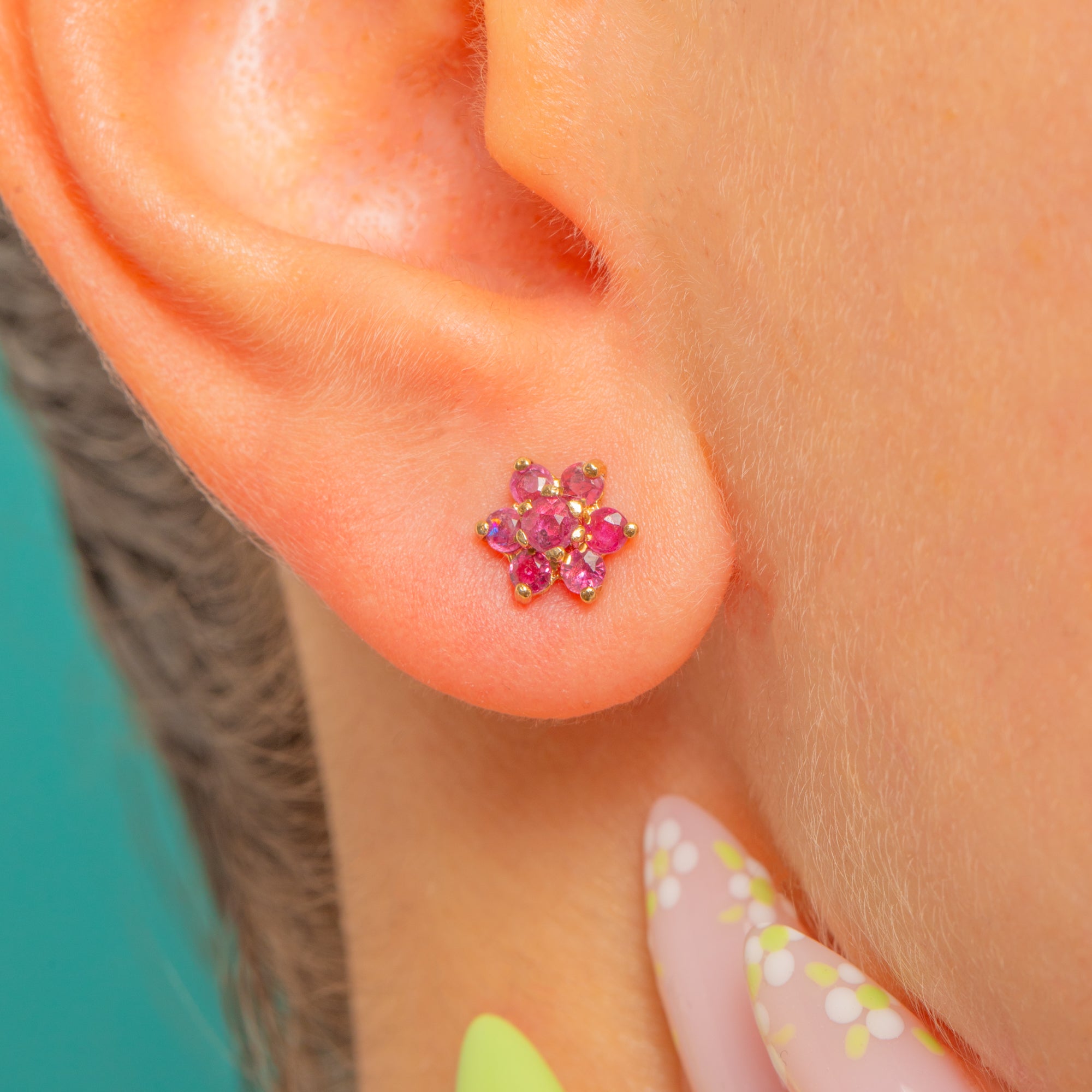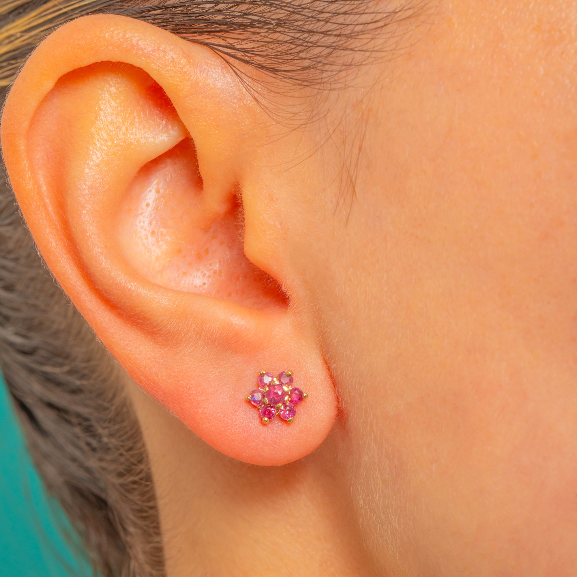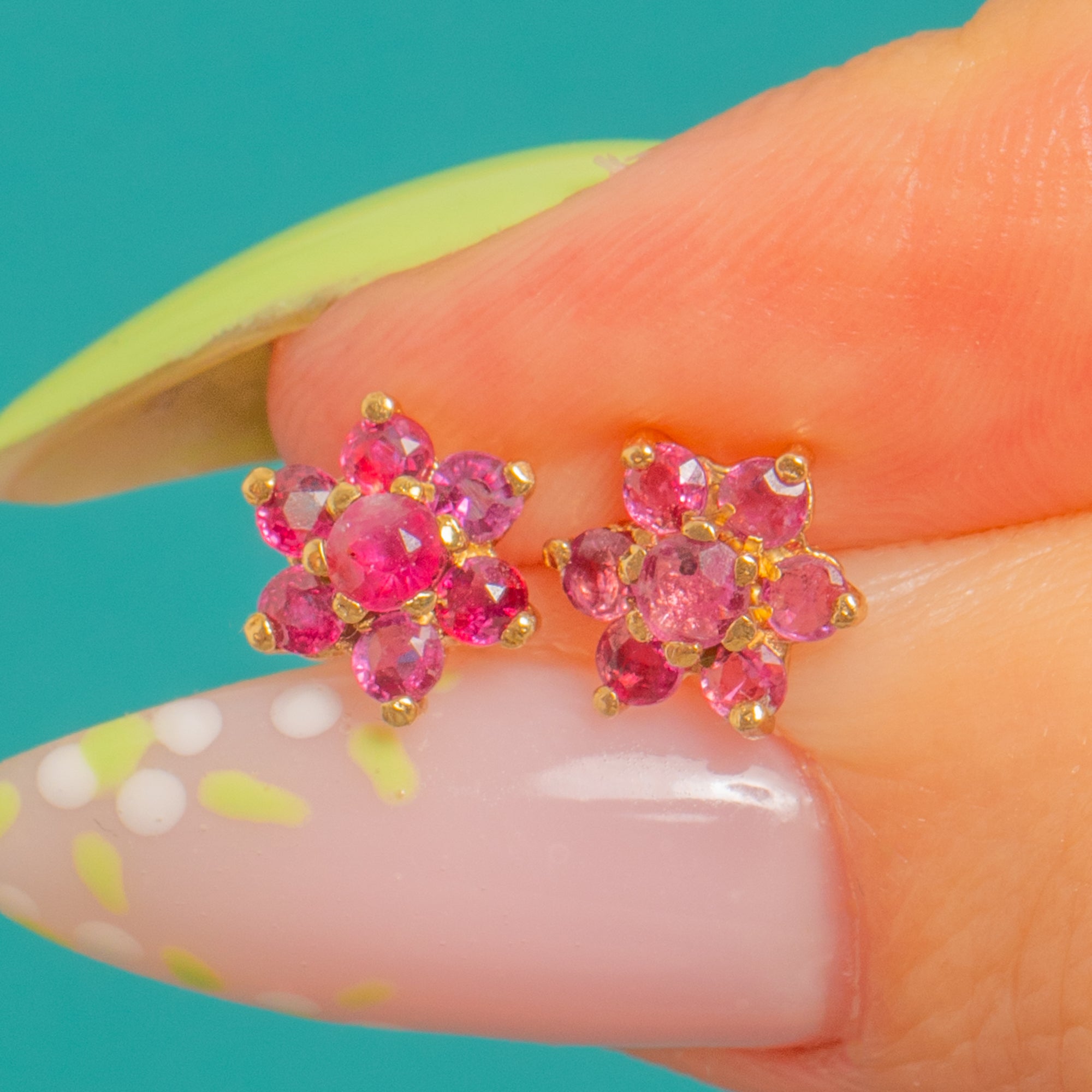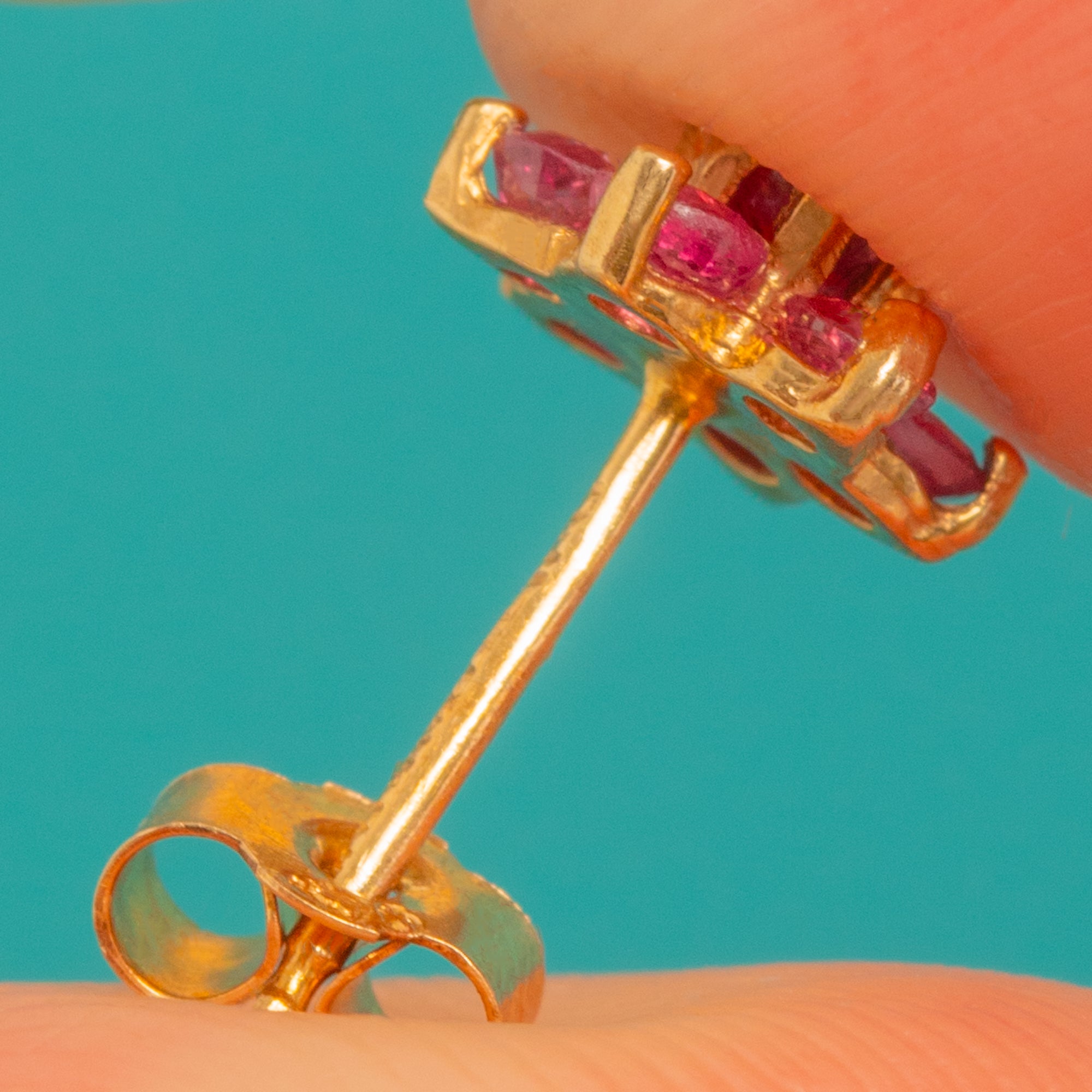 Pretty as a posy, these Vintage 9ct Gold Ruby cluster stud earrings are a timeless everyday delight. Each petite flower is composed of a lively central Ruby encircled by six matching stones, creating a classic rosette that shimmers in rich pinkish-red hues against warm 9ct Gold.