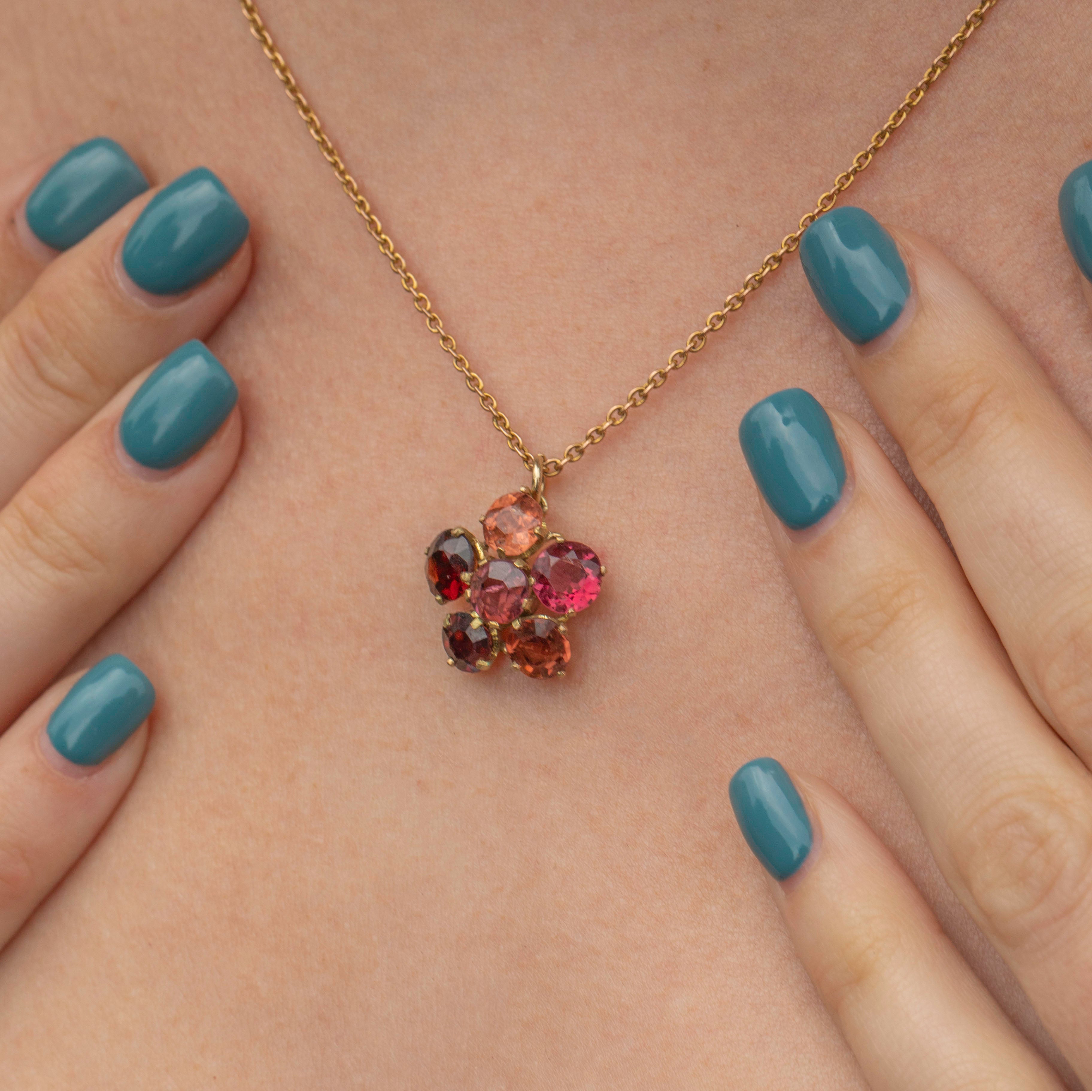 This 9ct Gold Ruby and Topaz multi-gemstone pendant showcases the most delightful Tutti-Frutti-inspired palette. This Vintage flower pendant will certainly be bringing a burst of mouthwatering colour to your antique jewellery collection.