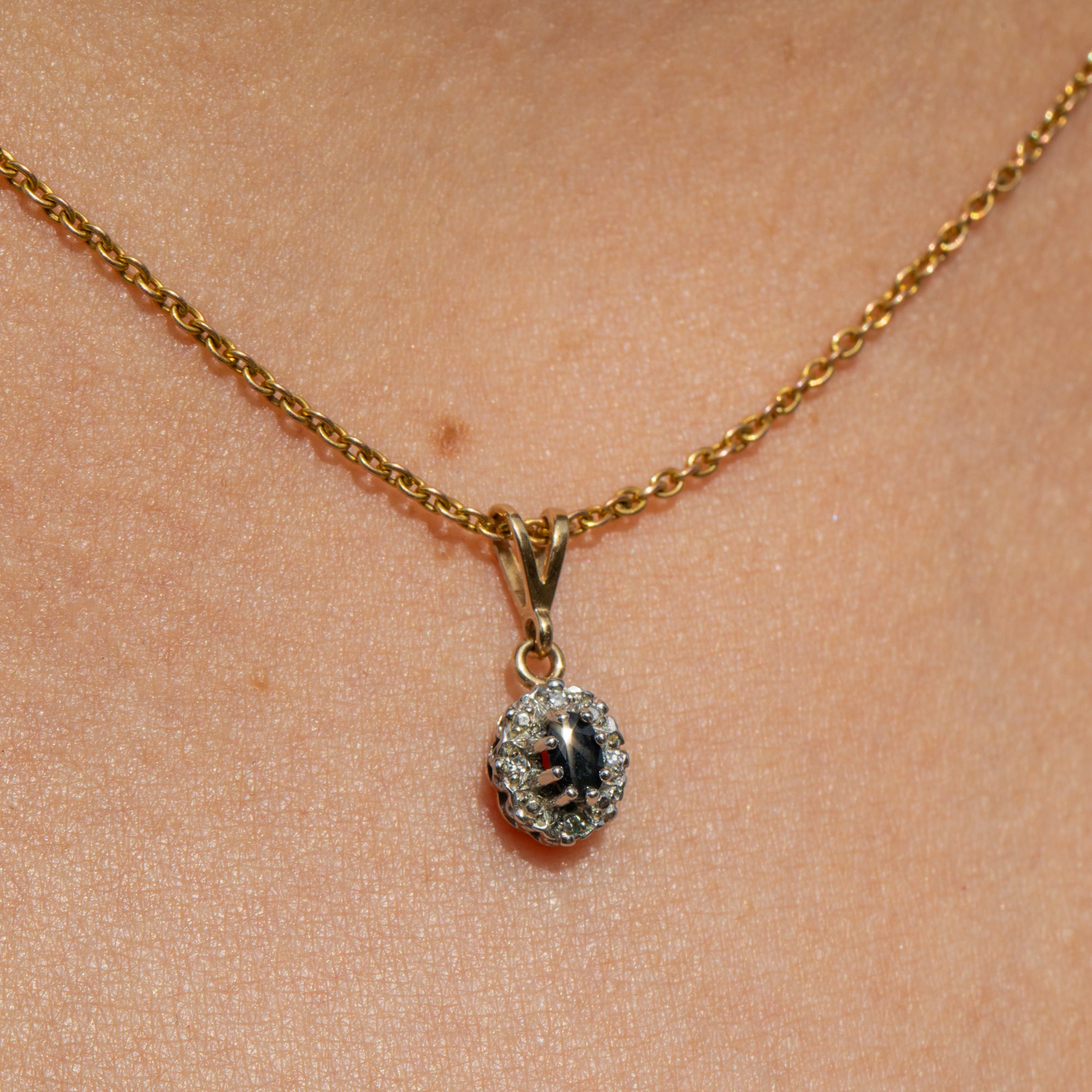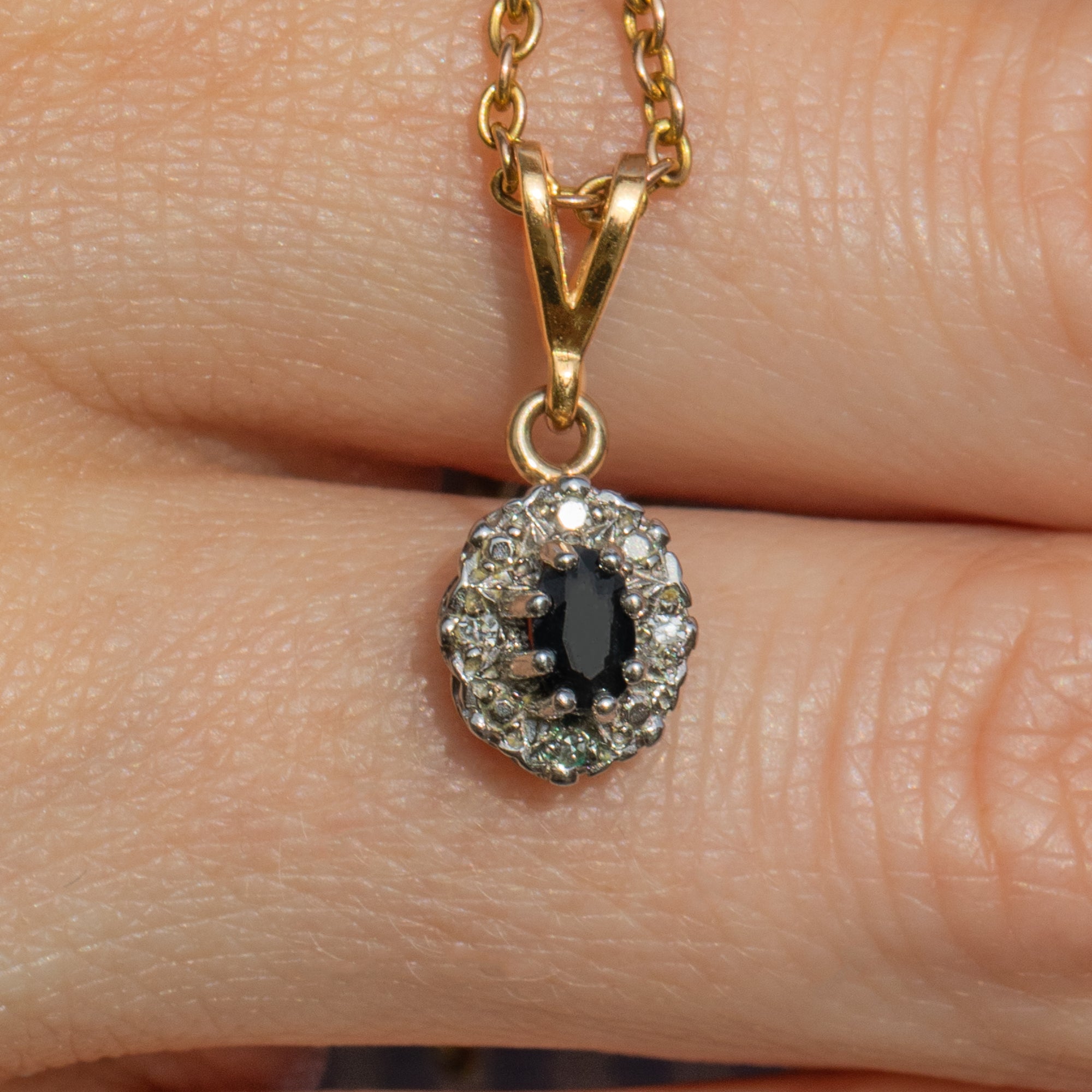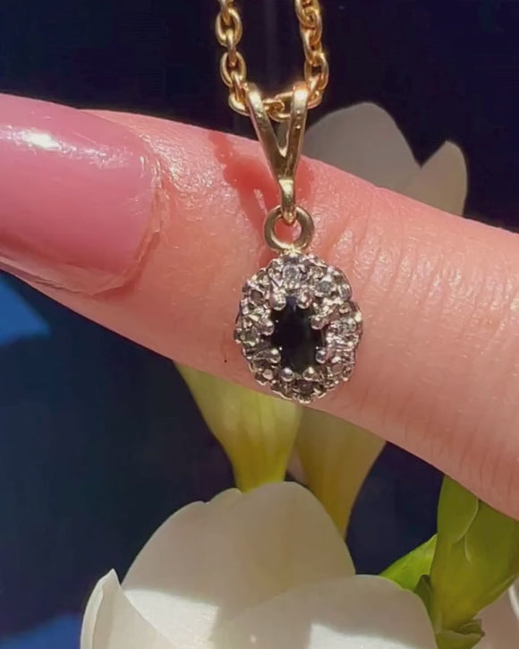 EXCELLENT. This 9ct Gold Sapphire & Diamond cluster charm is in excellent condition! The Sapphire and Diamonds are all securely set and free from chips or abrasions. The body of the pendant is robust promising many more years of wear and the large bale is securely affixed allowing you to wear this luxurious piece confidently!