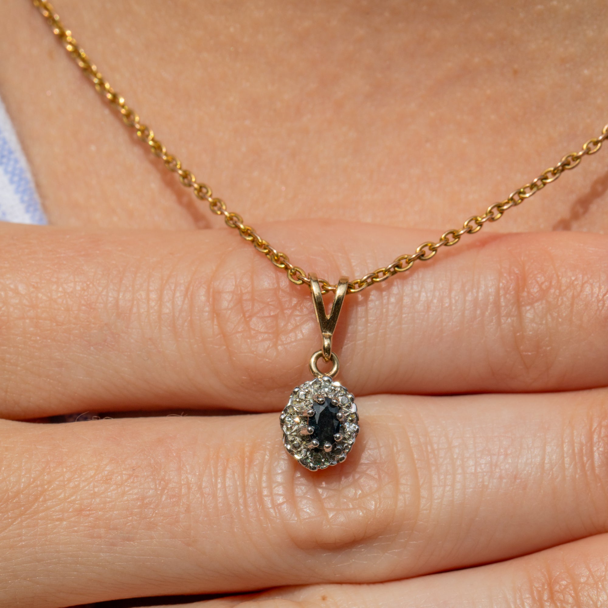 Add a touch of splendour to your outfit with this scintillating 9ct Gold Sapphire & Diamond cluster charm! Exquisitely crafted from buttery 9ct Gold, this vintage beauty is set with a midnight blue Sapphire with a halo of Diamonds in lustrous white Gold settings.