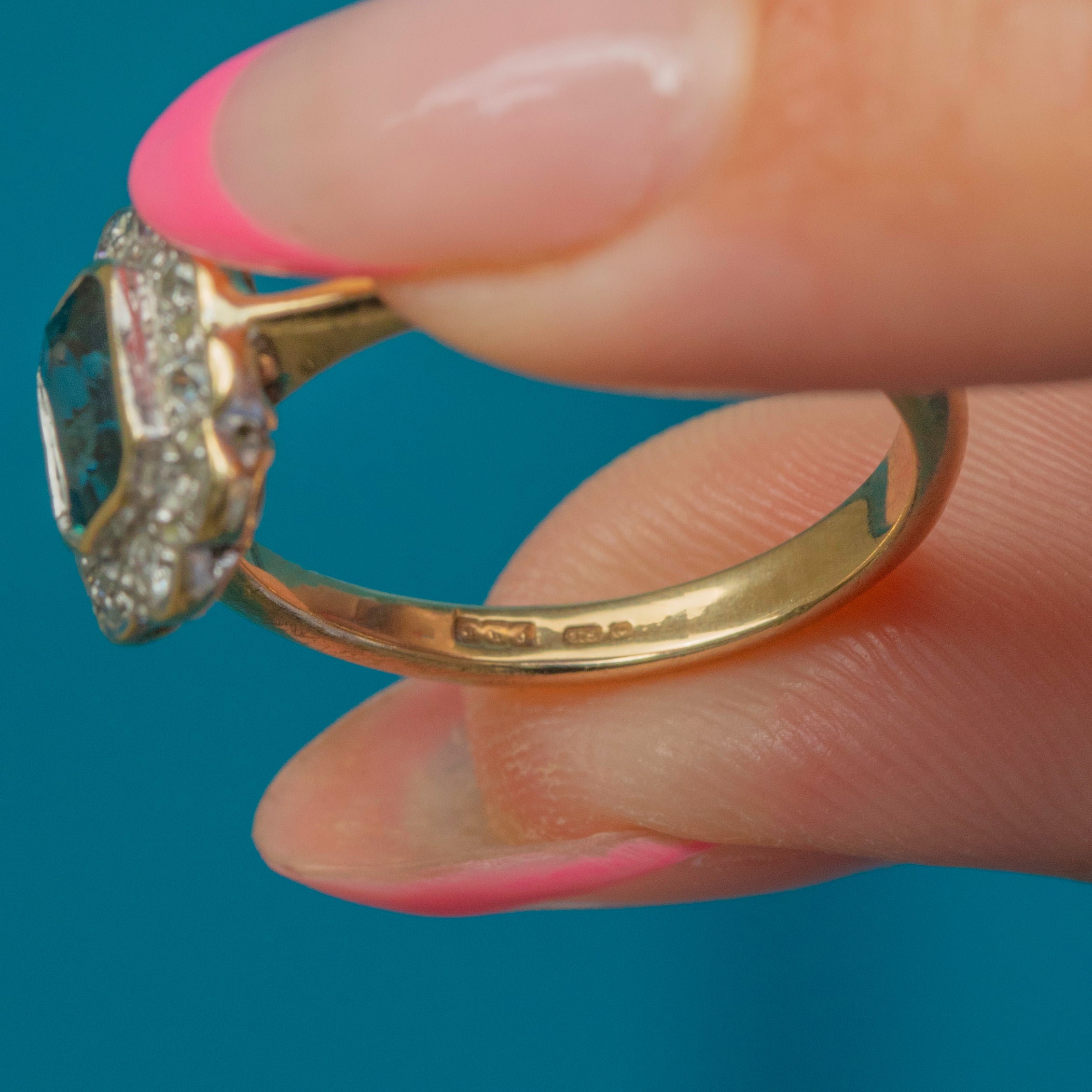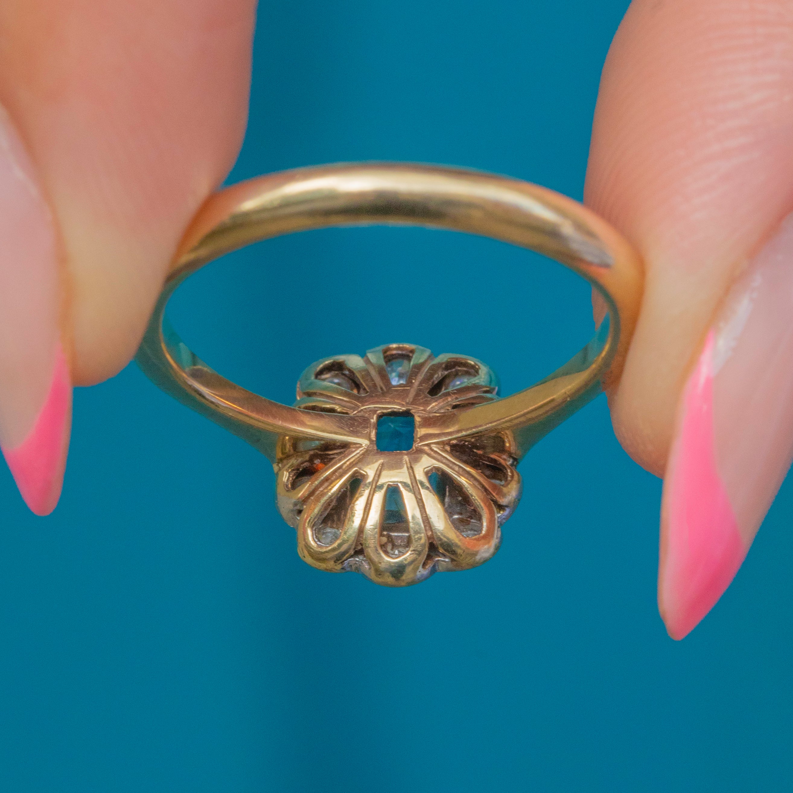 Each gemstone rests on a buttery 9ct Gold band, the warmth marrying the cool tones of the Sapphire and Diamonds effortlessly. A wonderful piece to add a touch of glamour to your attire, this vintage cluster ring is a must-have!