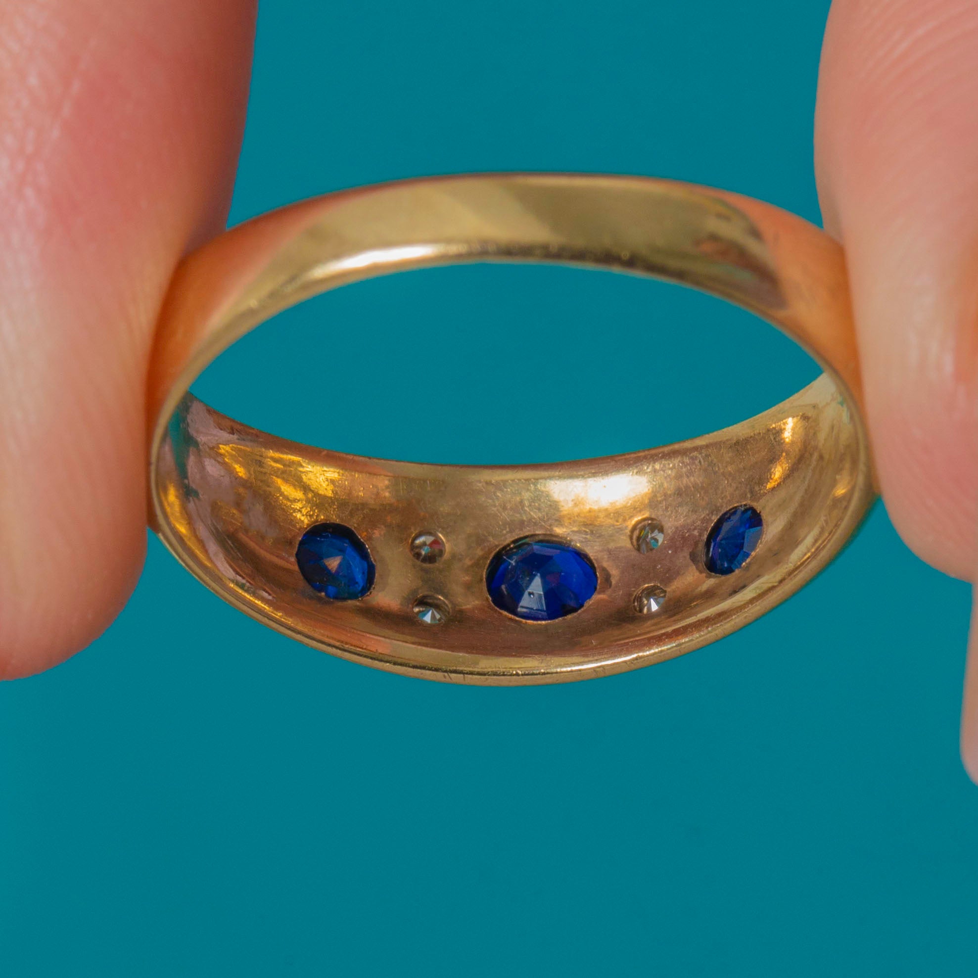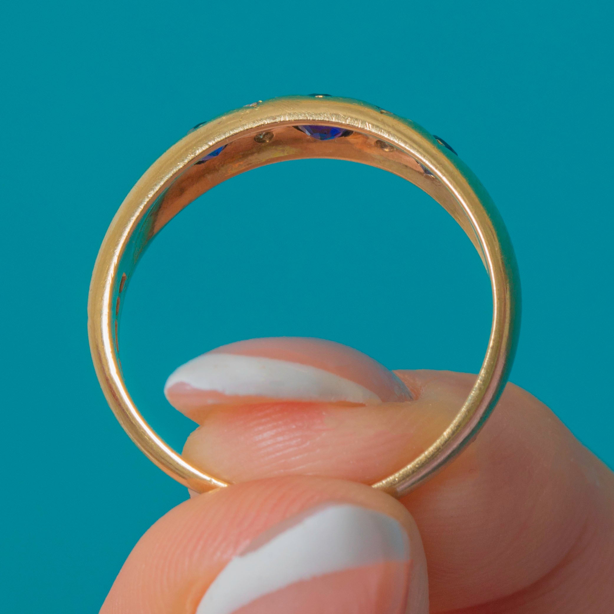 EXCELLENT: The Sapphires and Diamonds are bright and securely set with no chips or visible wear. The Gold band shows only minimal surface marks in line with age and has clearly been well cared for.
