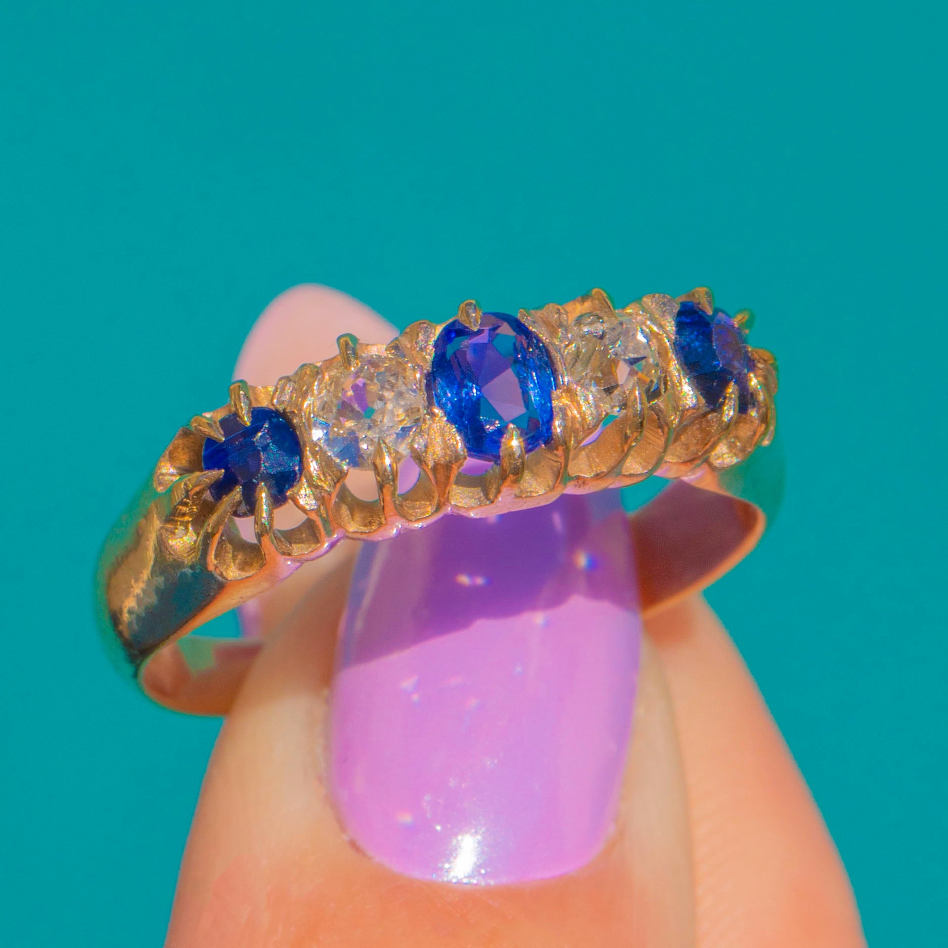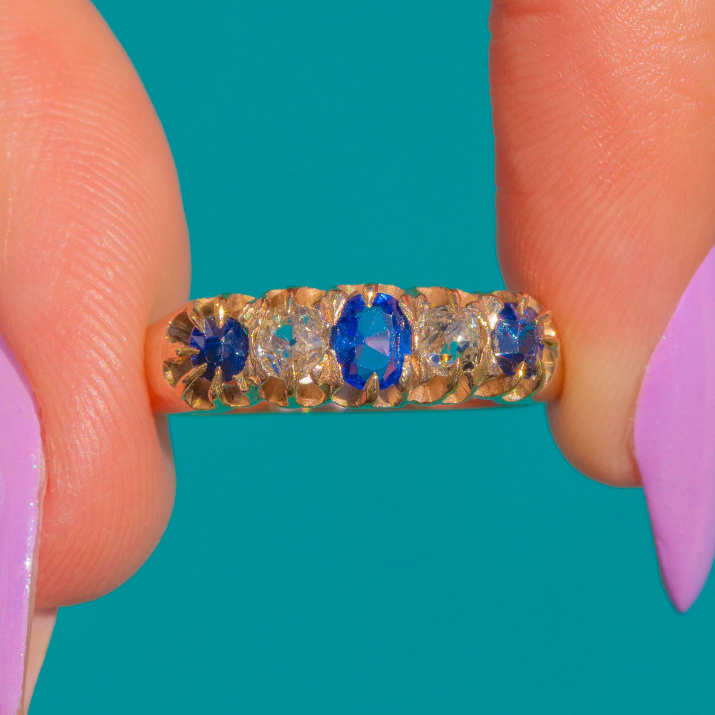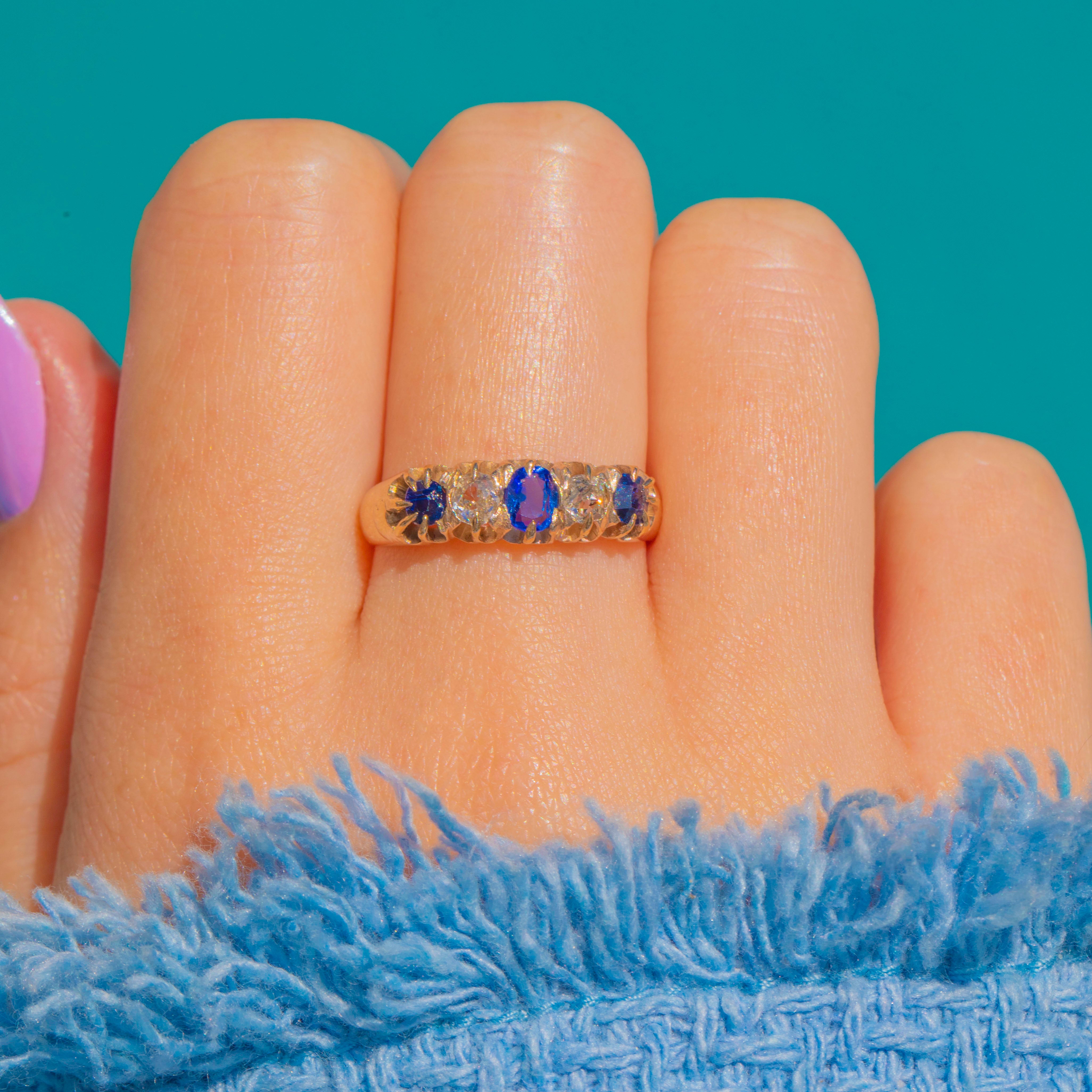 A timeless Victorian five-stone ring in 9ct Gold, set with a beautifully balanced row of Sapphires and Diamonds. A deep blue oval Sapphire takes centre stage, flanked by bright white round Diamonds and finished with two smaller round Sapphires at the shoulders for a classic alternating rhythm of colour and light.