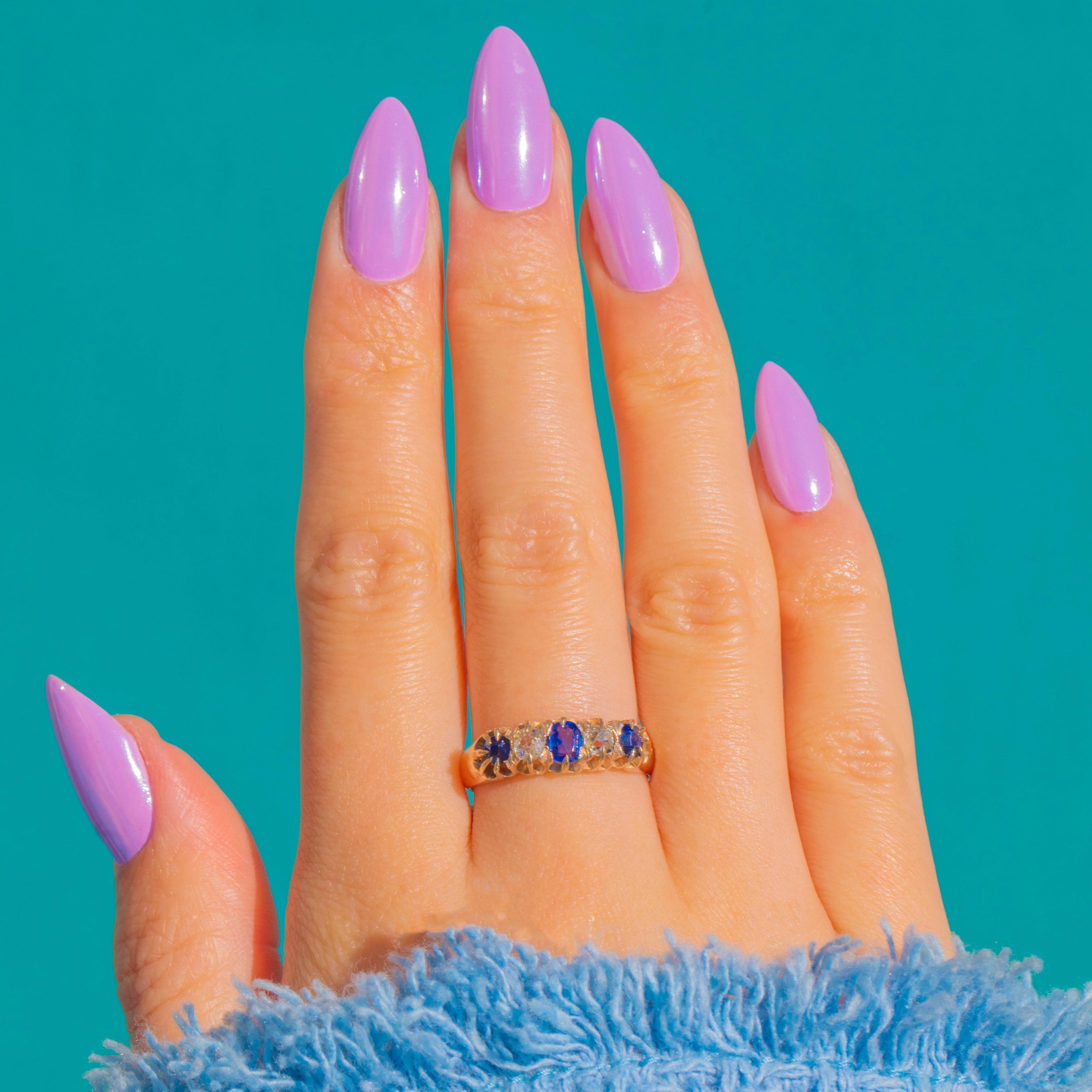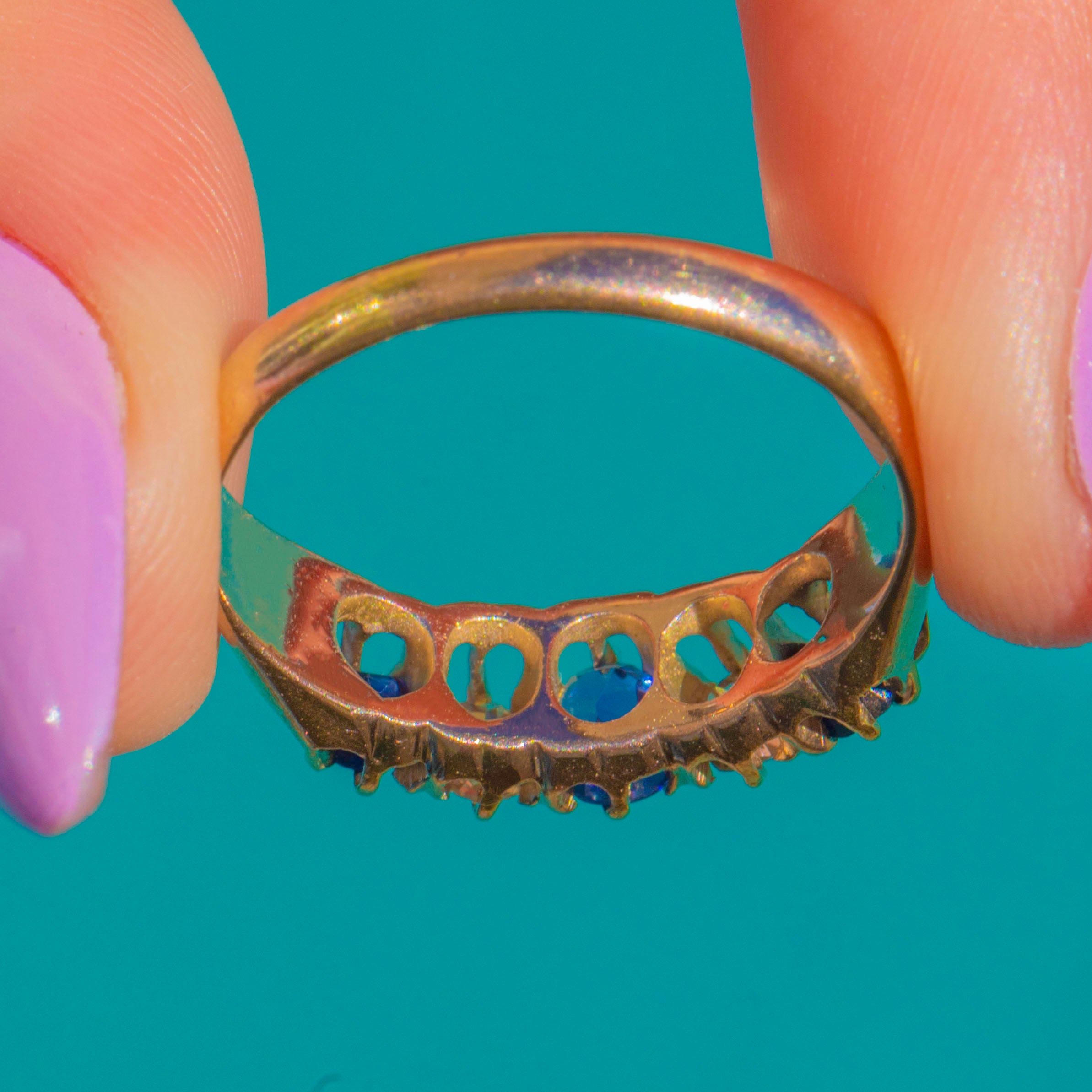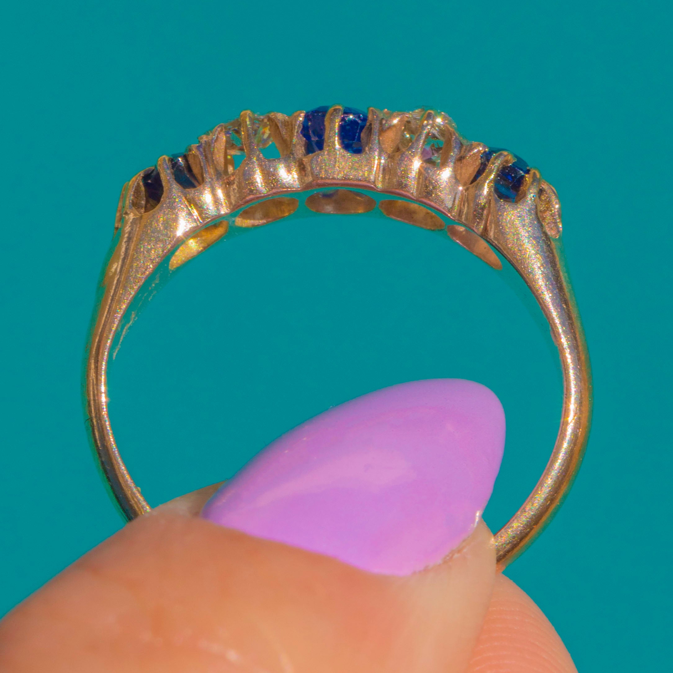 A timeless Victorian five-stone ring in 9ct Gold, set with a beautifully balanced row of Sapphires and Diamonds. A deep blue oval Sapphire takes centre stage, flanked by bright white round Diamonds and finished with two smaller round Sapphires at the shoulders for a classic alternating rhythm of colour and light.