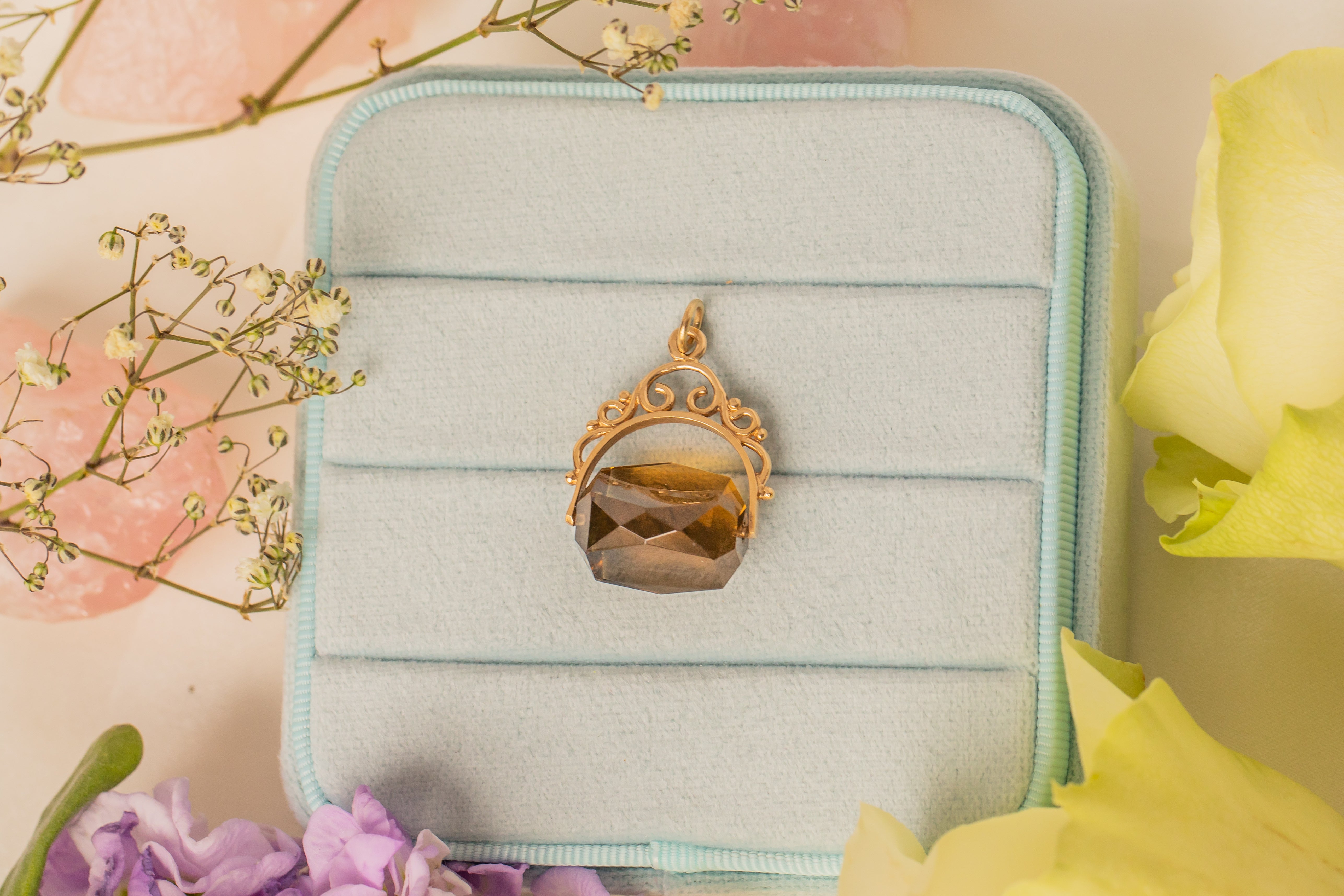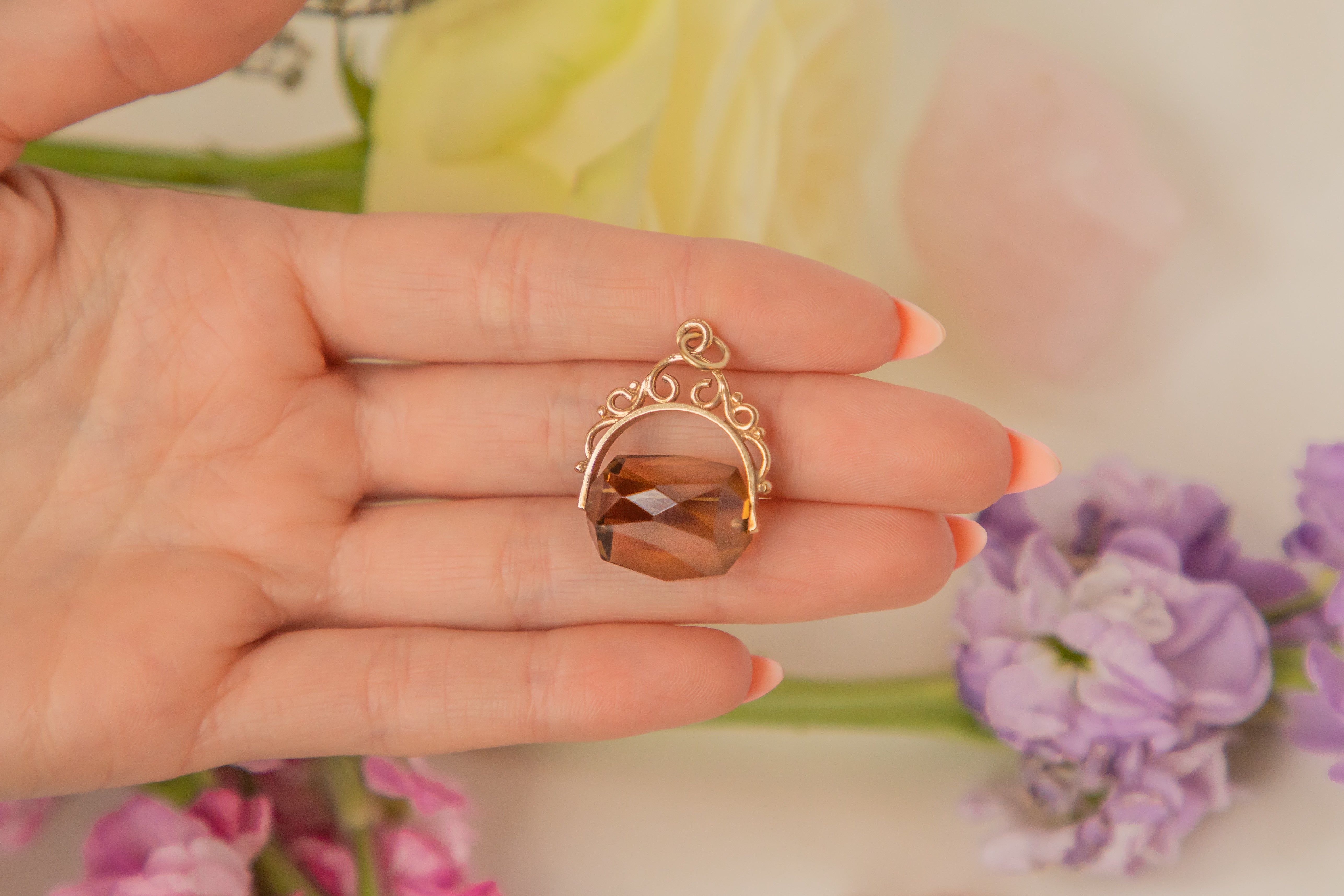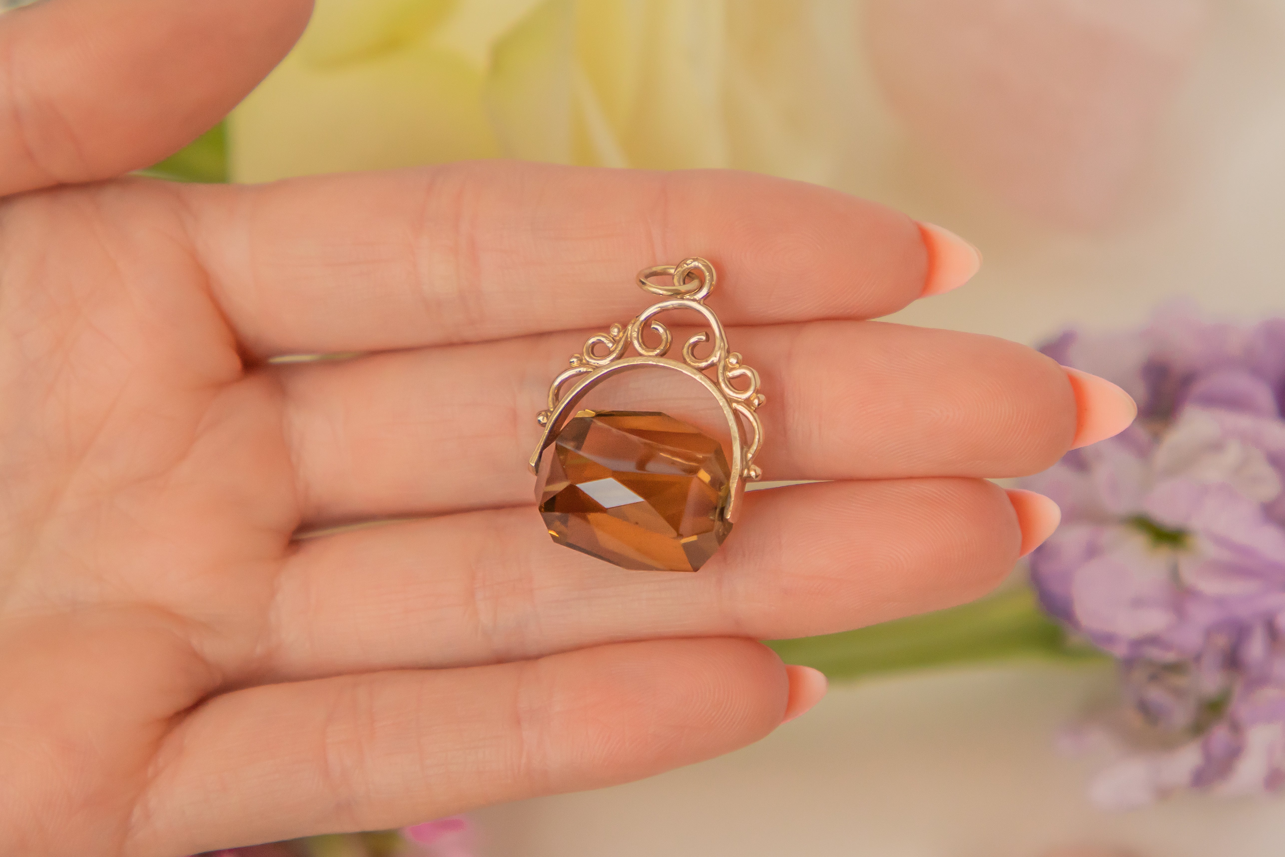 Become enticed by the mocha hues that stream through the facets of this 9ct Gold smokey Quartz spinner fob! With a satisfying spin, her tantalising tones catch the light perfectly, streaming in one side and pouring directly out the other.