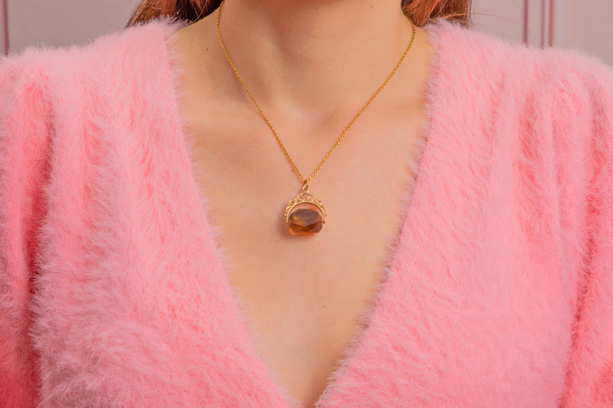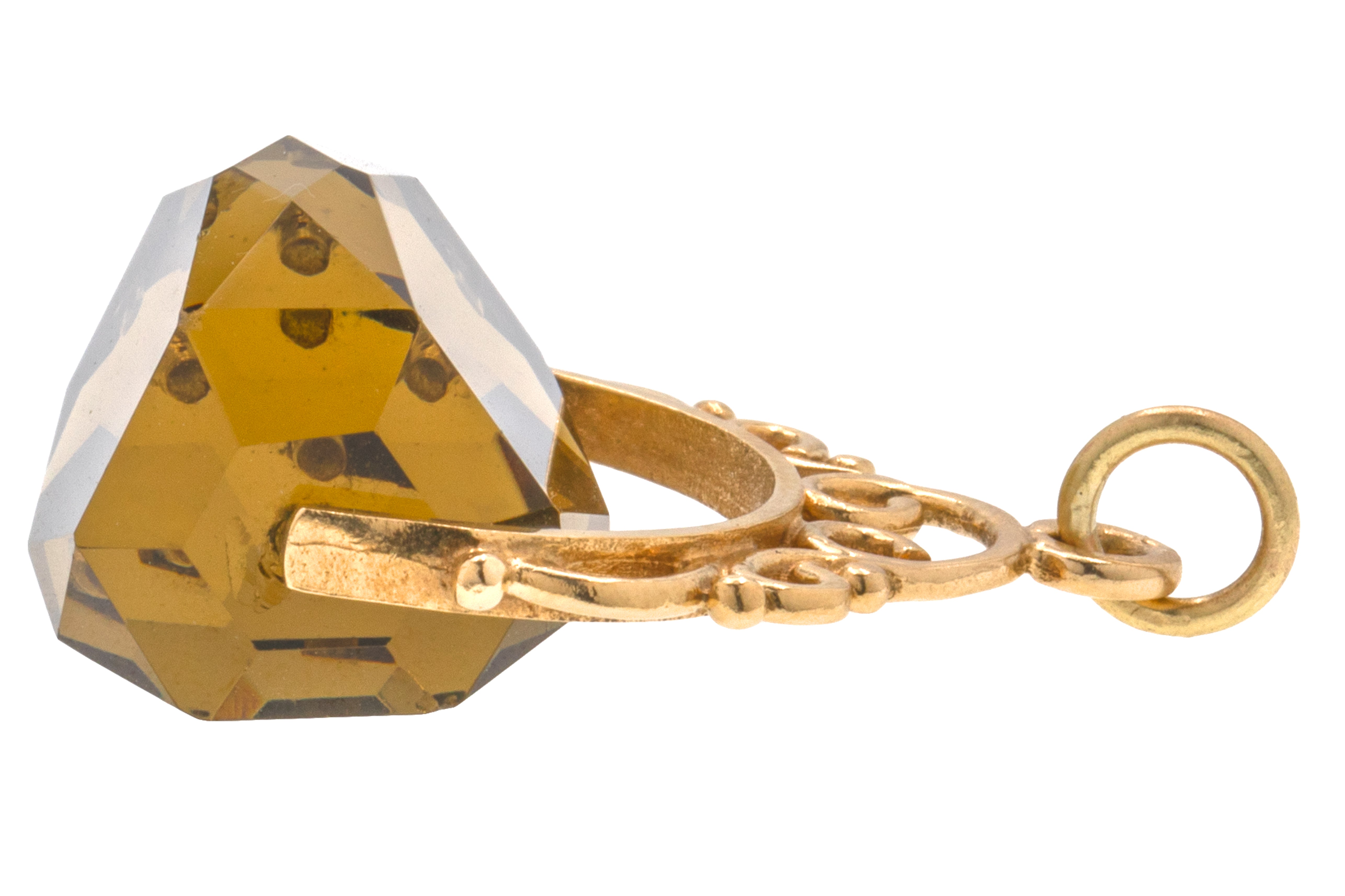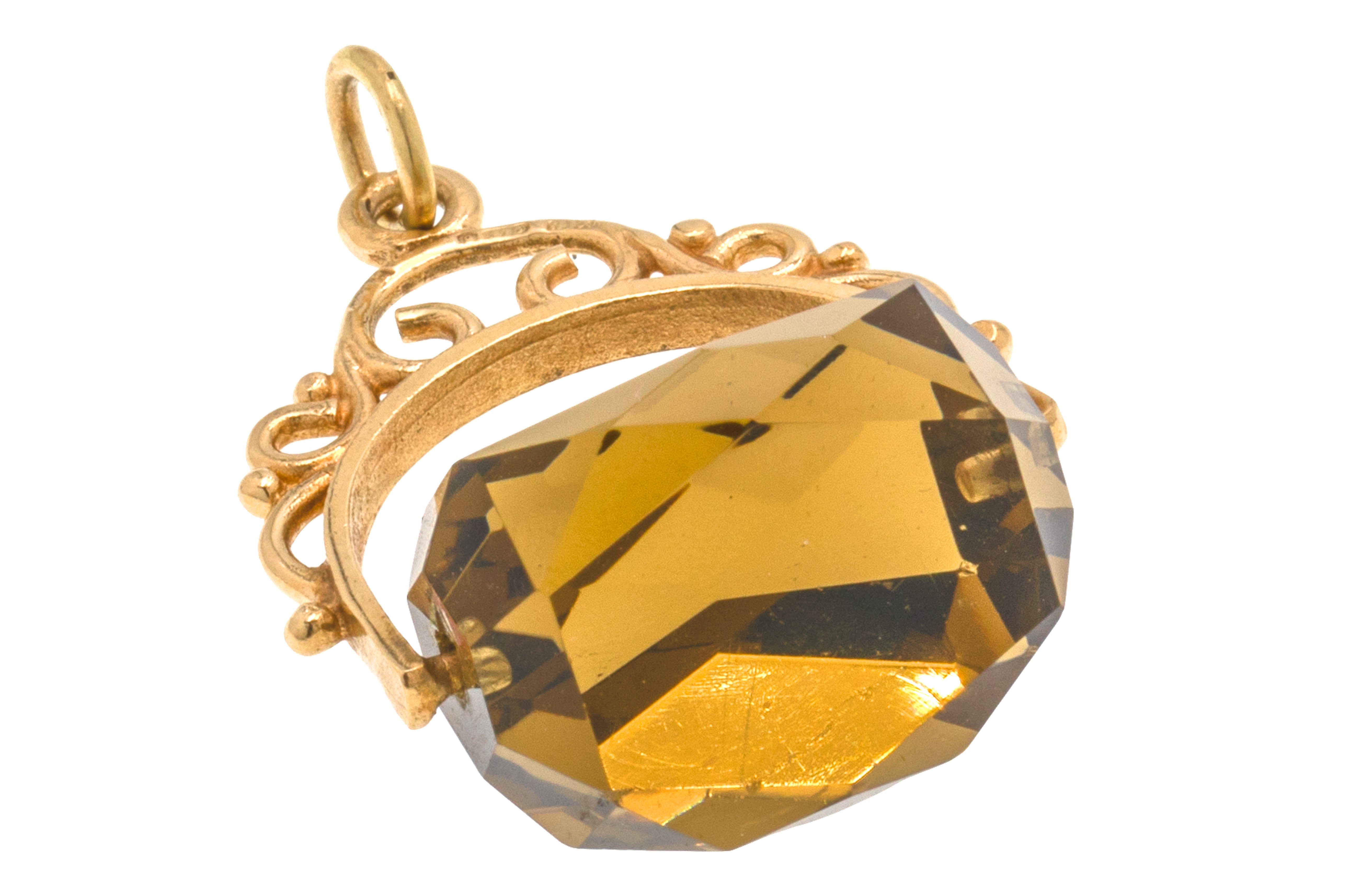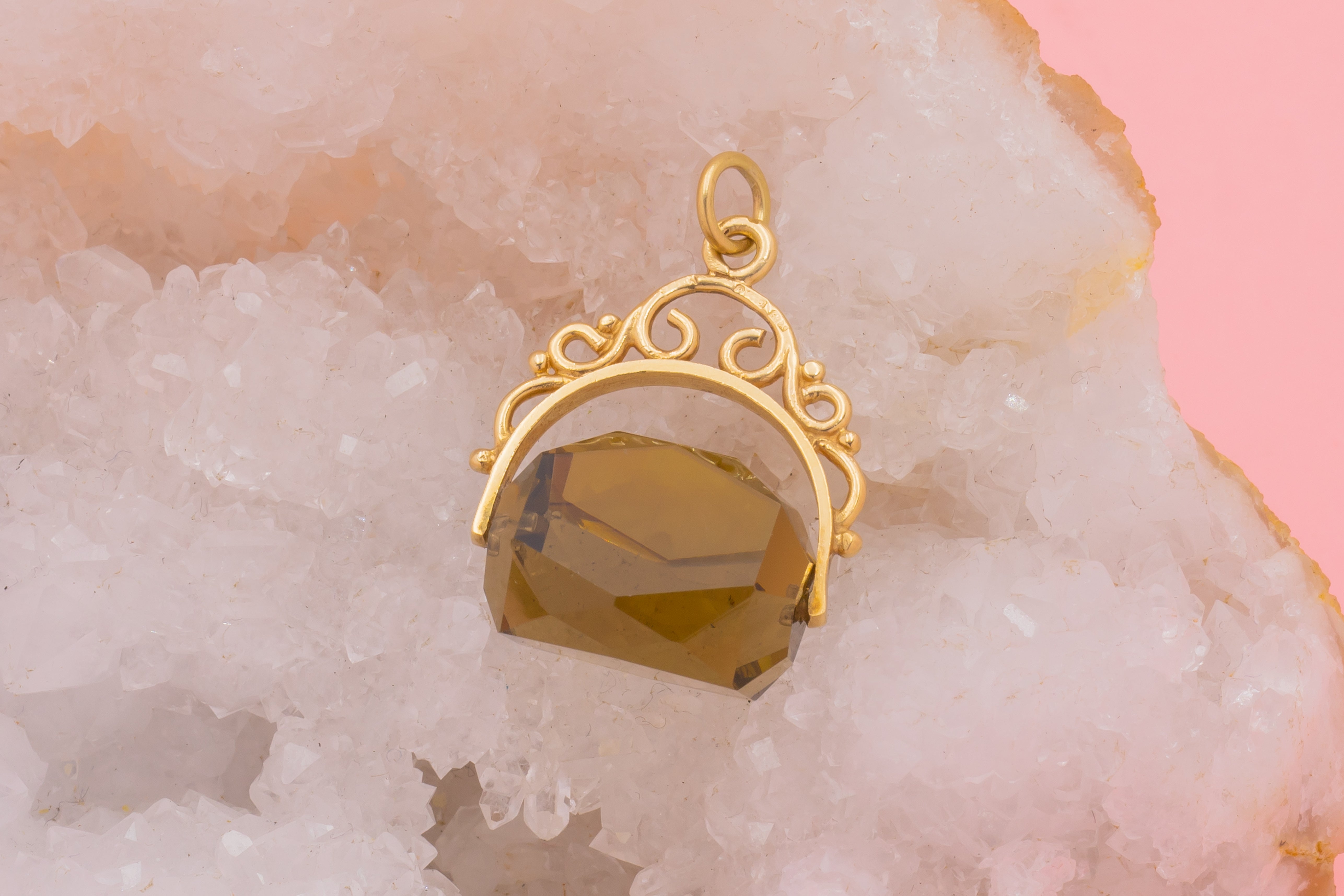 Become enticed by the mocha hues that stream through the facets of this 9ct Gold smokey Quartz spinner fob! With a satisfying spin, her tantalising tones catch the light perfectly, streaming in one side and pouring directly out the other.