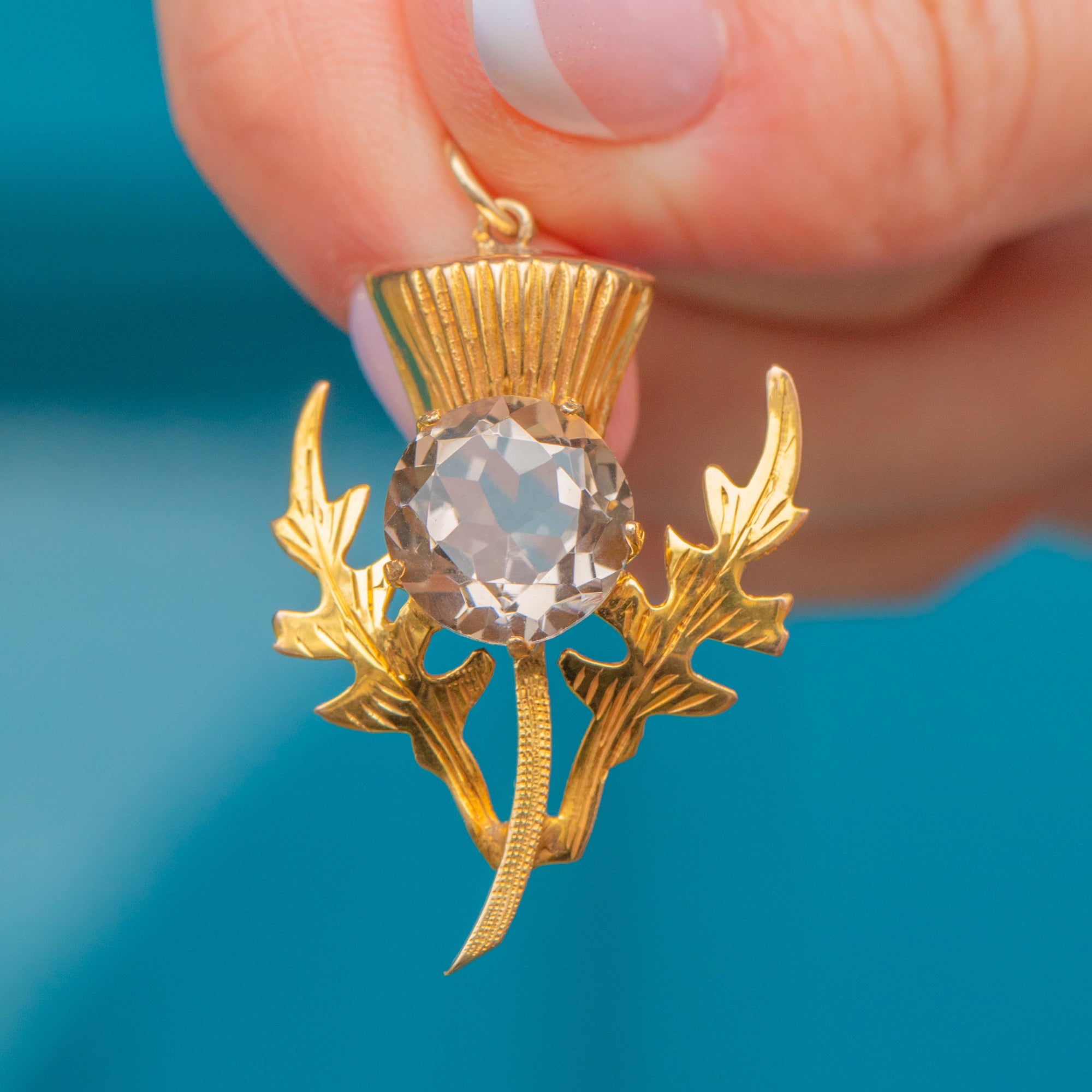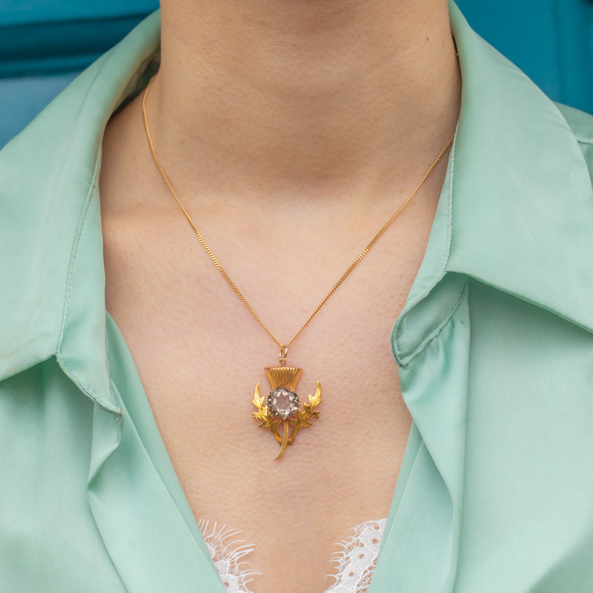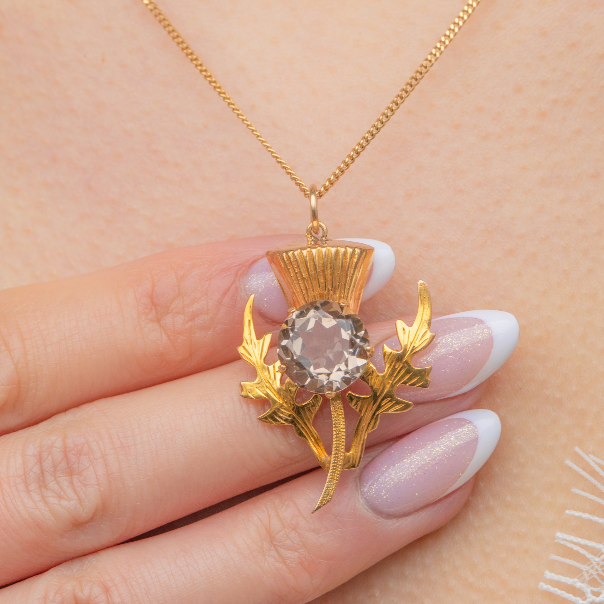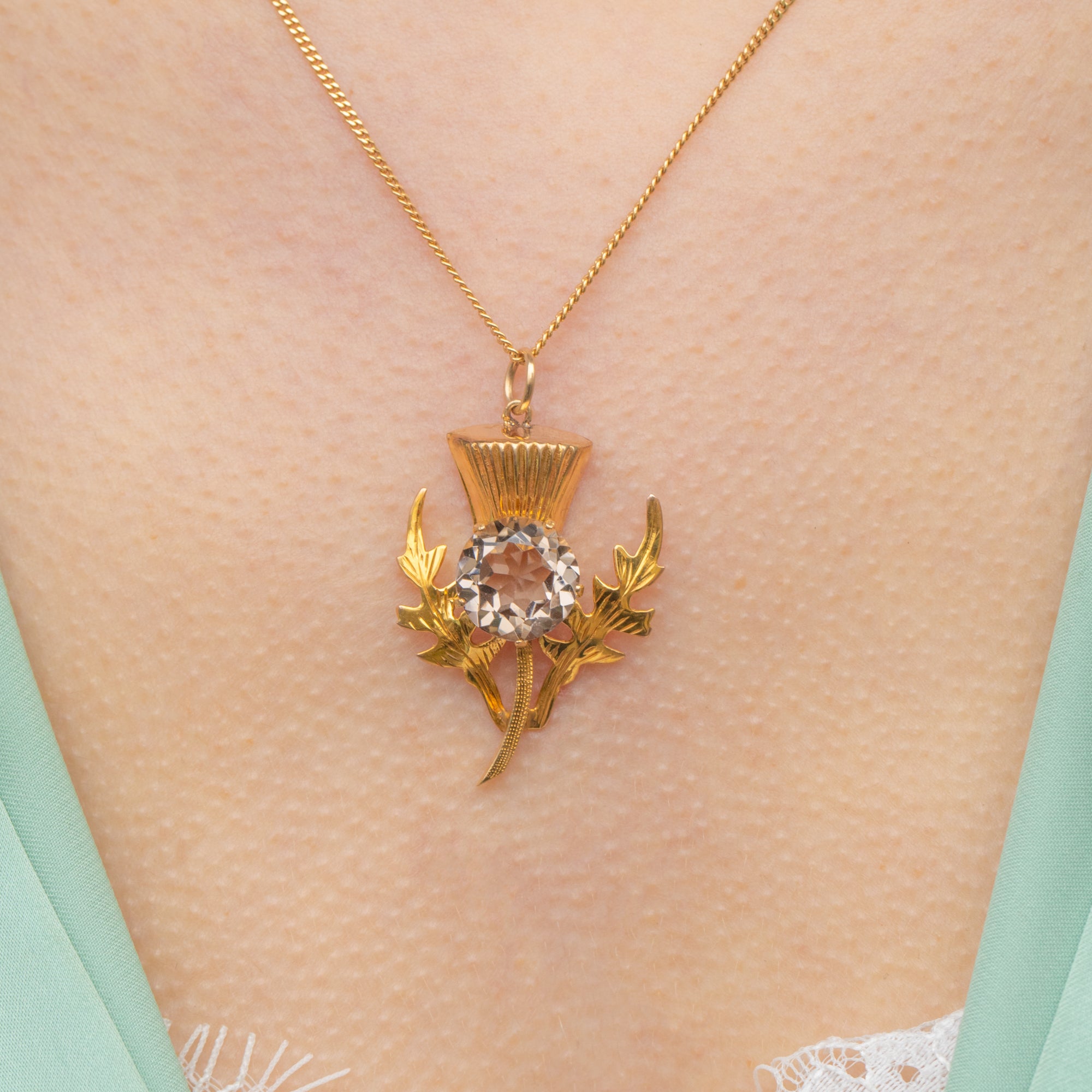 EXCELLENT: This 9ct Gold Smoky Quartz Scottish thistle pendant is in excellent condition! The Smoky Quartz sits securely in its claw settings and remains fabulously faceted. The thistle detailing is crisp and bright, rendering her a wonderful addition to your jewellery collection!