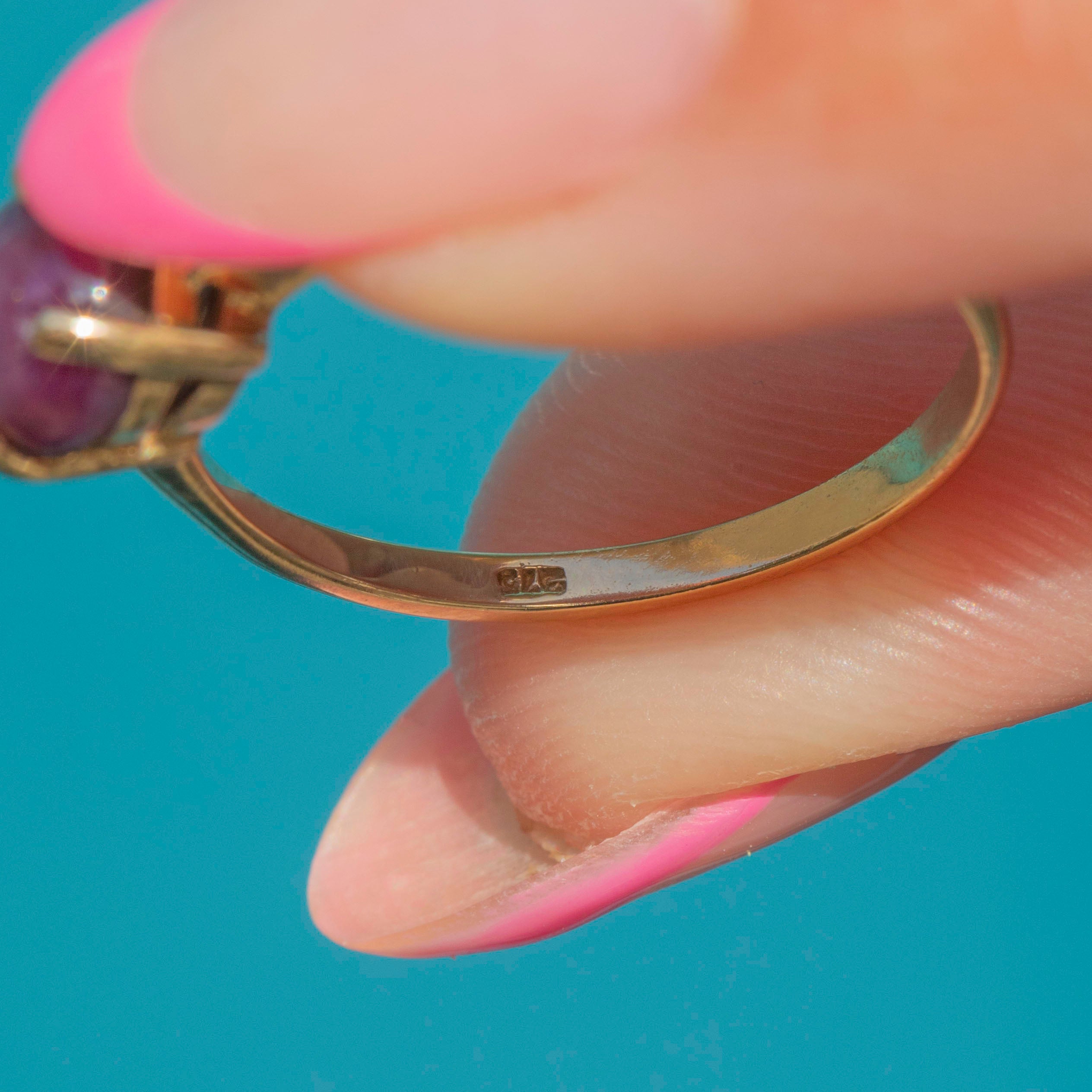 The round Ruby cabochon is displayed within neat claws and held proudly from the finger in a double basket setting. The 9ct Gold band caresses the finger comfortably, with its buttery hue and high-shine polish making this Star Ruby ring a luxurious addition to your collection!