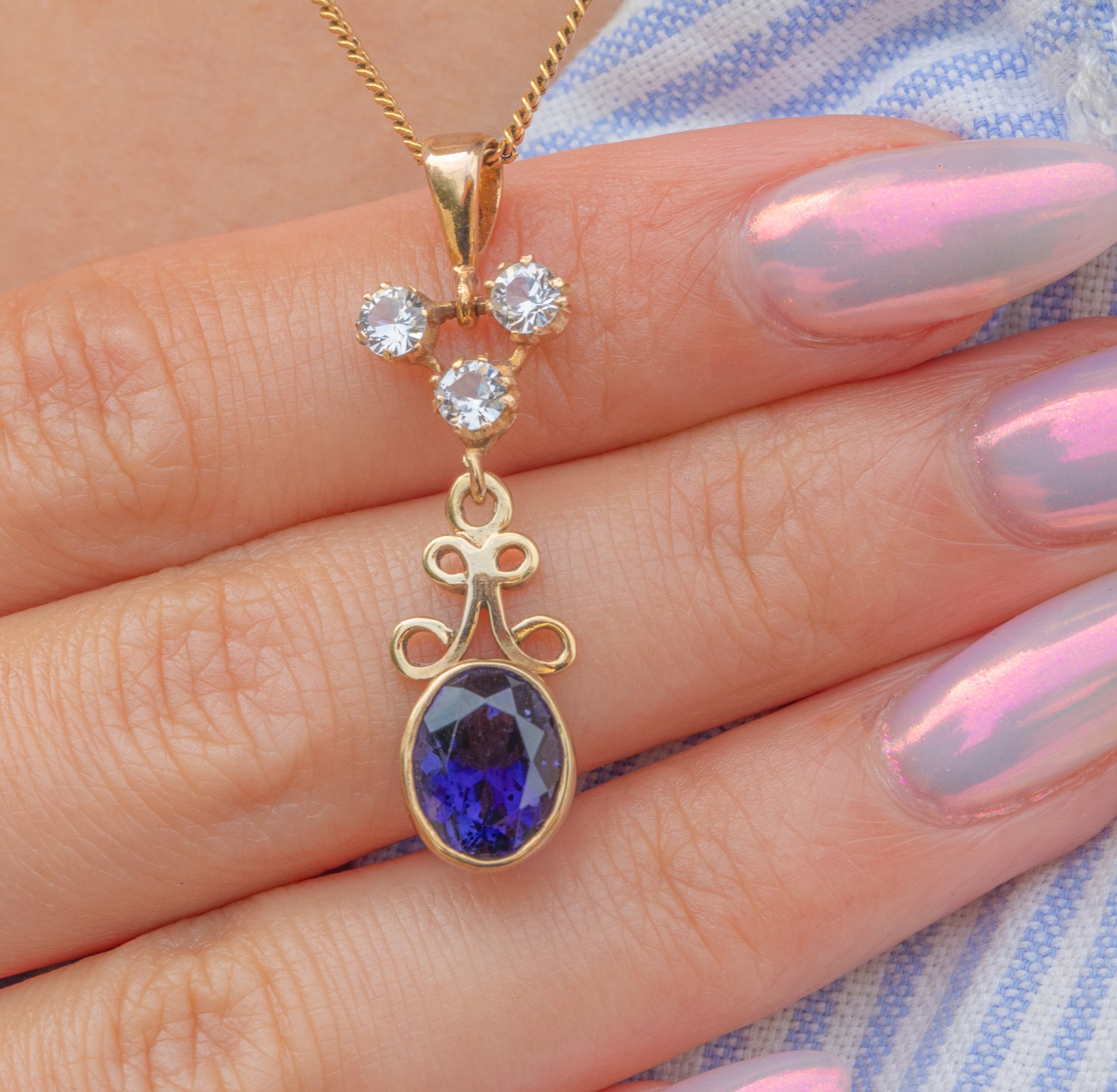 An elegant 1.95ct 9ct Gold Tanzanite charm, set in glossy 9ct Gold ornate settings.