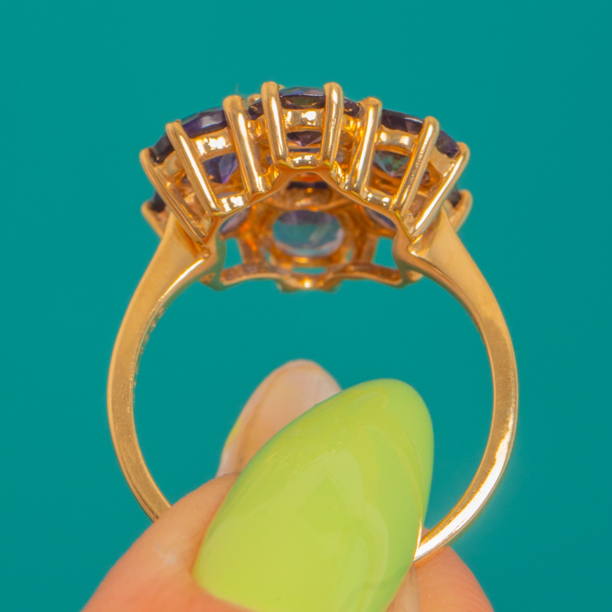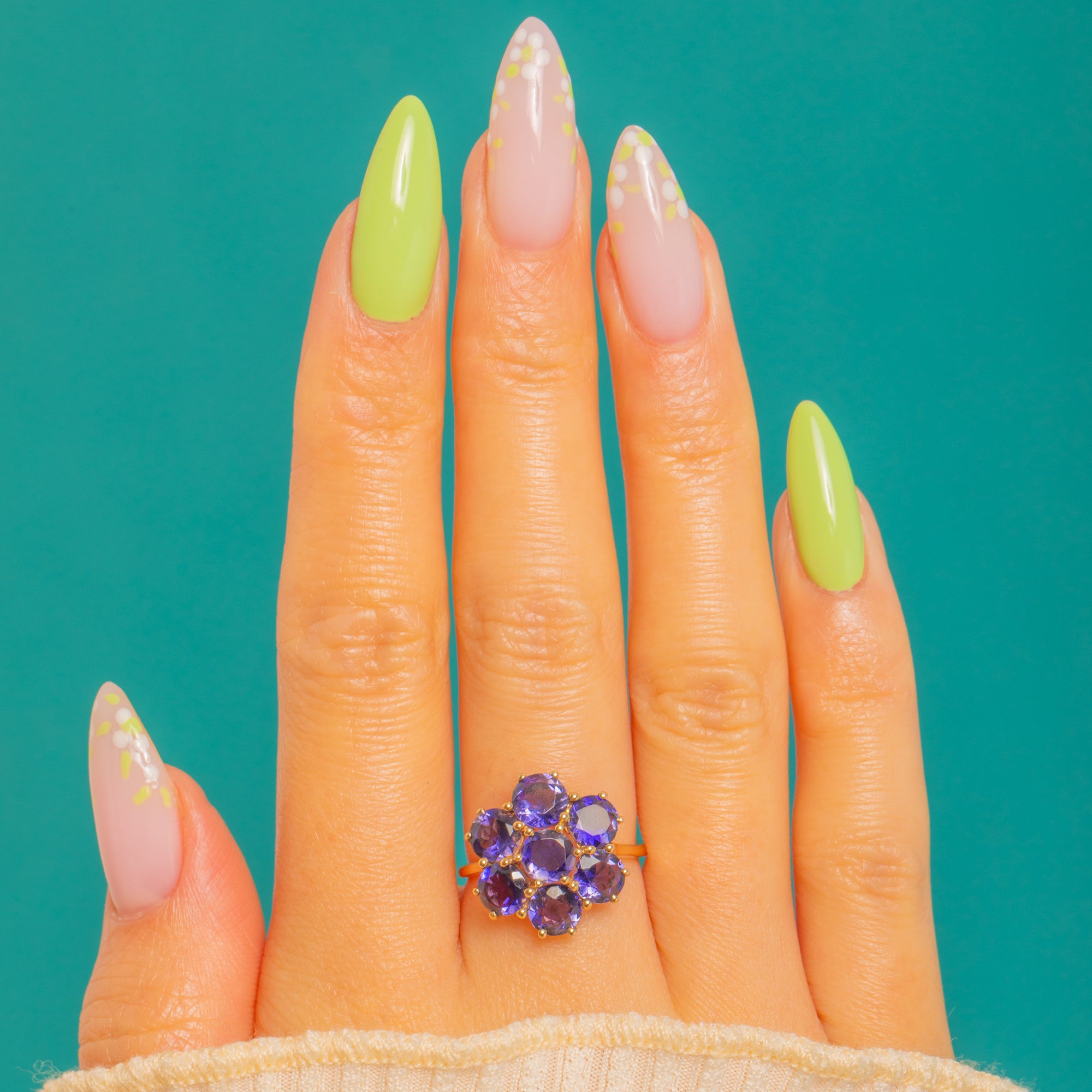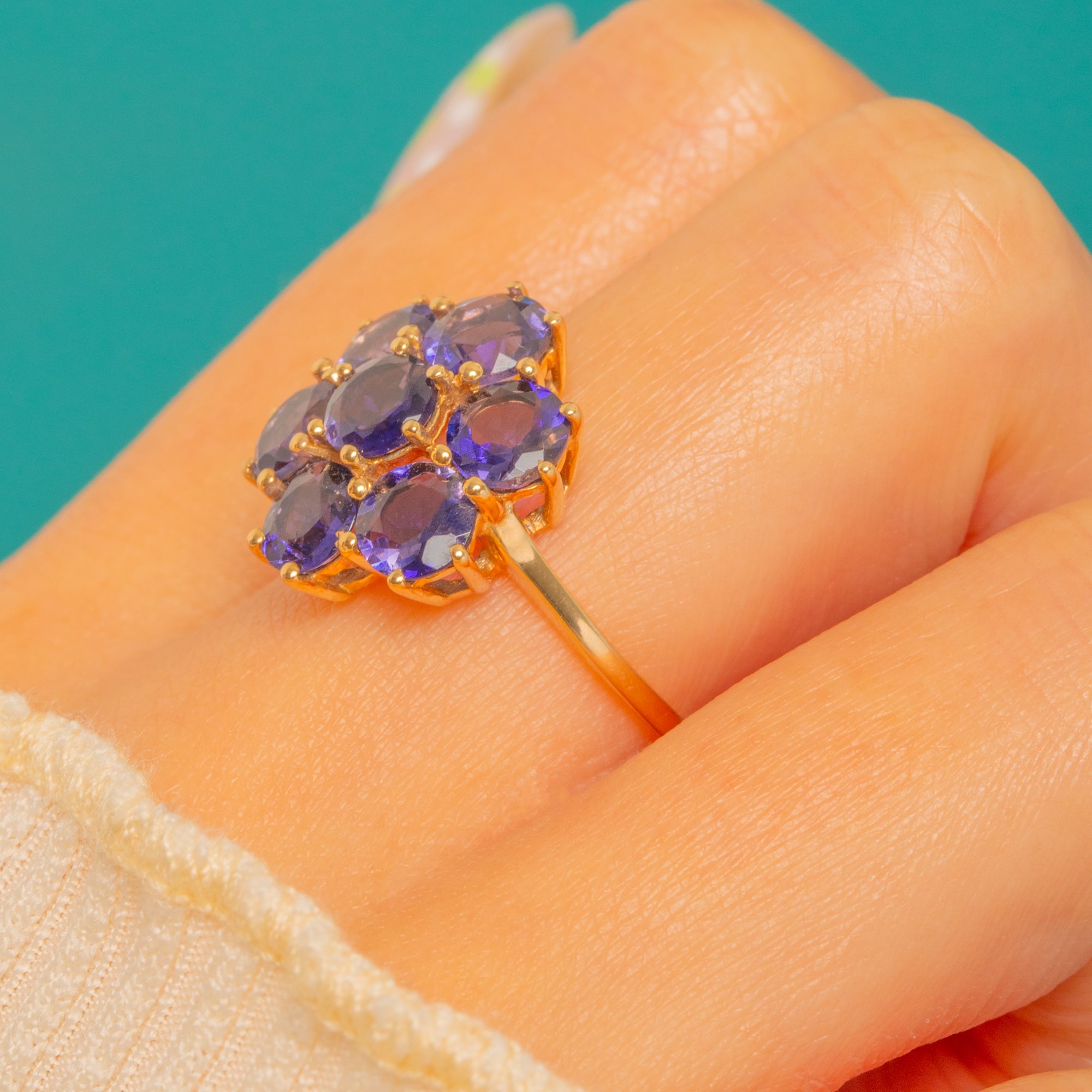 A luminous bloom of Tanzanite brings instant colour to this elegant cluster ring. Seven faceted stones form a floral rosette, their saturated violet–blue tones dancing in the light against warm 9ct Gold. A raised, open gallery and dainty band keep the silhouette airy, while the neat, symmetrical setting delivers classic cocktail charm.