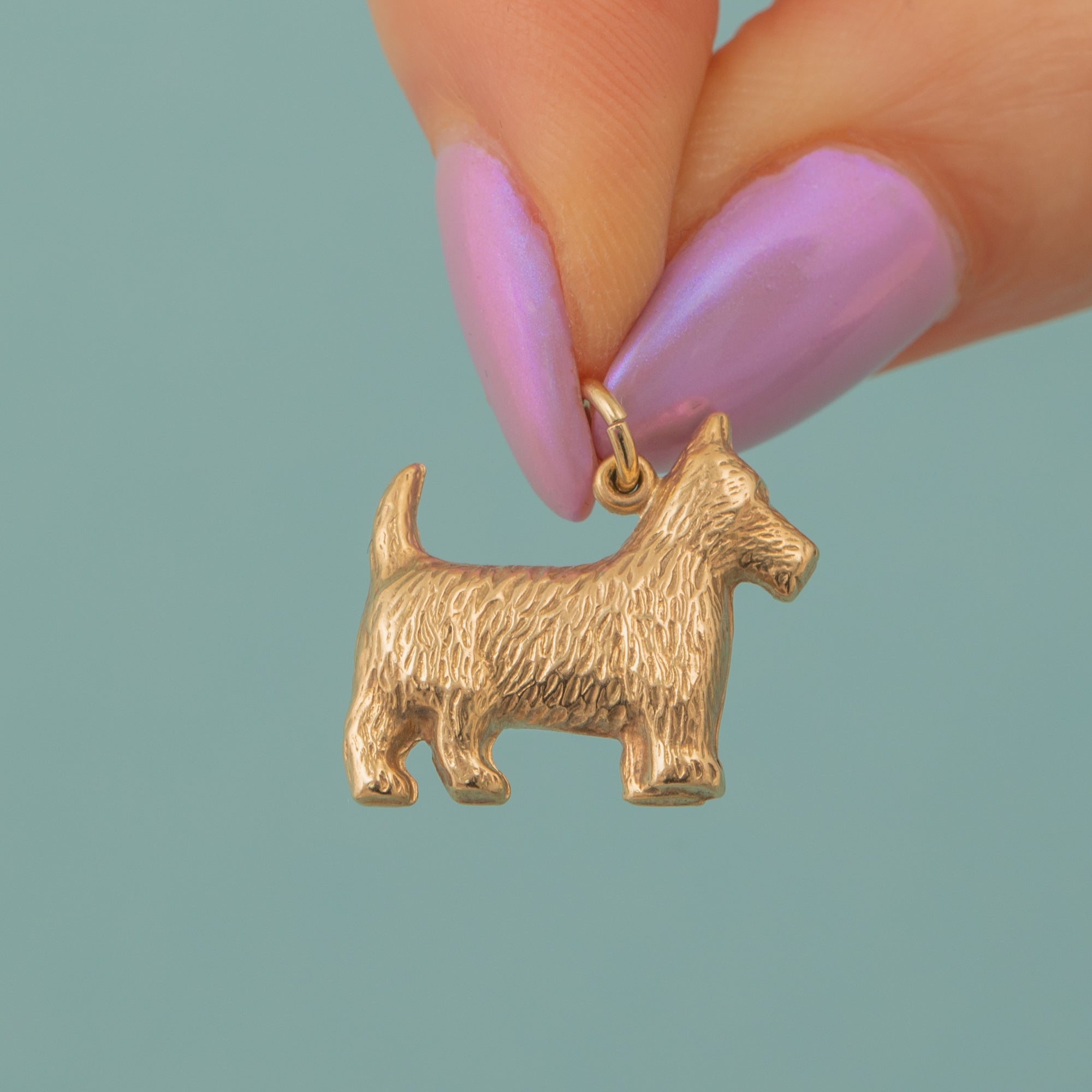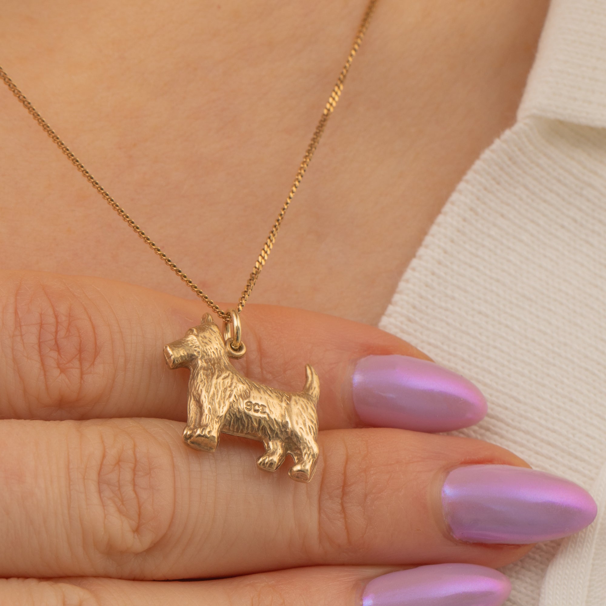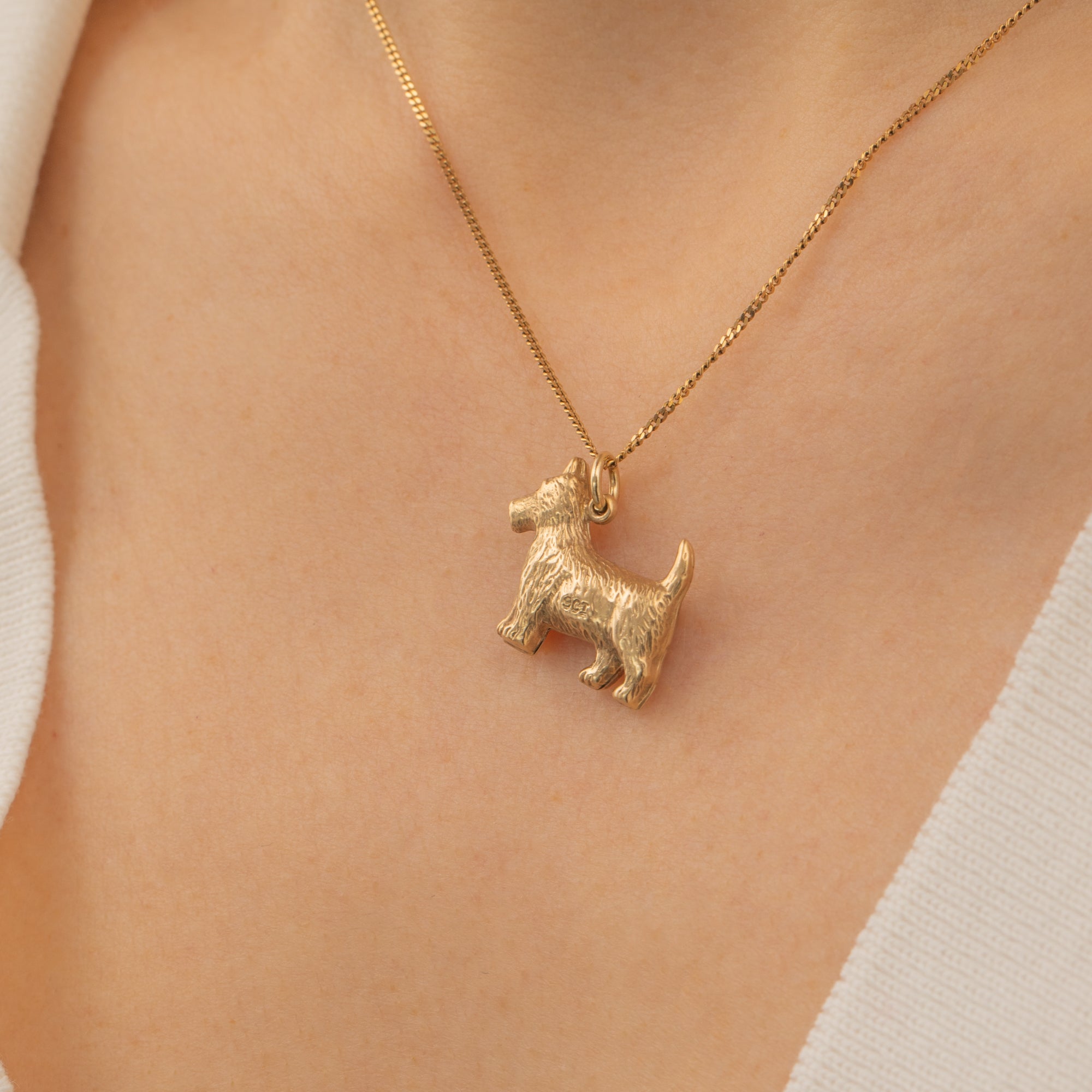 Walking your furry companion has never been more fashionable than with this adorable solid 9ct Gold terrier dog charm! This furry friend will be the most splendorous dog you have laid eyes on, with every whisp of hair having been hand engraved into buttery 9ct Gold.