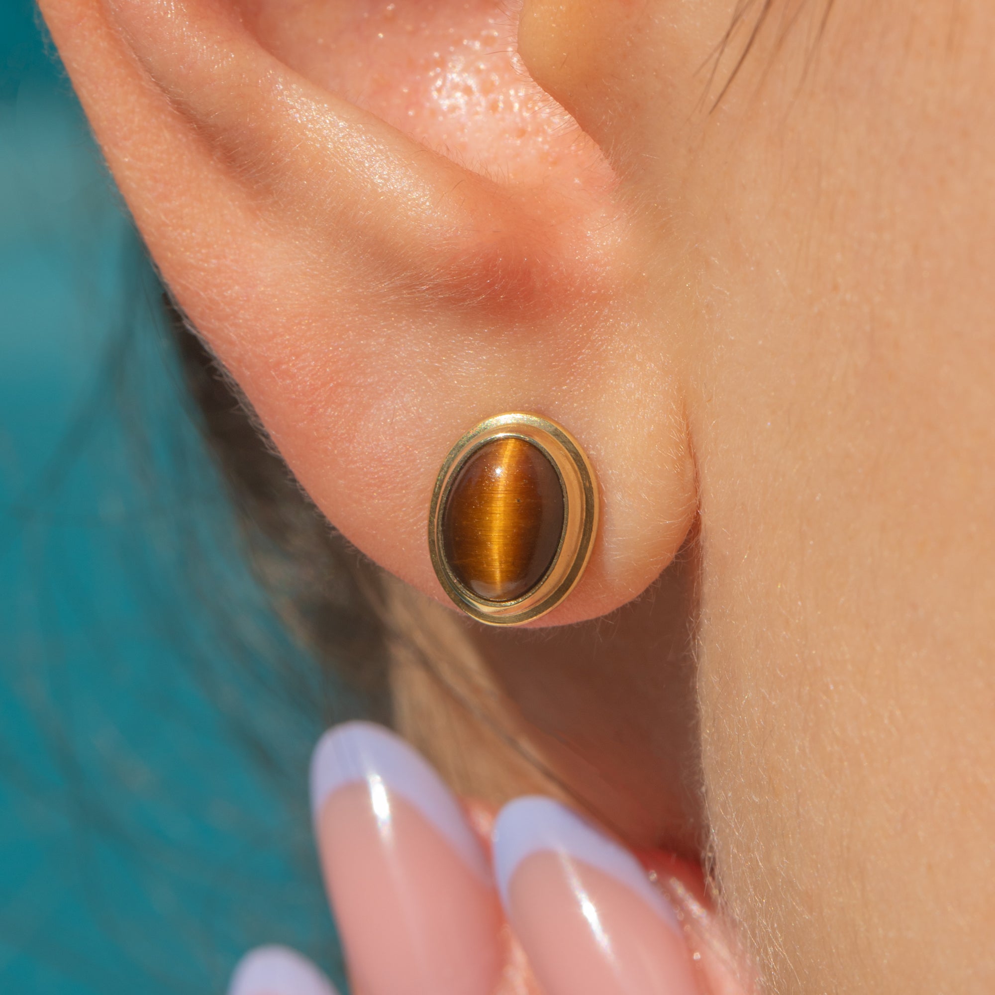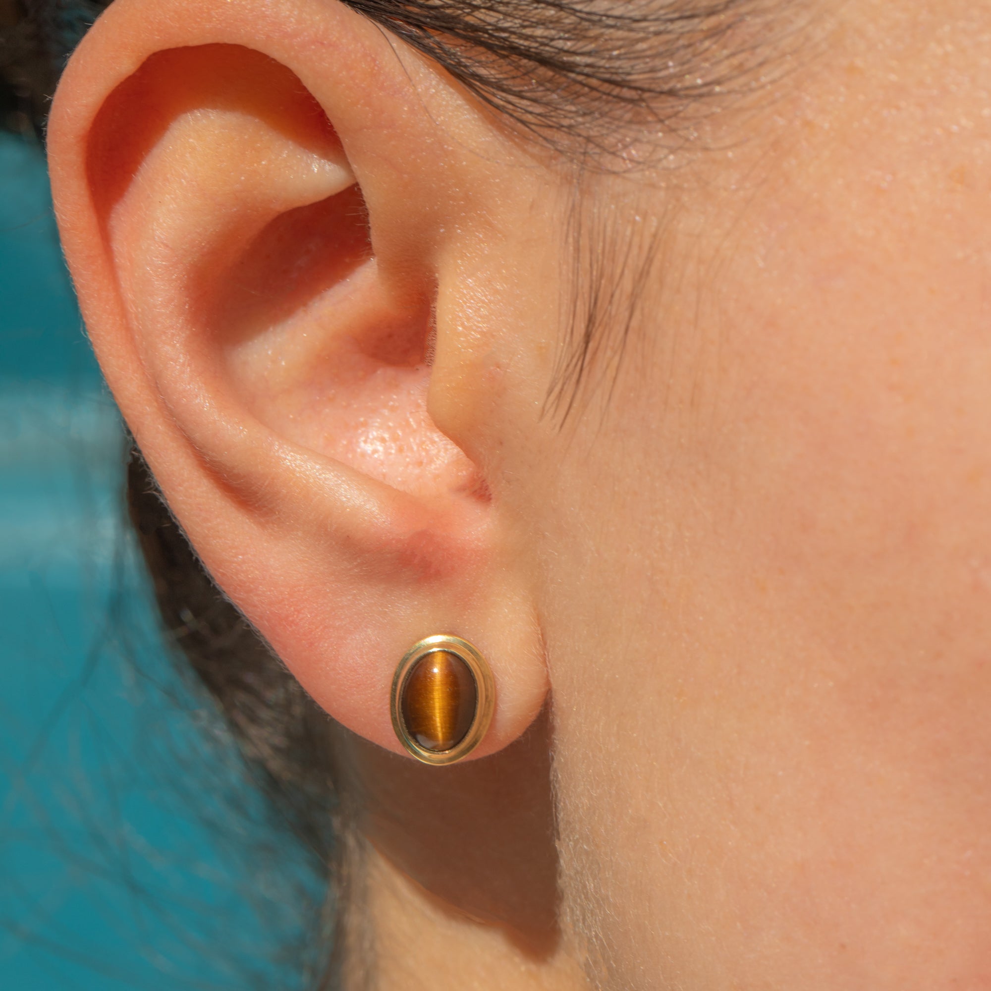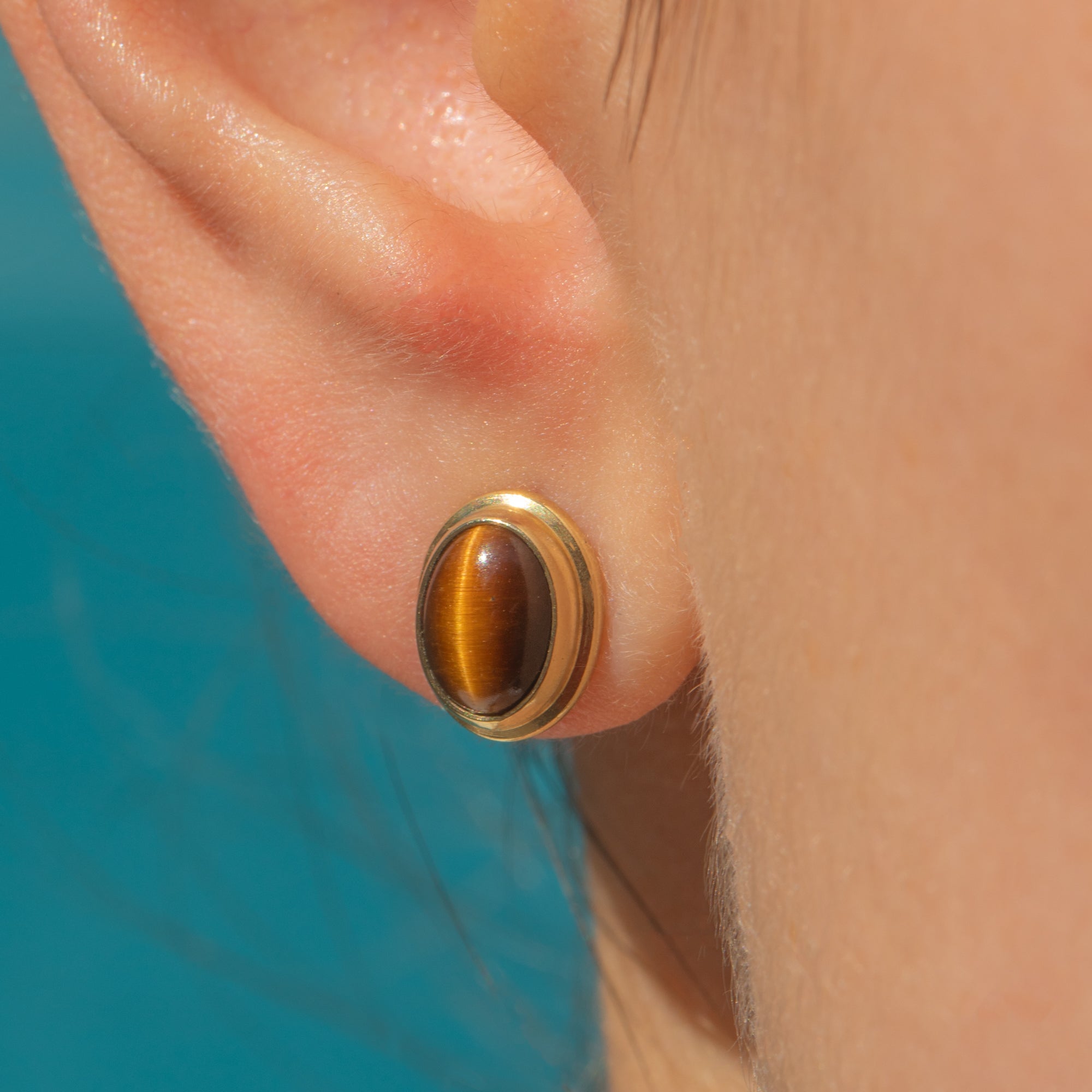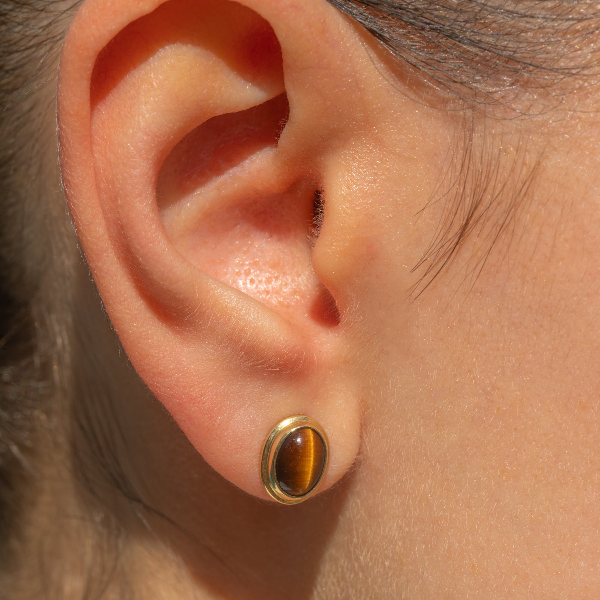 Each stud earring homes a gorgeous Tiger's Eye cabochon, each with deep earthy tones and a characteristic banding running down their centre. They are wrapped in buttery 9ct Gold bezels, giving these studs a refined and luxurious finish.