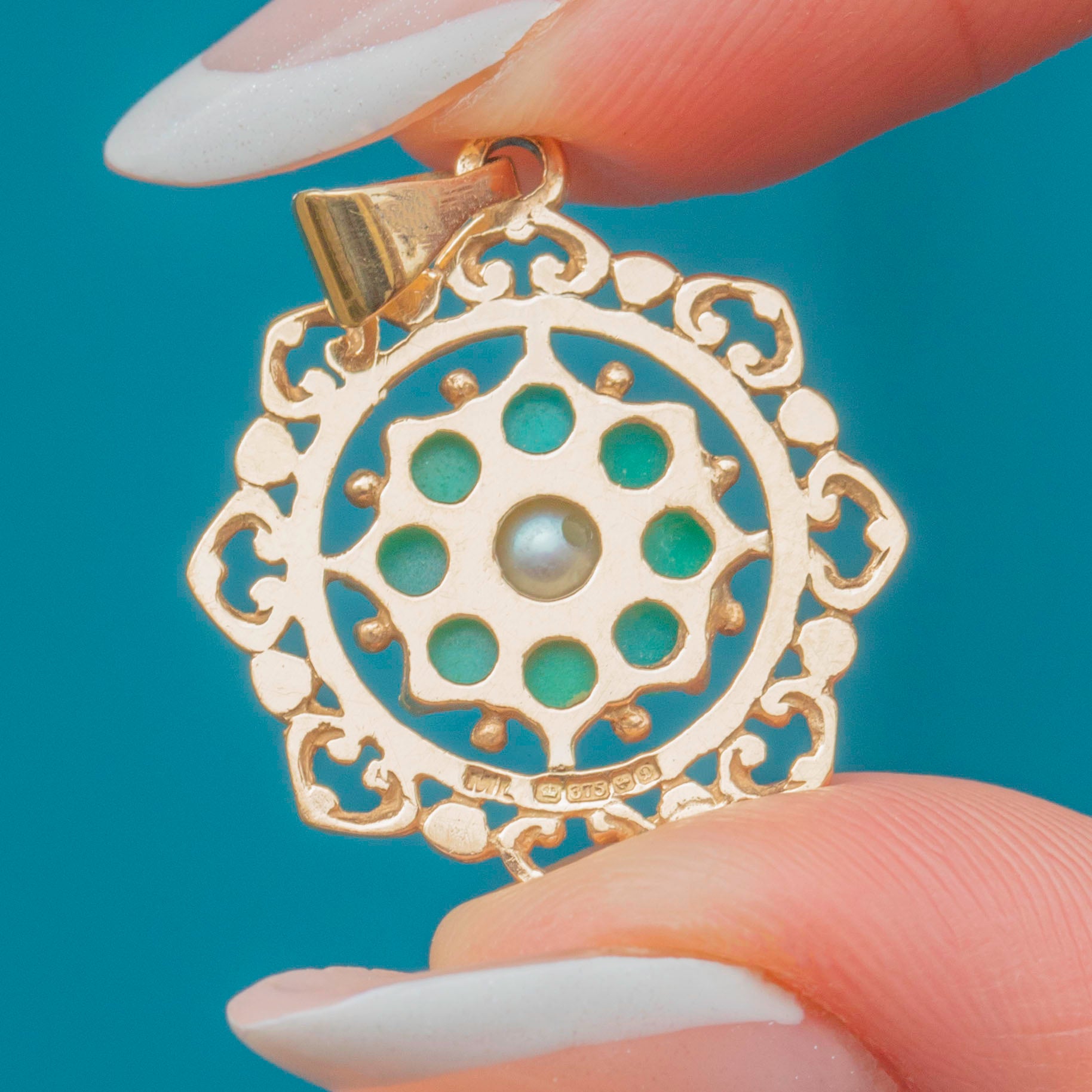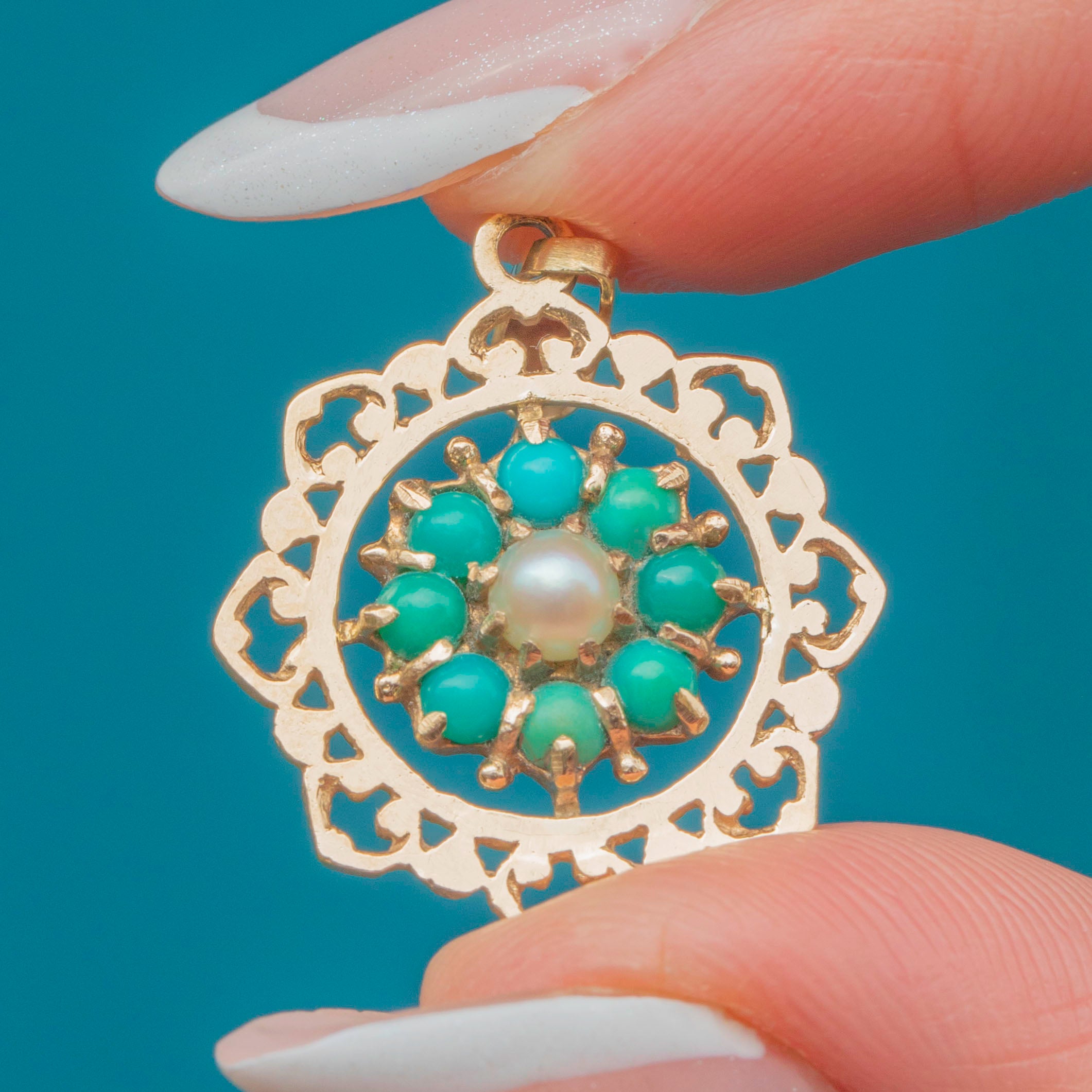 VERY GOOD-EXCELLENT: This 9ct Gold Turquoise Pearl cluster pendant is presented in superb condition. The Turquoise gems have a gorgeous saturation, each with a slightly different hue creating a chic, eclectic look. The Pearl is smooth and bright, making for a stand-out piece. There is little to no wear to the piece overall, making this Vintage Gold pendant a great investment.