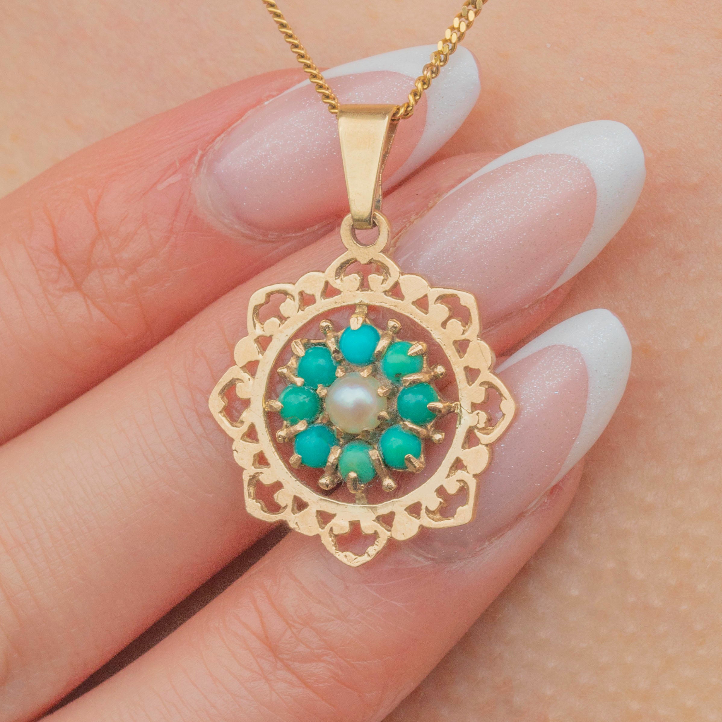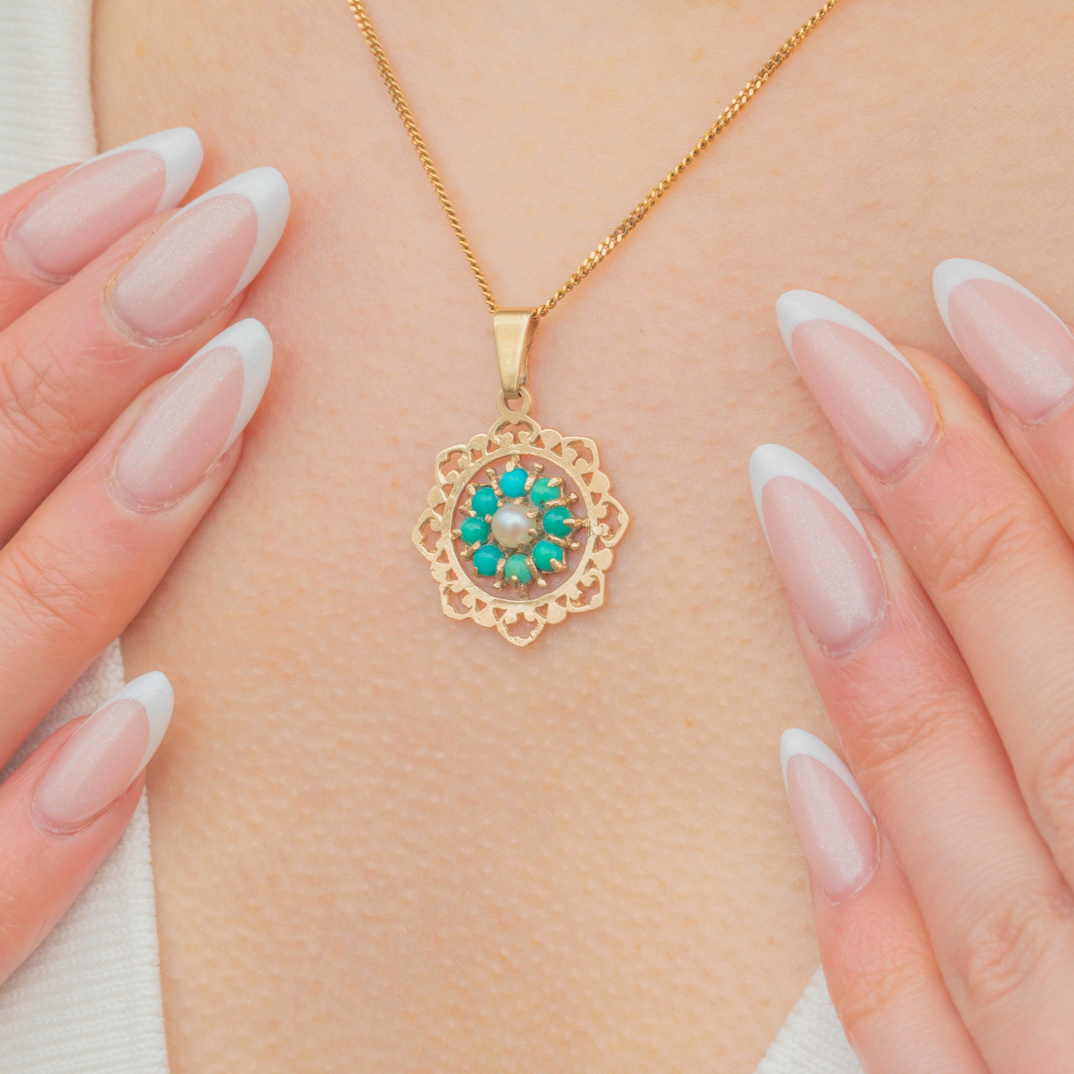 This stunning 9ct Gold Turquoise Pearl cluster pendant is ripe with splendour and will look striking suspended from a fine Gold chain!