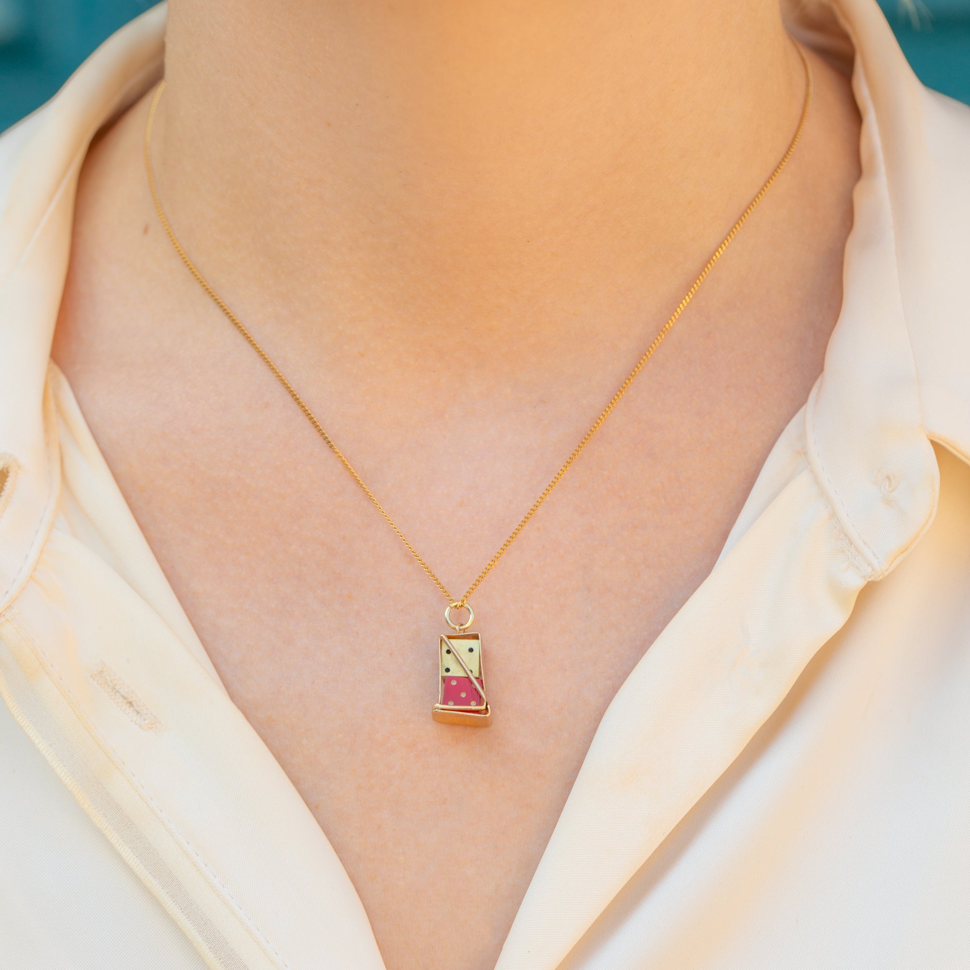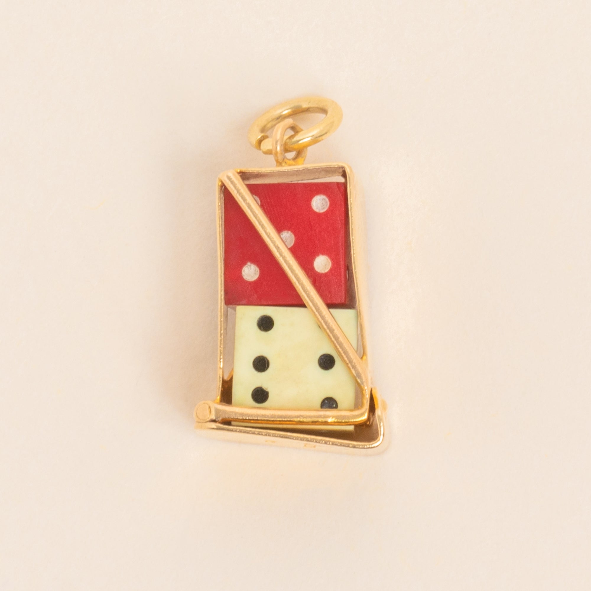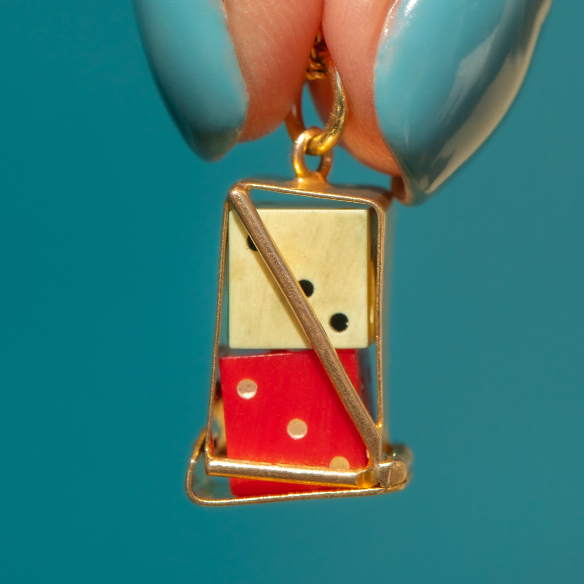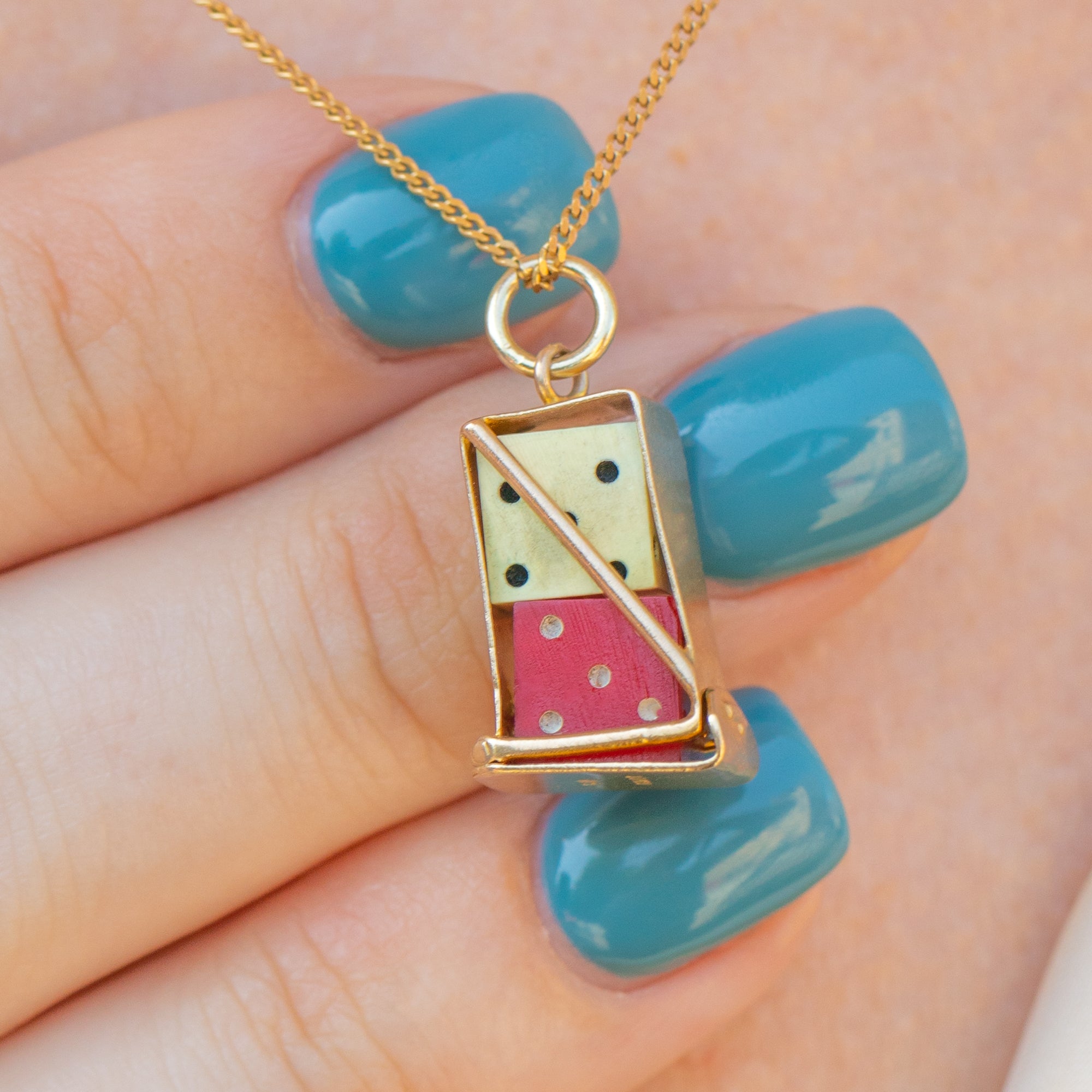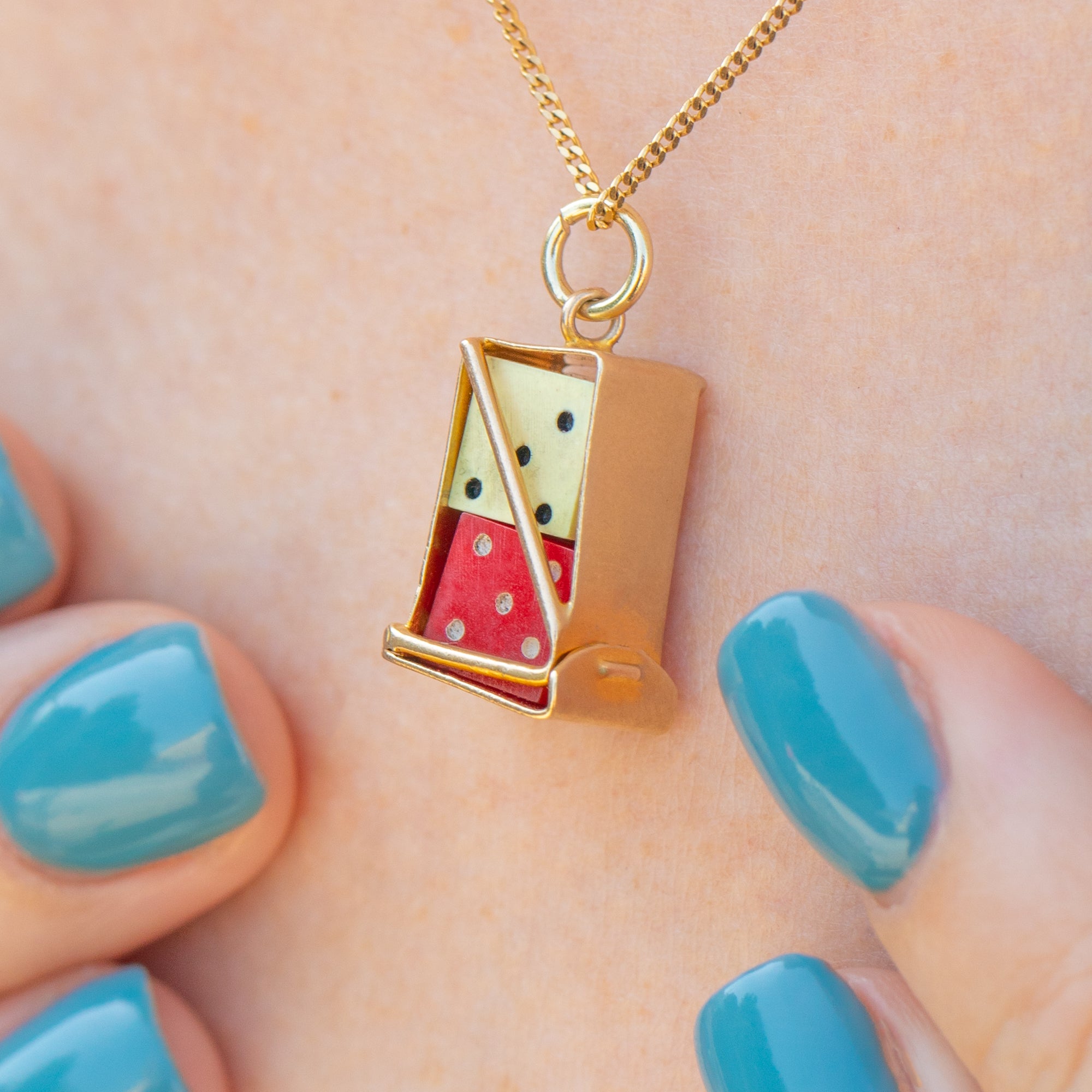 Not only will this Vintage novelty charm add a playful twist to your necklace stack, she is also your newest lucky talisman. What's more, the cage opens up so you can use the dice too. Add this unique Gold charm to your collection and let the good times roll!
