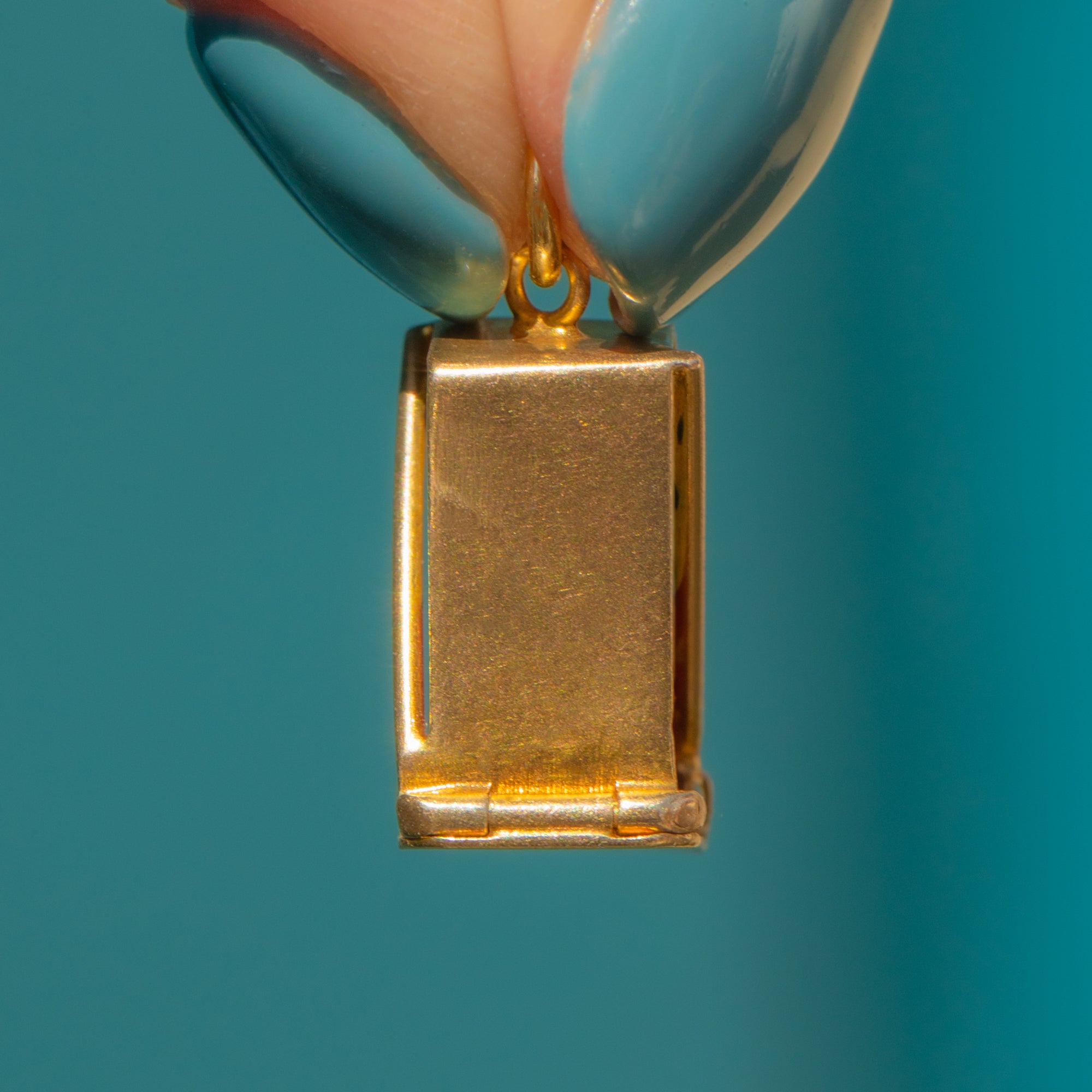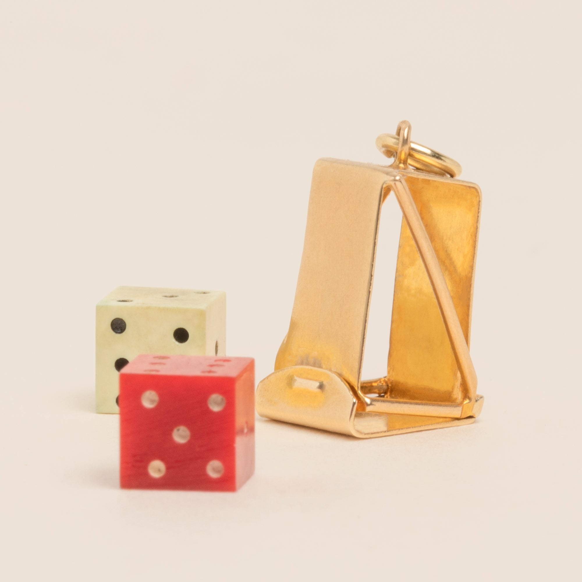 VERY GOOD. This 9ct Gold two dice holder charm is in very good condition! The 9ct Gold is buttery throughout, with the piece retaining its integrity for over 50 years. Where the bottom laches onto the side, there is some subtle wear from being opened and closed but this does not affect her ability to stay securely shut. The dice sit snug inside and although they bear some subtle wear, we can't begin to imagine the stories they would have to tell if they could speak! With a generous jump-ring, keep this Vintage Gold charm safe by suspending her around your neck.