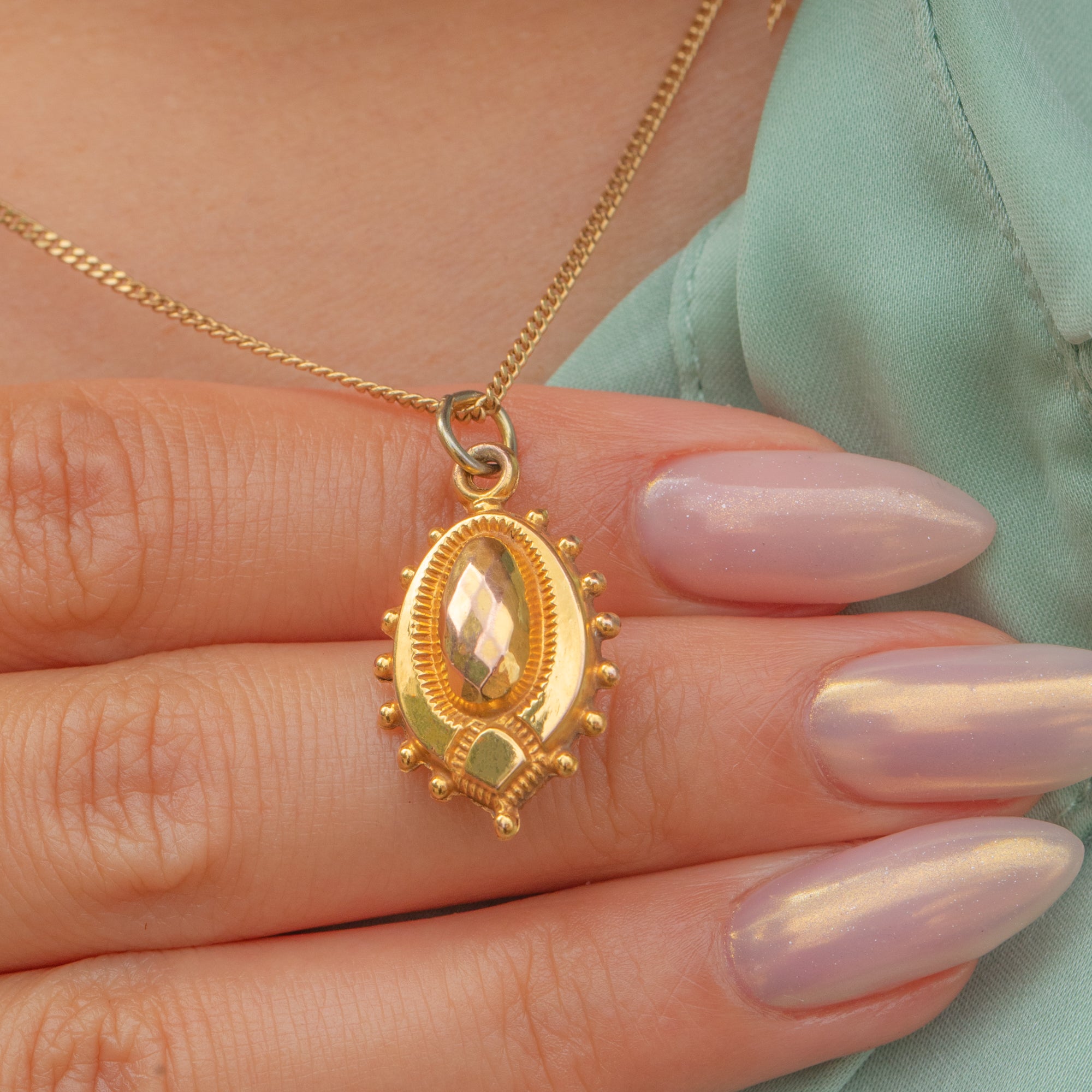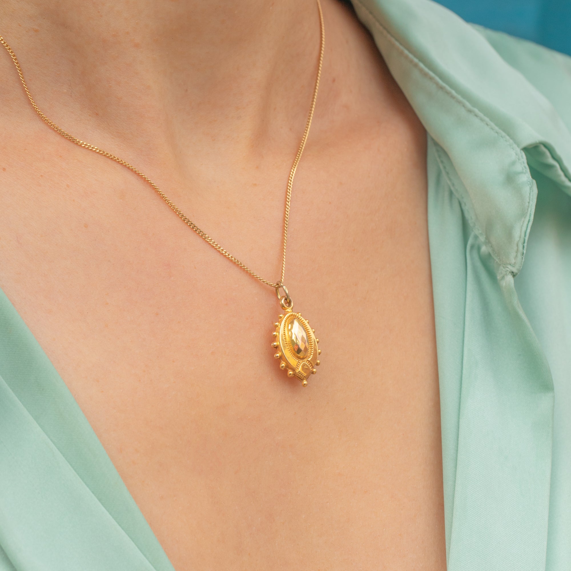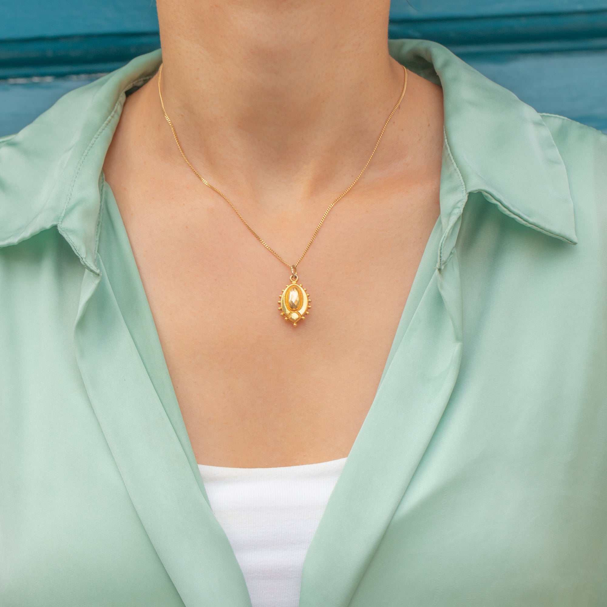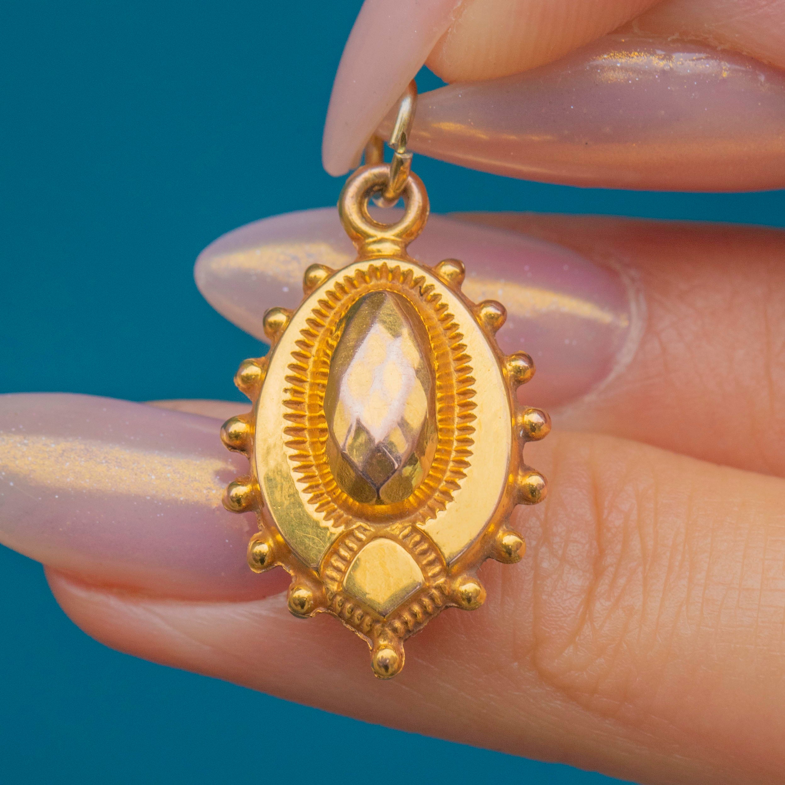 The elegant proportions and beaded edge are typical of Victorian Aesthetic jewellery from the last two decades of the 1800's. The refined craftsmanship, shapes and finish all capture the subtle charm of the Victorian Aesthetic, making it a timeless piece that can draw the eye alone as well as being layered with other pendants.