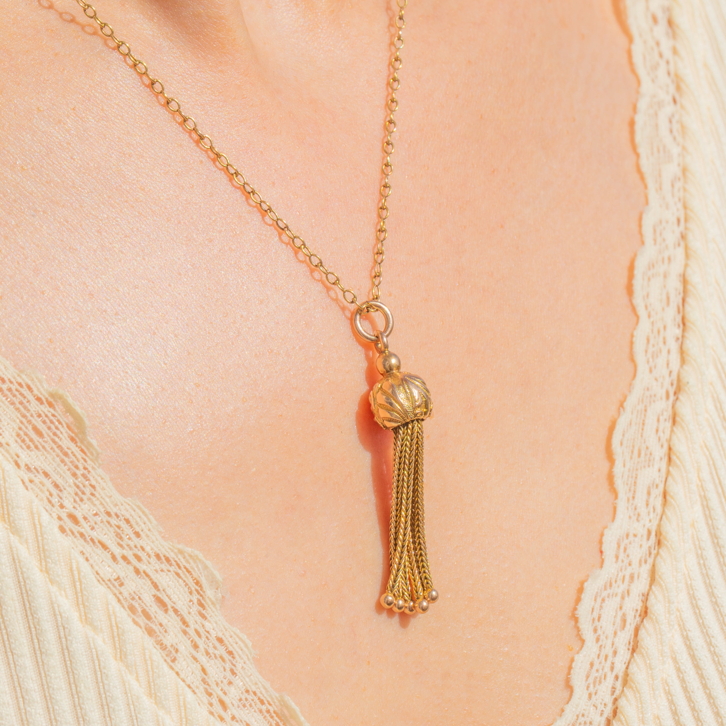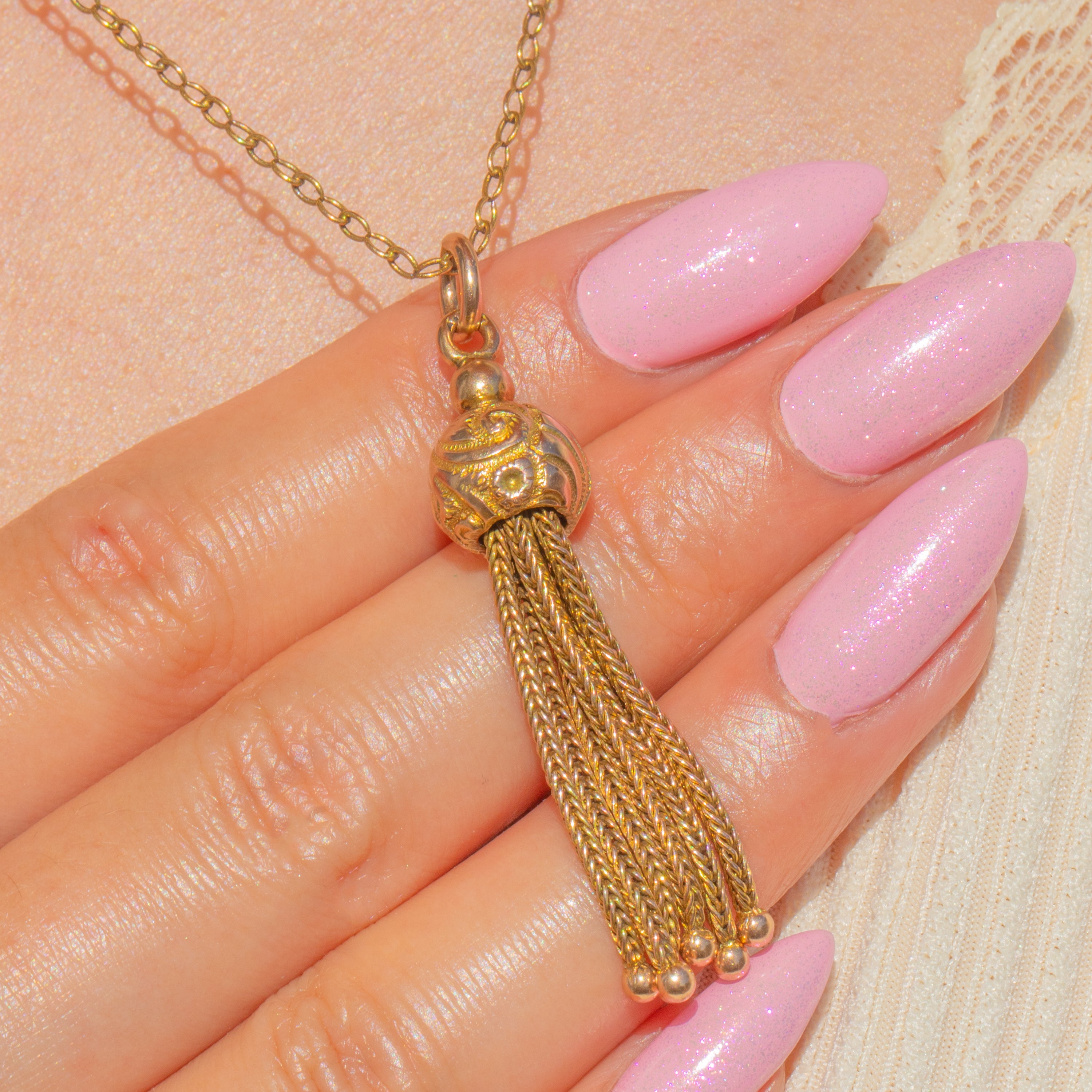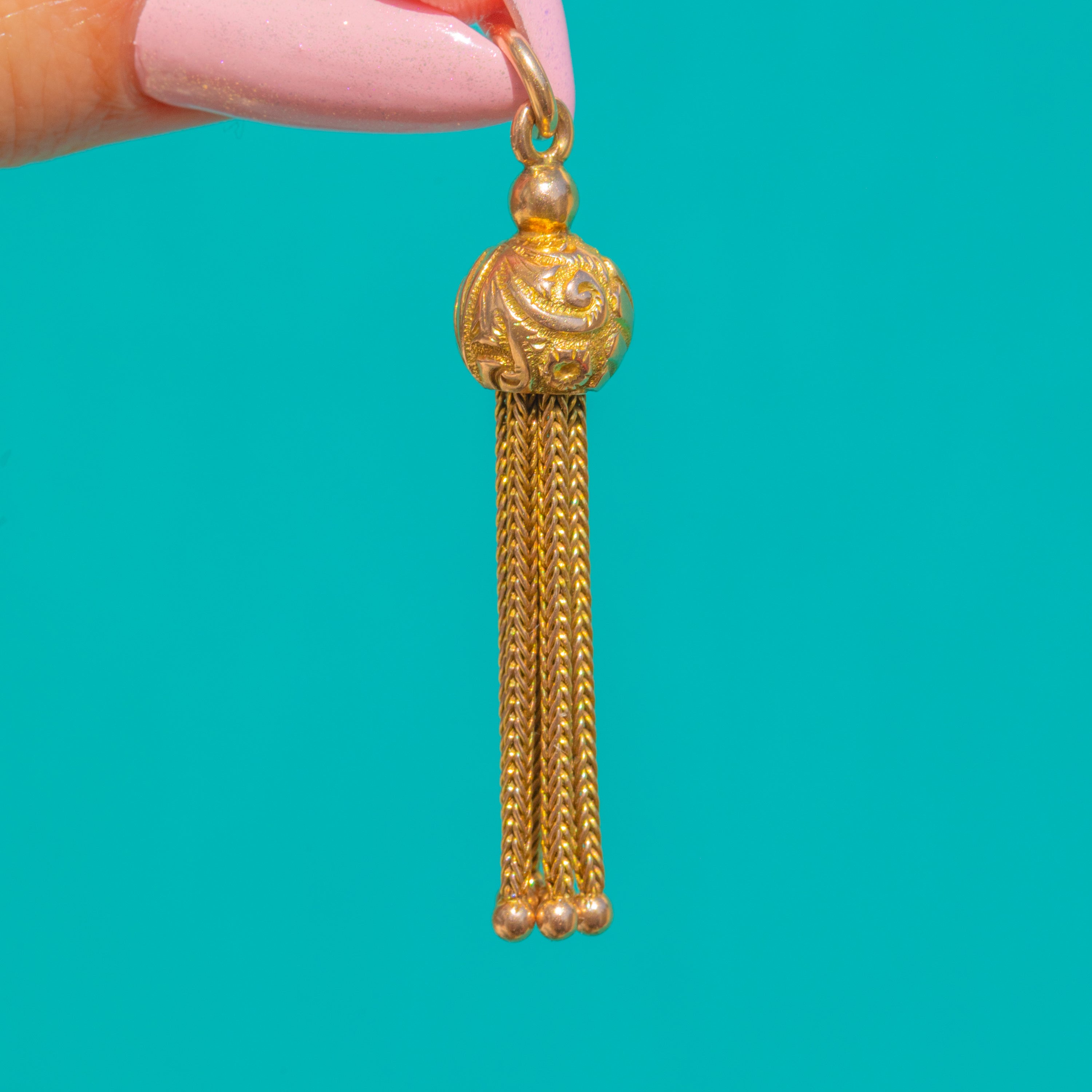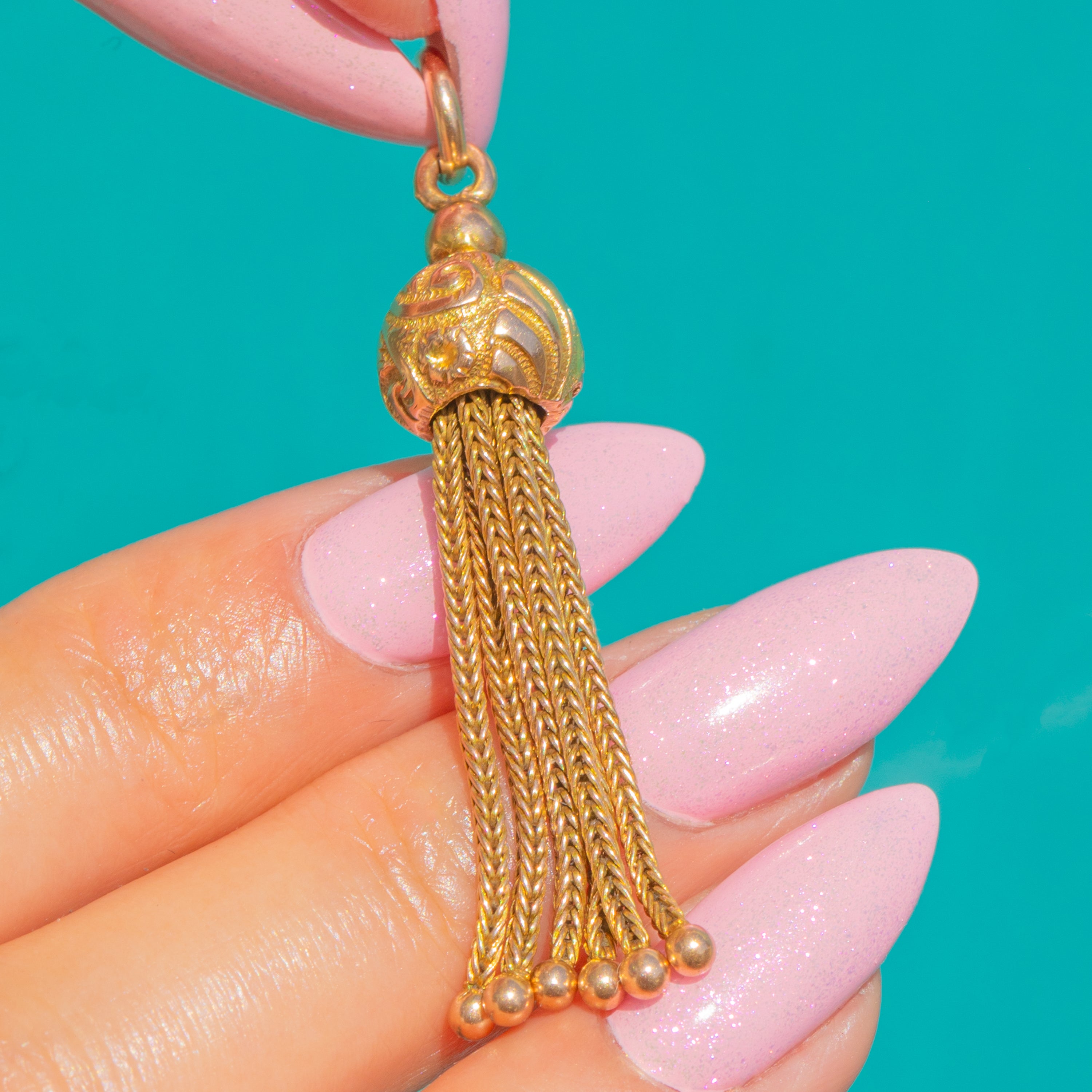 Gloriously ornate and irresistibly tactile, this 9ct Gold Victorian tassel pendant marries sumptuous detail with elegant movement. A domed orb cap is richly chased with foliate scrolls and dotted accents, from which a cascade of fine foxtail chains descends to dainty ball terminals, creating that quintessentially romantic Victorian flourish.