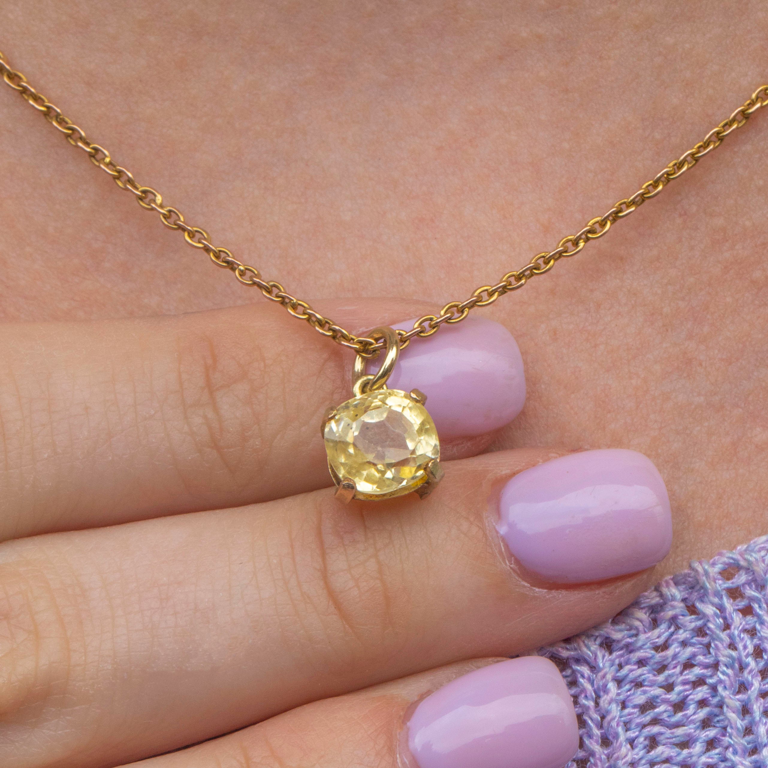 VERY GOOD. This 9ct Gold yellow Sapphire round charm features a yellow Sapphire set securely in claw settings, with no damage to note apart from a very small chip on the edge of the stone.. There are a few black dot inclusions at the centre of the Sapphire but this is a true ode to Mother Nature. With a jump-ring to finish, she can be suspended from a chain of your choice!