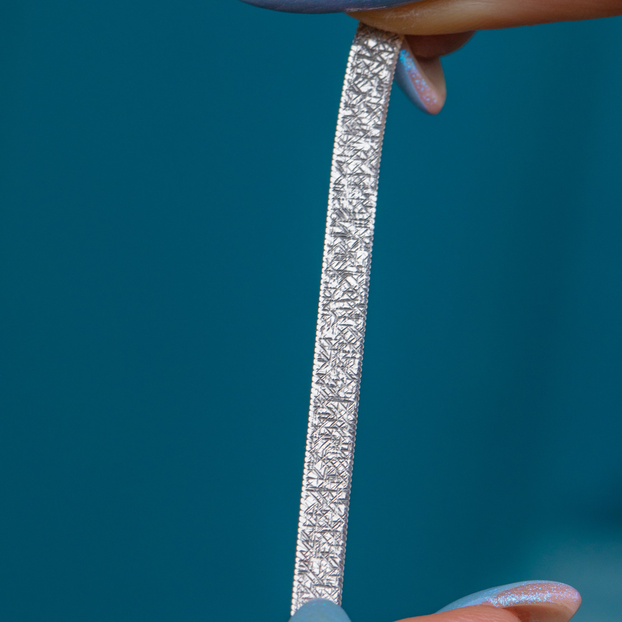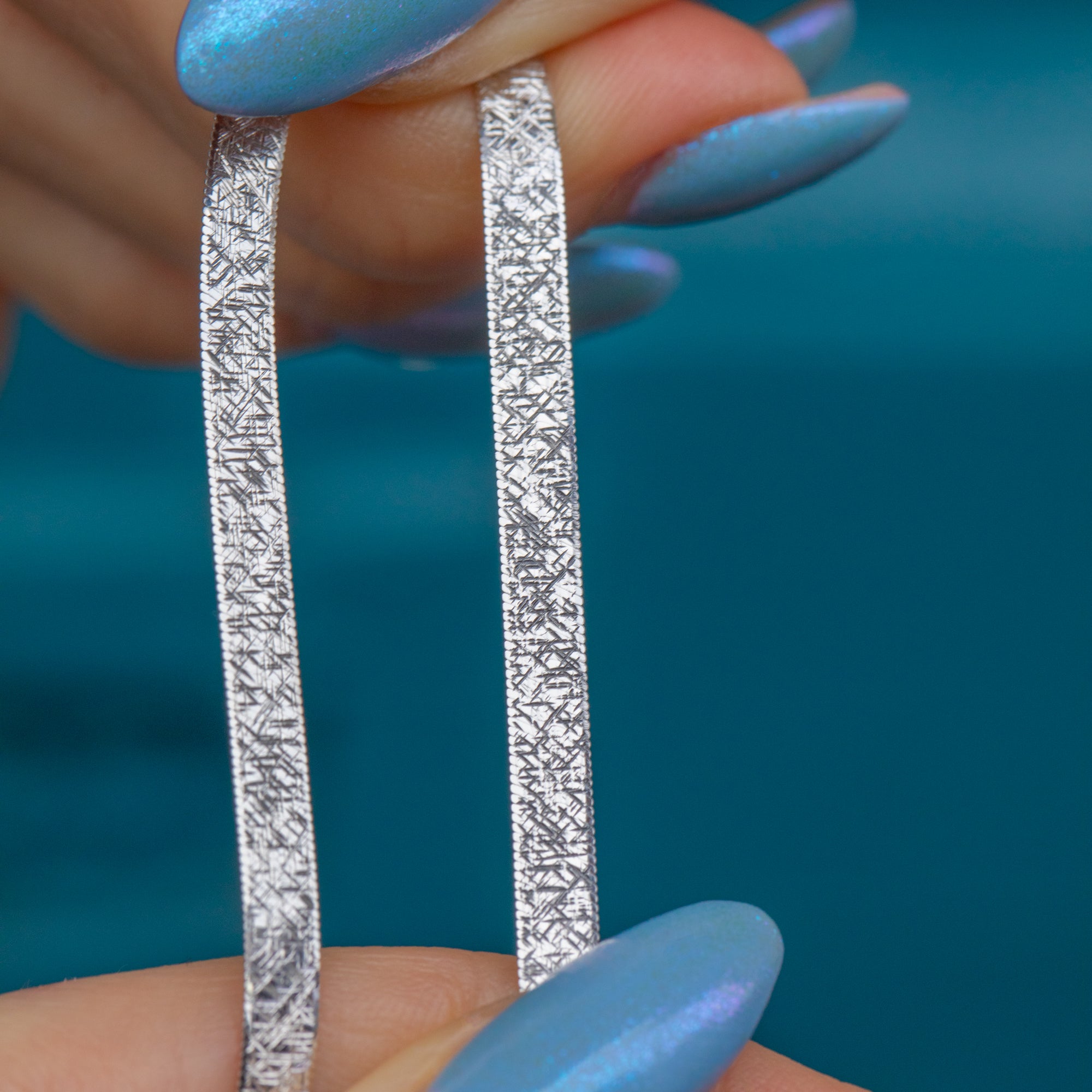 A stunning 9ct White Gold textured chain to add to your collection. Measuring a chic 18 inches, her slinky White Gold links, boasting an eclectic textured surface, will lay gracefully across your décolletage.