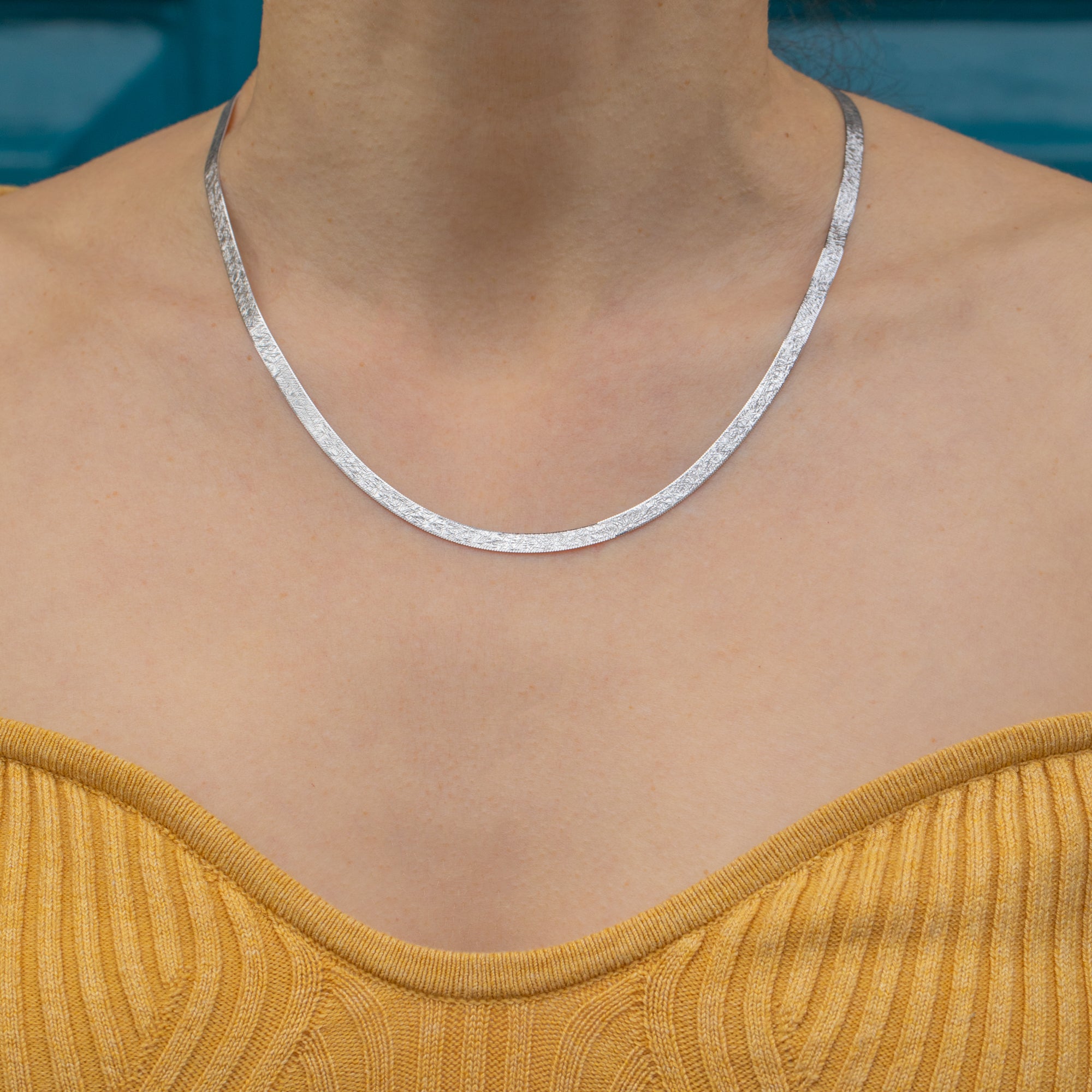 EXCELLENT. This 9ct White Gold textured chain is in excellent condition, with the herringbone links connected securely. The clasp is a great size, coming to you in perfect working order. This White Gold chain will quickly become a piece you can't live without.