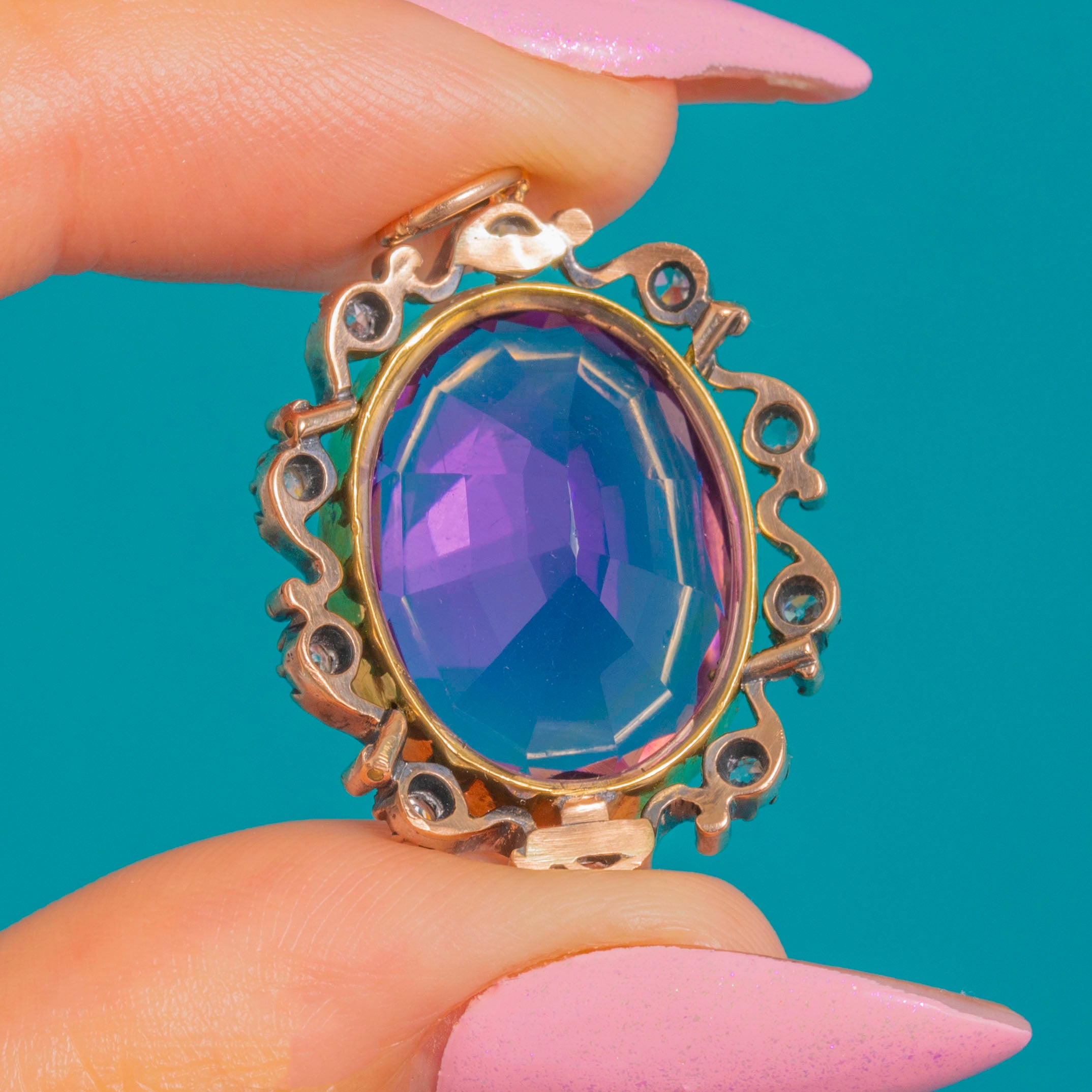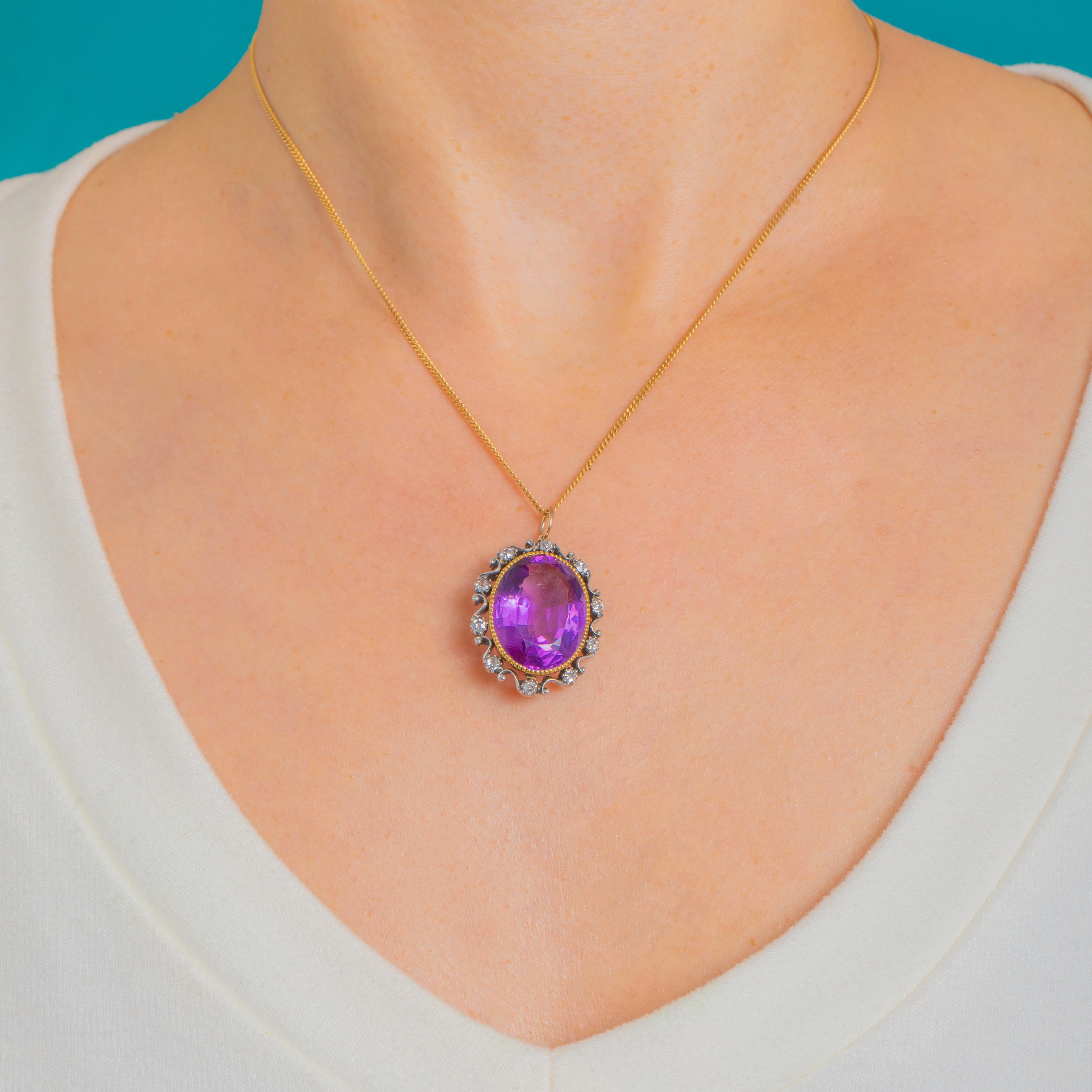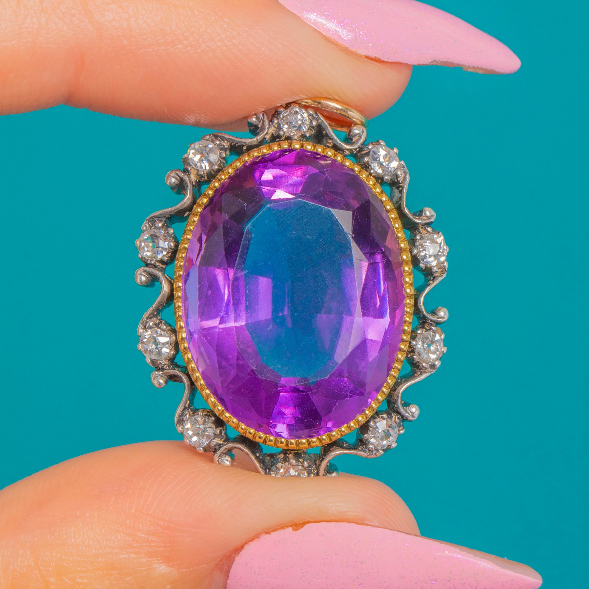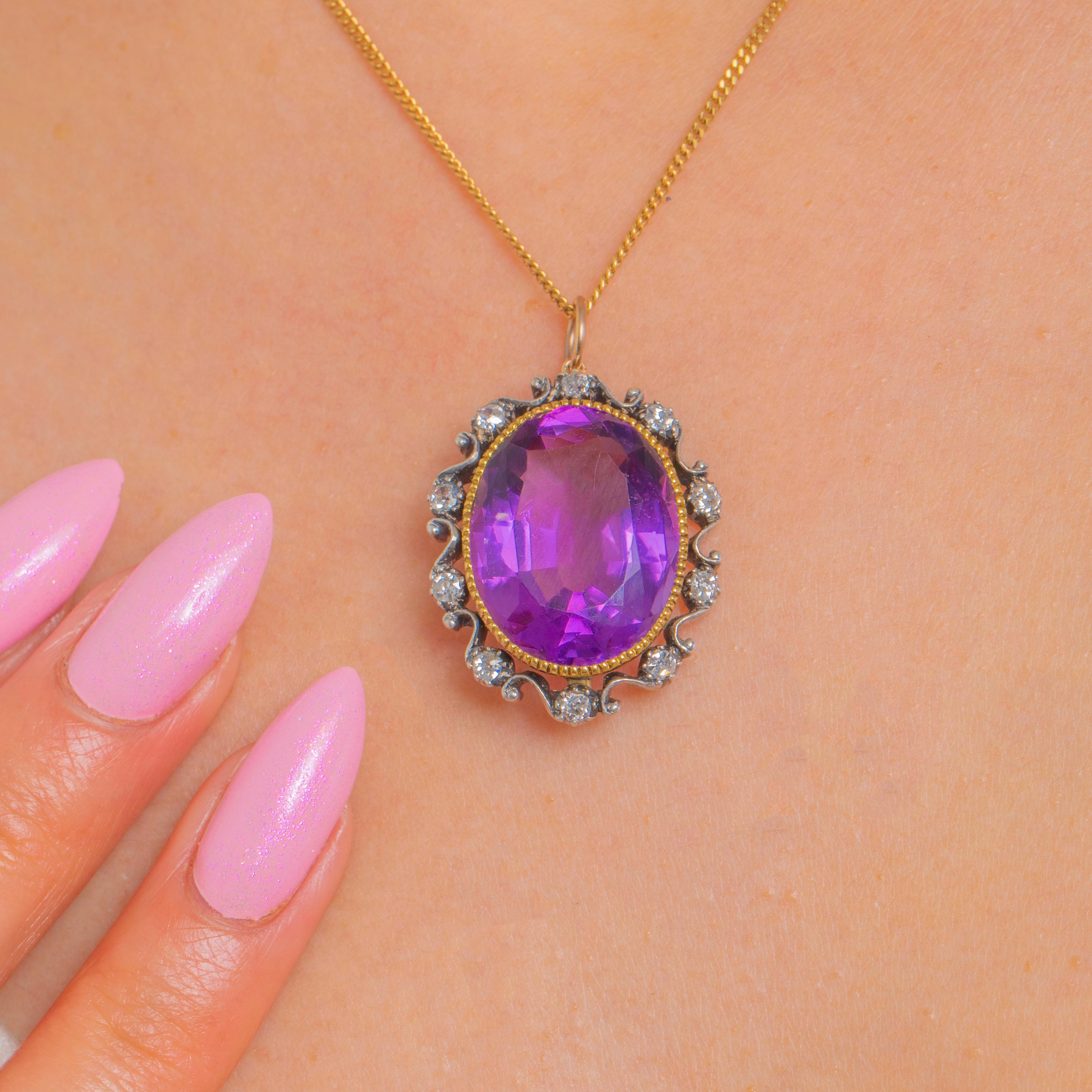 Saturated with colour and antique charm, this Aesthetic Victorian pendant centres on a luscious oval Amethyst of approximately 8.60 carats. The regal purple gem sits within a refined 9ct Gold border, encircled by an ornate scalloped halo set with old mine-cut Diamonds for that soft, romantic sparkle we adore from the era.