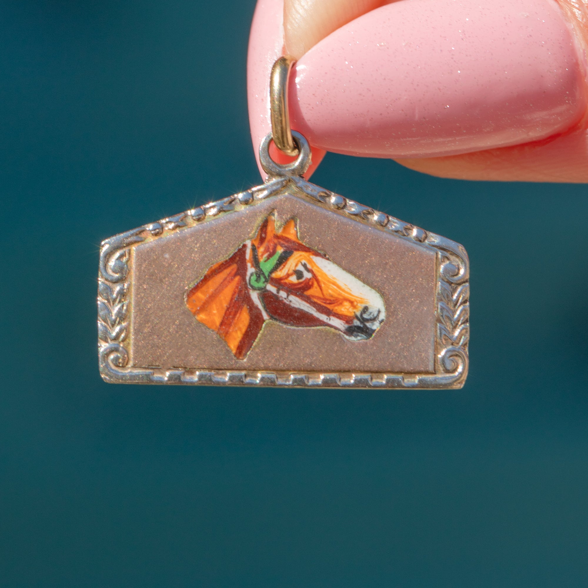 VERY GOOD: This antique 12ct Gold Enamel horse pendant is in very good condition. The Enamel is saturated and rich in detail despite its age. There are some signs of surface wear to the Gold, though this is difficult to spot without a loupe. With a securely soldered jump ring, you can wear this Enamel pendant with confidence!