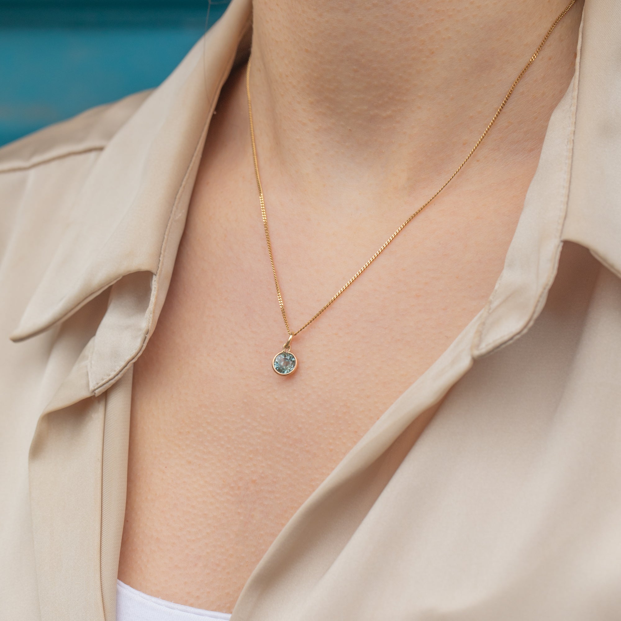 In her centre sits a radiant azure blue 0.90ct Zircon, faceted wonderfully and catching the light with a lovely shimmer. She is set within a rosy 14ct Gold bezel, with the warmth of the Gold offering a nice contrast to the cool blue Zircon.