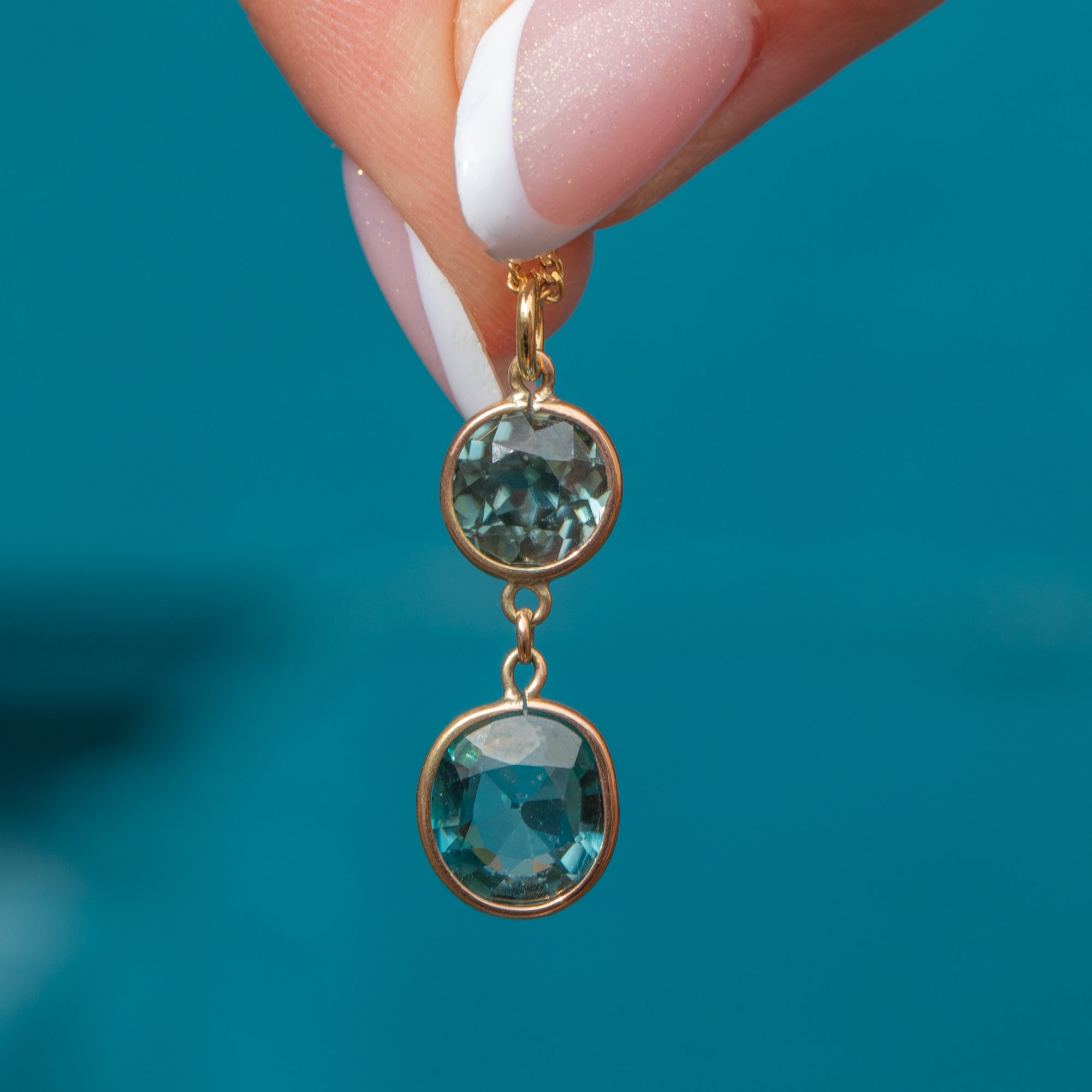 VERY GOOD-EXCELLENT: This antique 14ct Gold Blue Zircon drop charm has been beautifully preserved! The Gold boasts a rich saturation, with only mild surface wear, and holds the gemstones securely in place. The Zircons display sharp, well-defined facets, remaining pristine with no chips or abrasions. One of them does have a slight inclusion, adding to its antique charm. Pop her on a solid Gold chain and you'll never want to take her off!