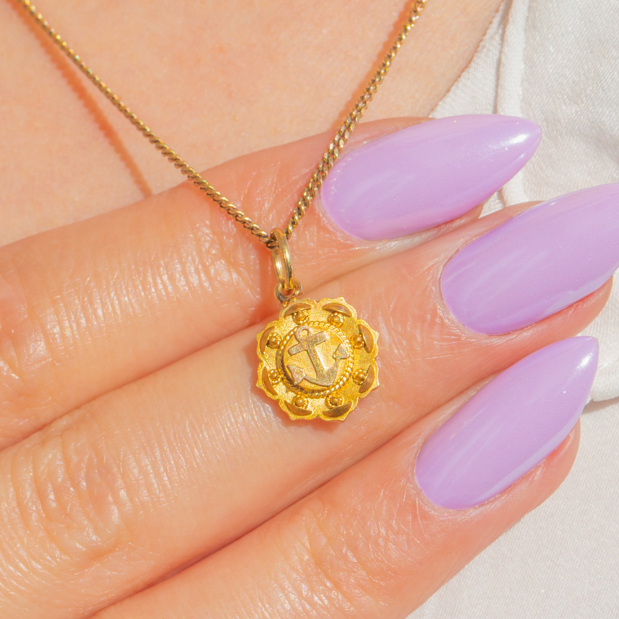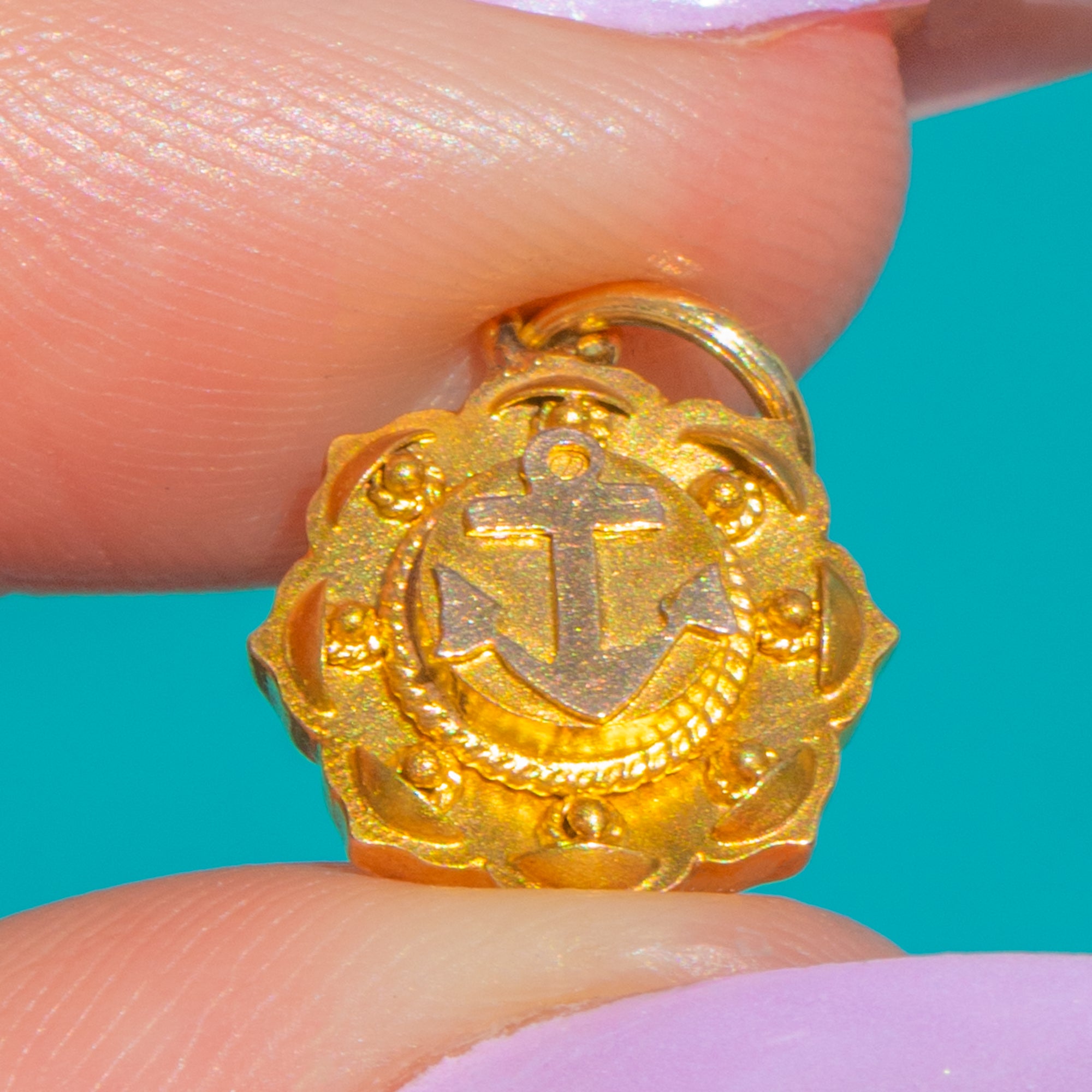 A dainty Victorian 15ct Gold anchor charm with beautifully crisp detailing. The central anchor is framed by a twisted rope border and a scalloped, beaded rim, creating an ornate little medallion that catches the light with every movement.