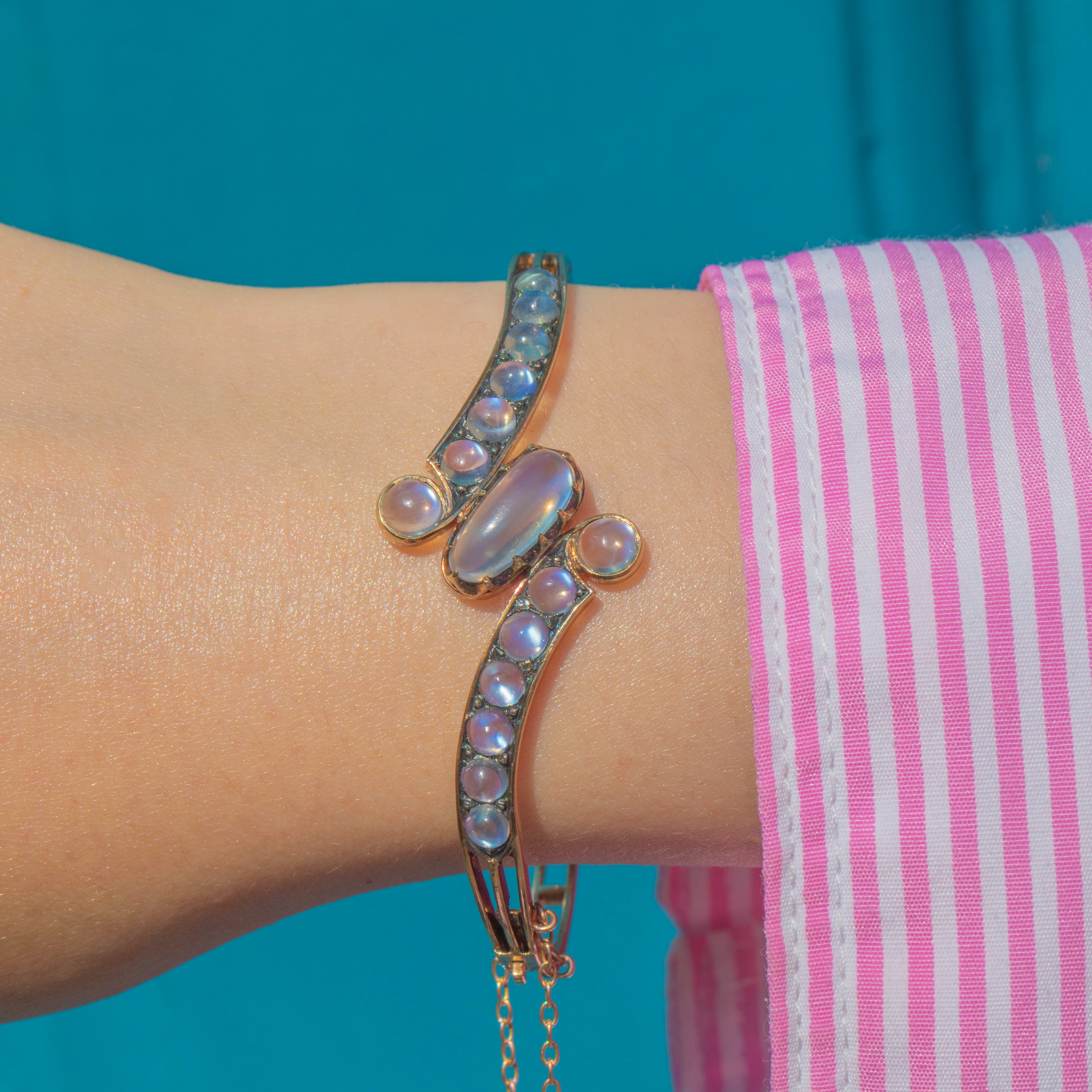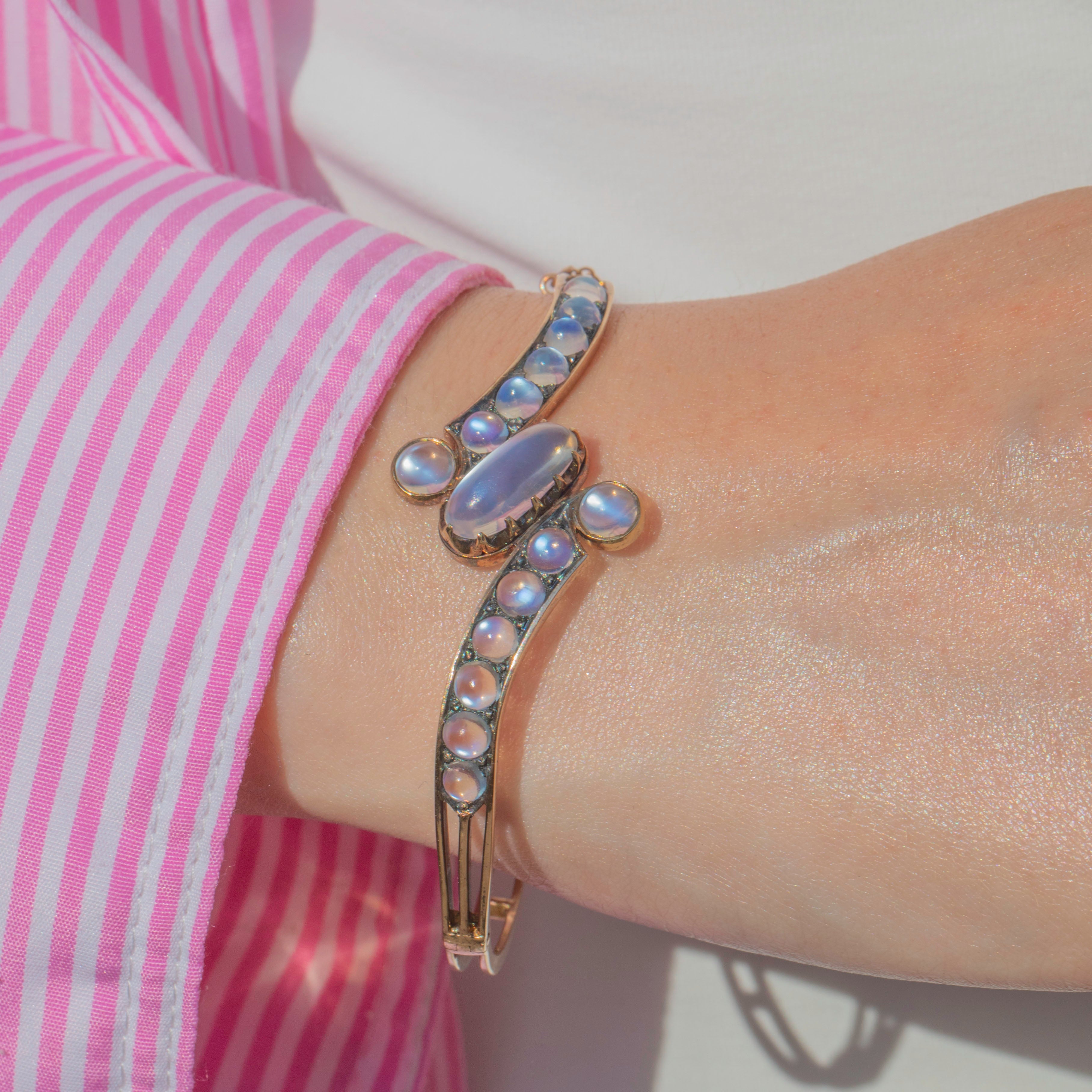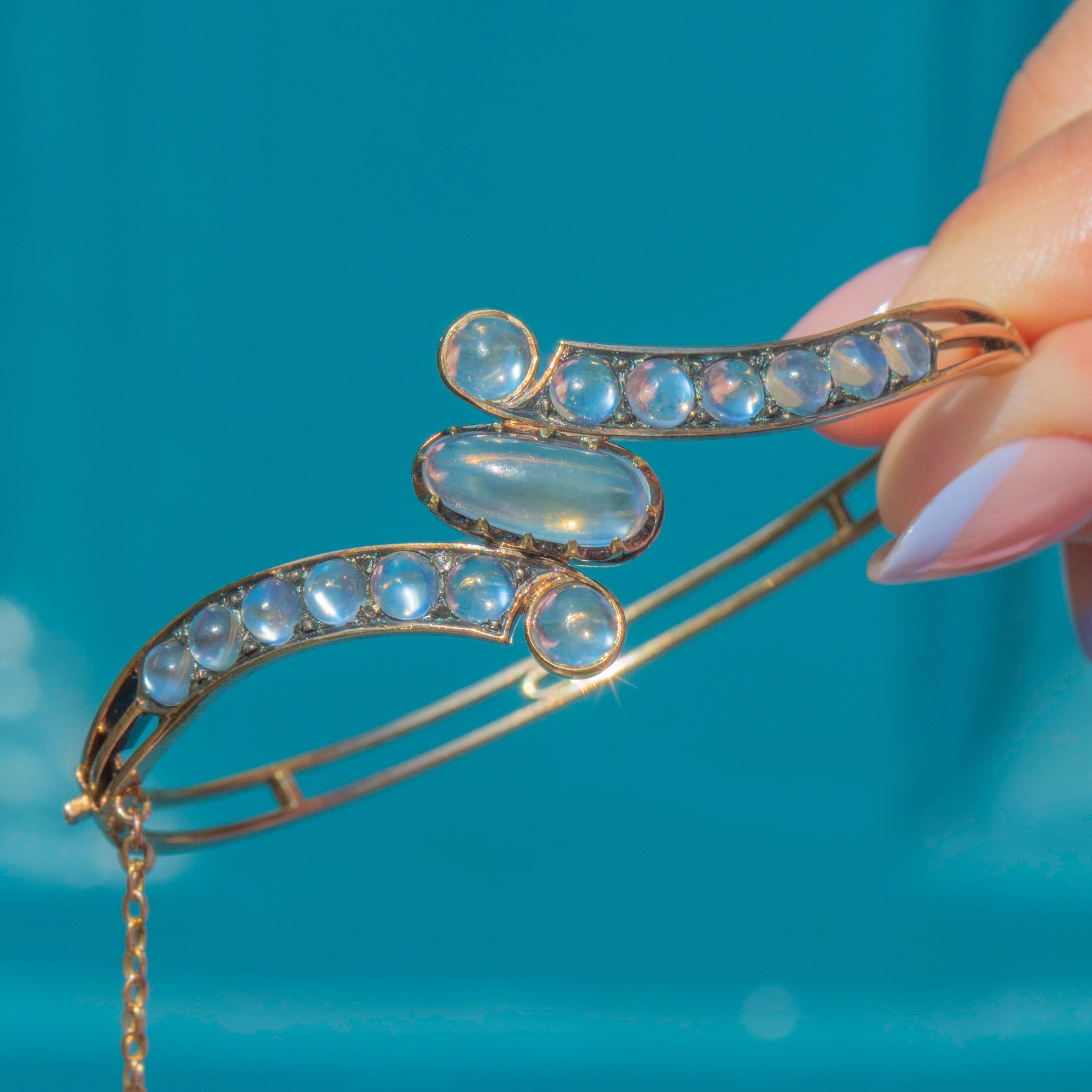 Designed in an elegant bypass style, the bangle wraps gracefully around the wrist, showcasing the Moonstones in a flowing, romantic twist. A rare and luxurious piece from the late 19th century, perfect for collectors of fine antique jewellery.