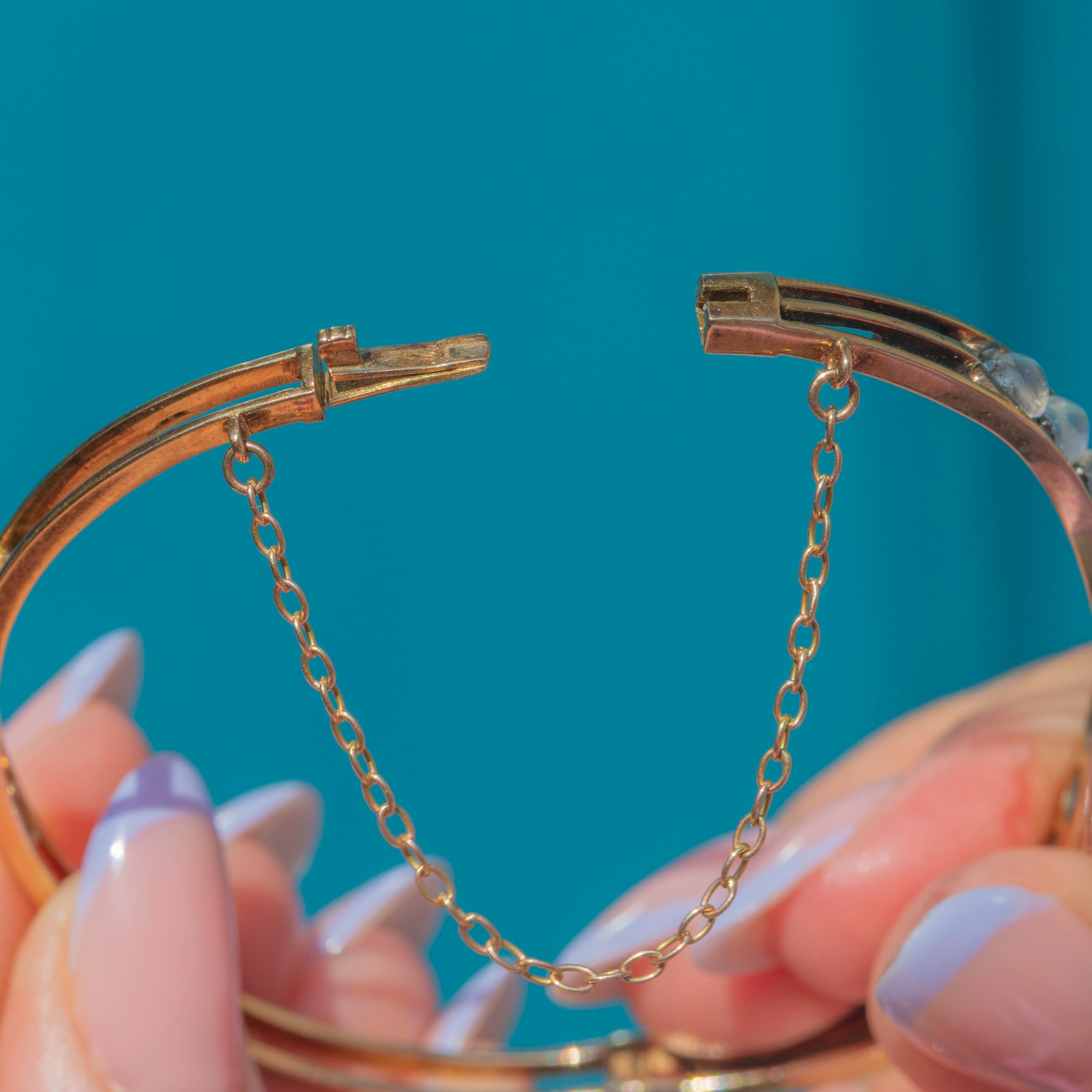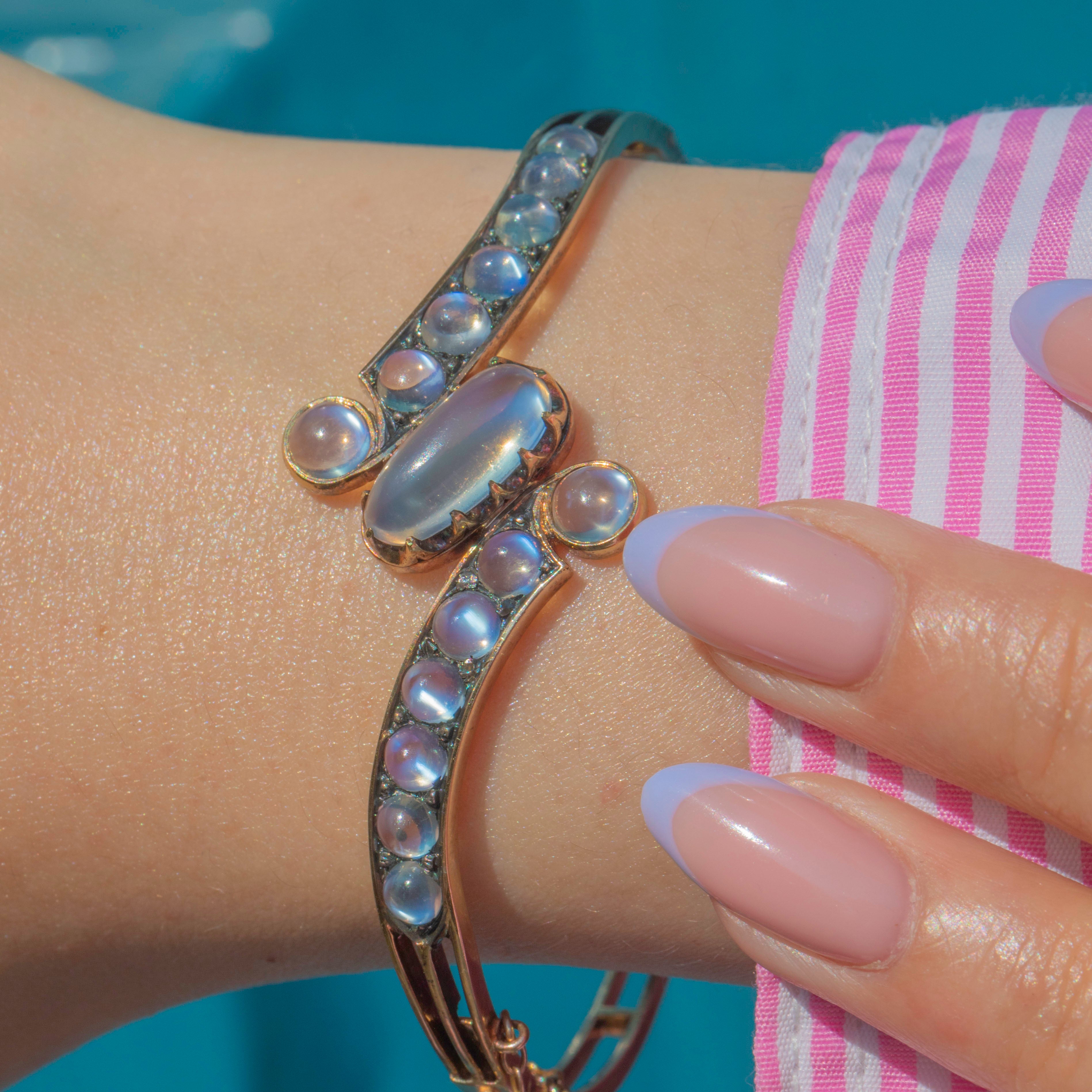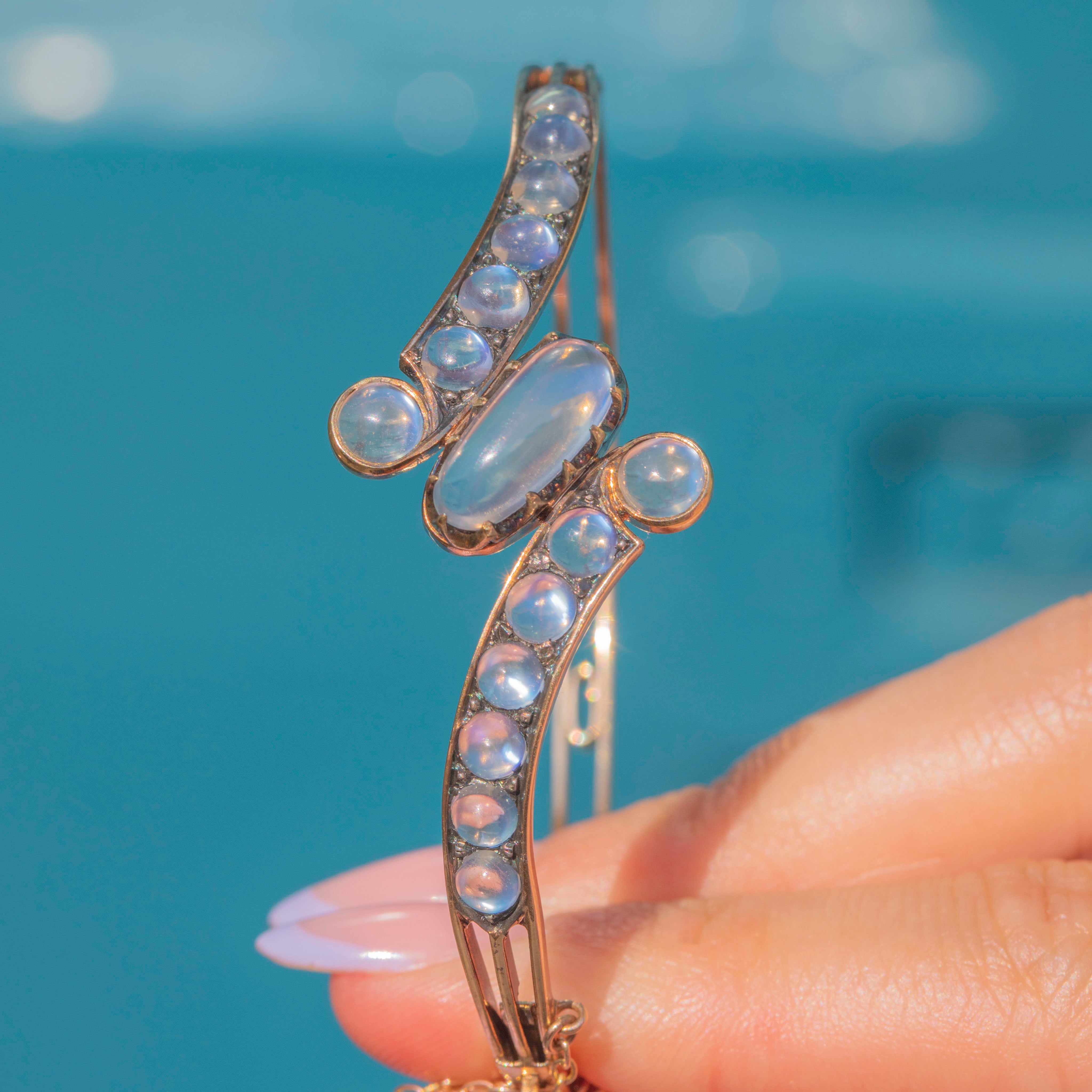 Designed in an elegant bypass style, the bangle wraps gracefully around the wrist, showcasing the Moonstones in a flowing, romantic twist. A rare and luxurious piece from the late 19th century, perfect for collectors of fine antique jewellery.