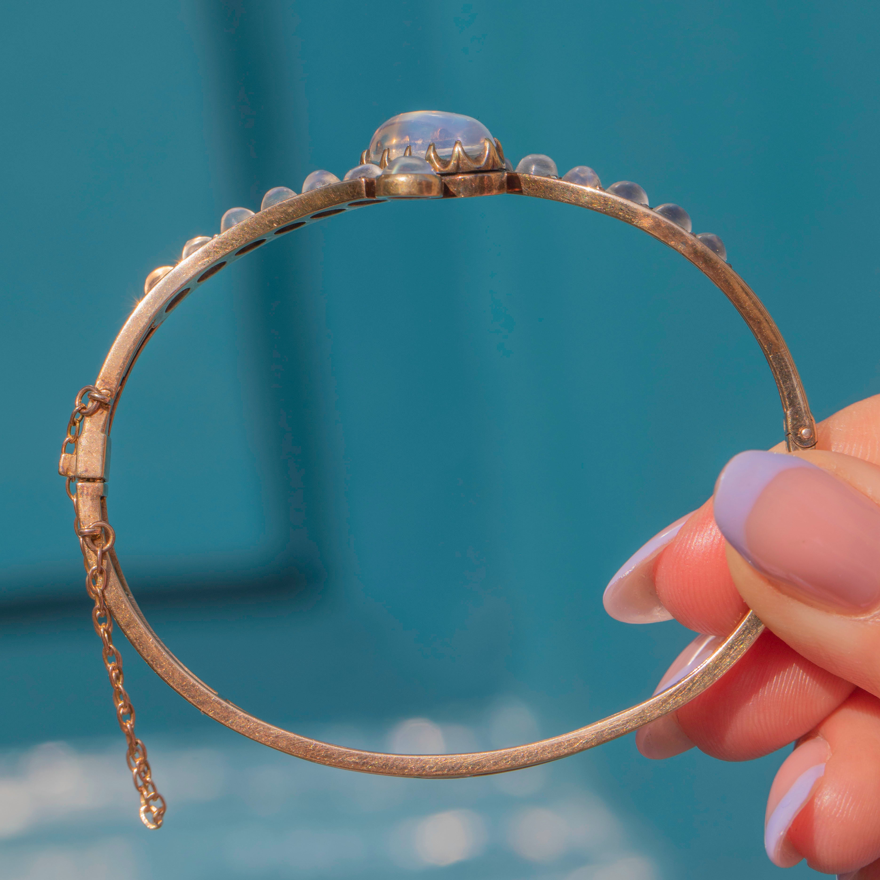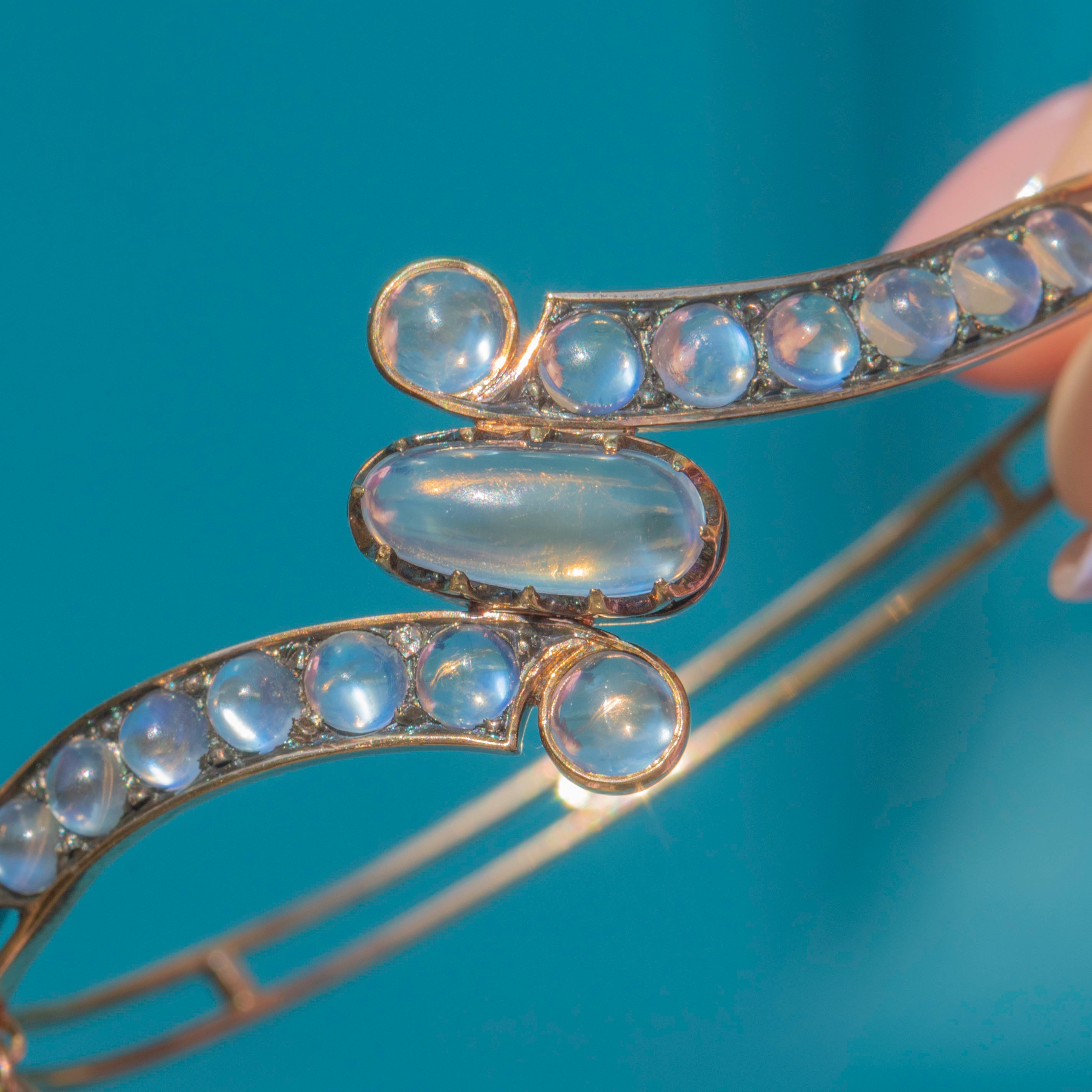This breathtaking Antique 15ct Gold Ceylon Moonstone Bypass Bangle is crafted in 15ct Gold and adorned with fifteen graduating Ceylon moonstones, each one glowing with the soft, ethereal shimmer that makes these piece so sought after